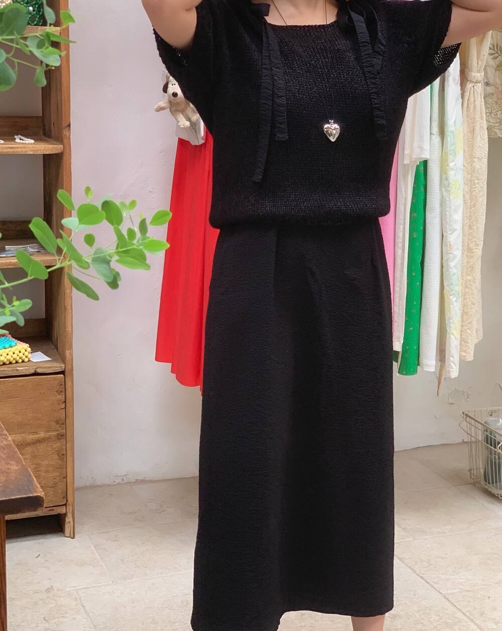봉긋한 소매에는 짜임으로 포인트를 주어