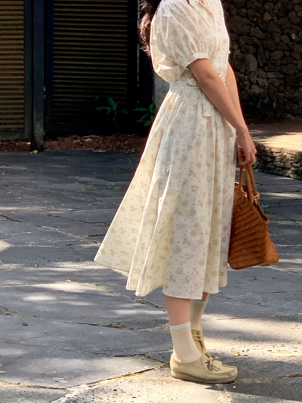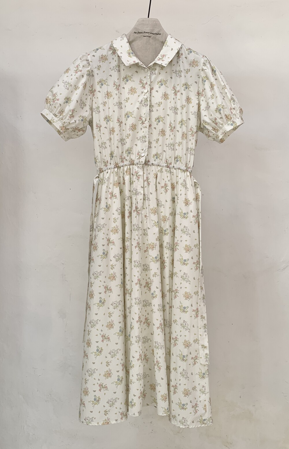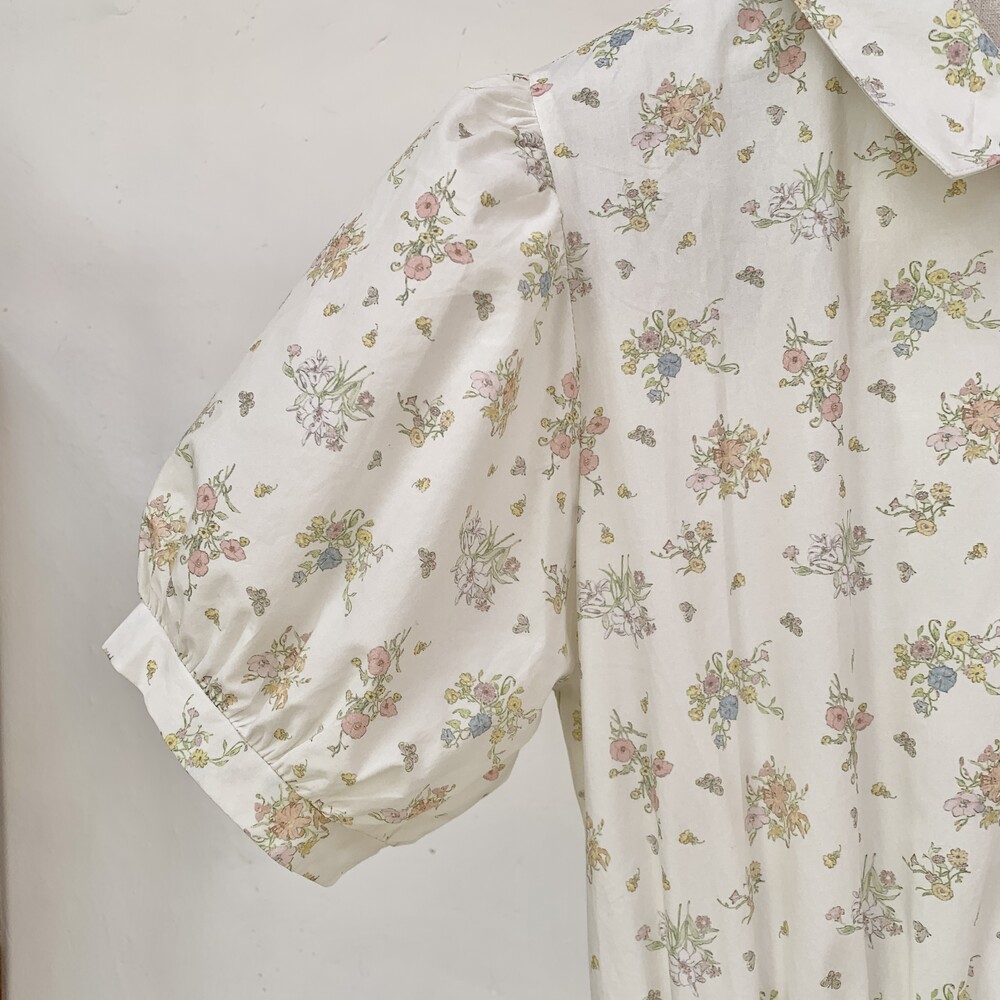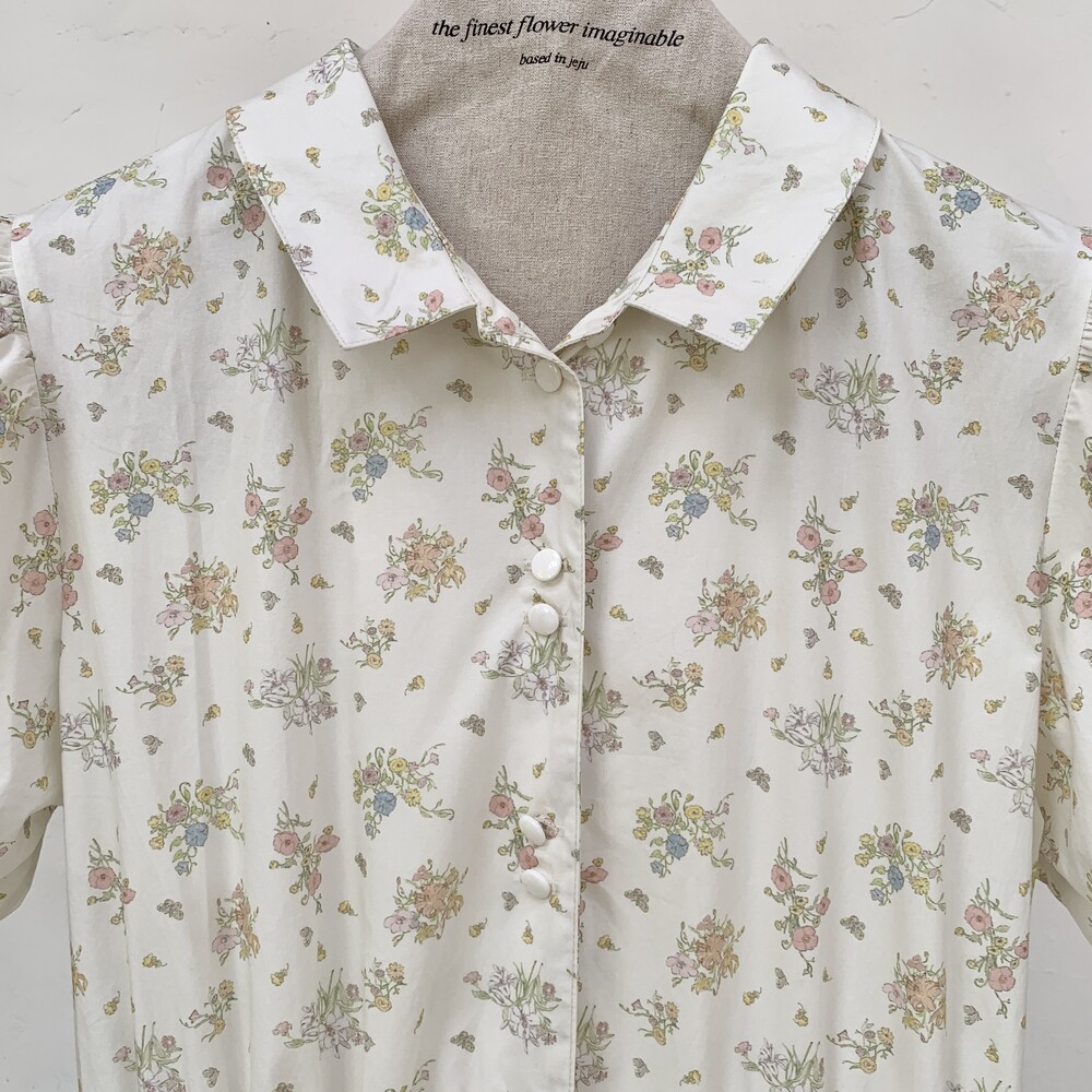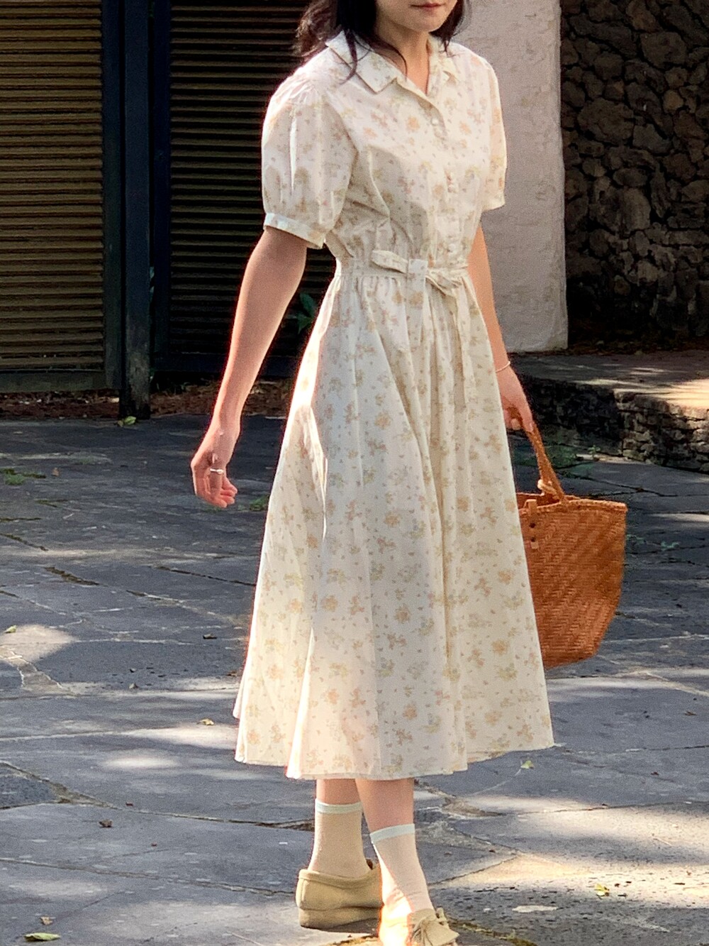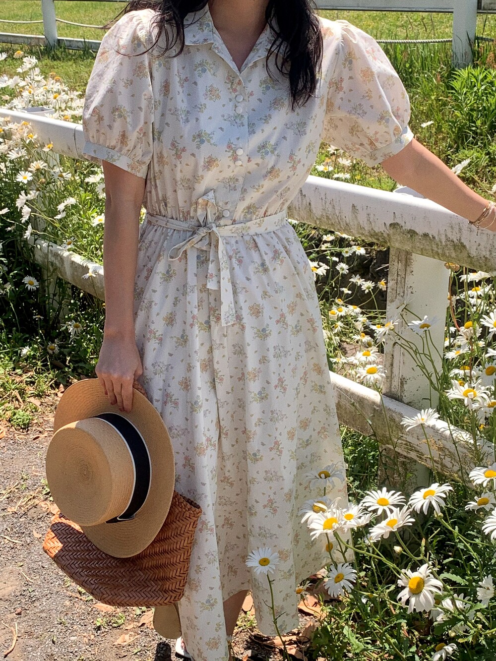 작은 셔츠 카라와 퍼프소매, 플레어 스커트까지
