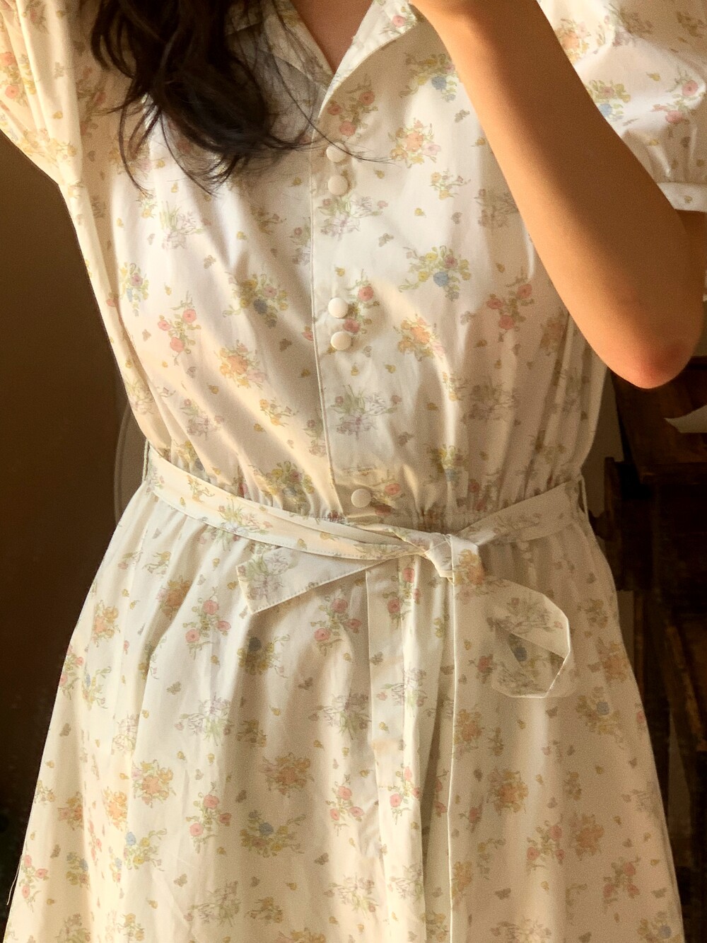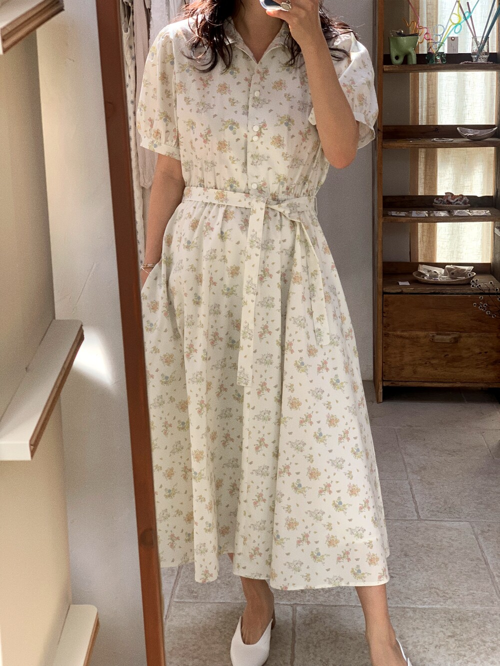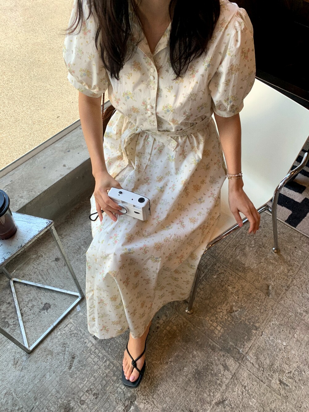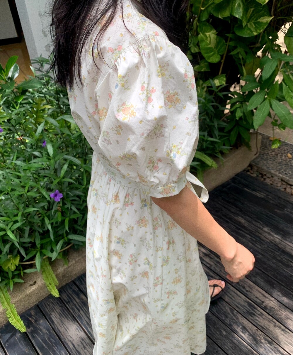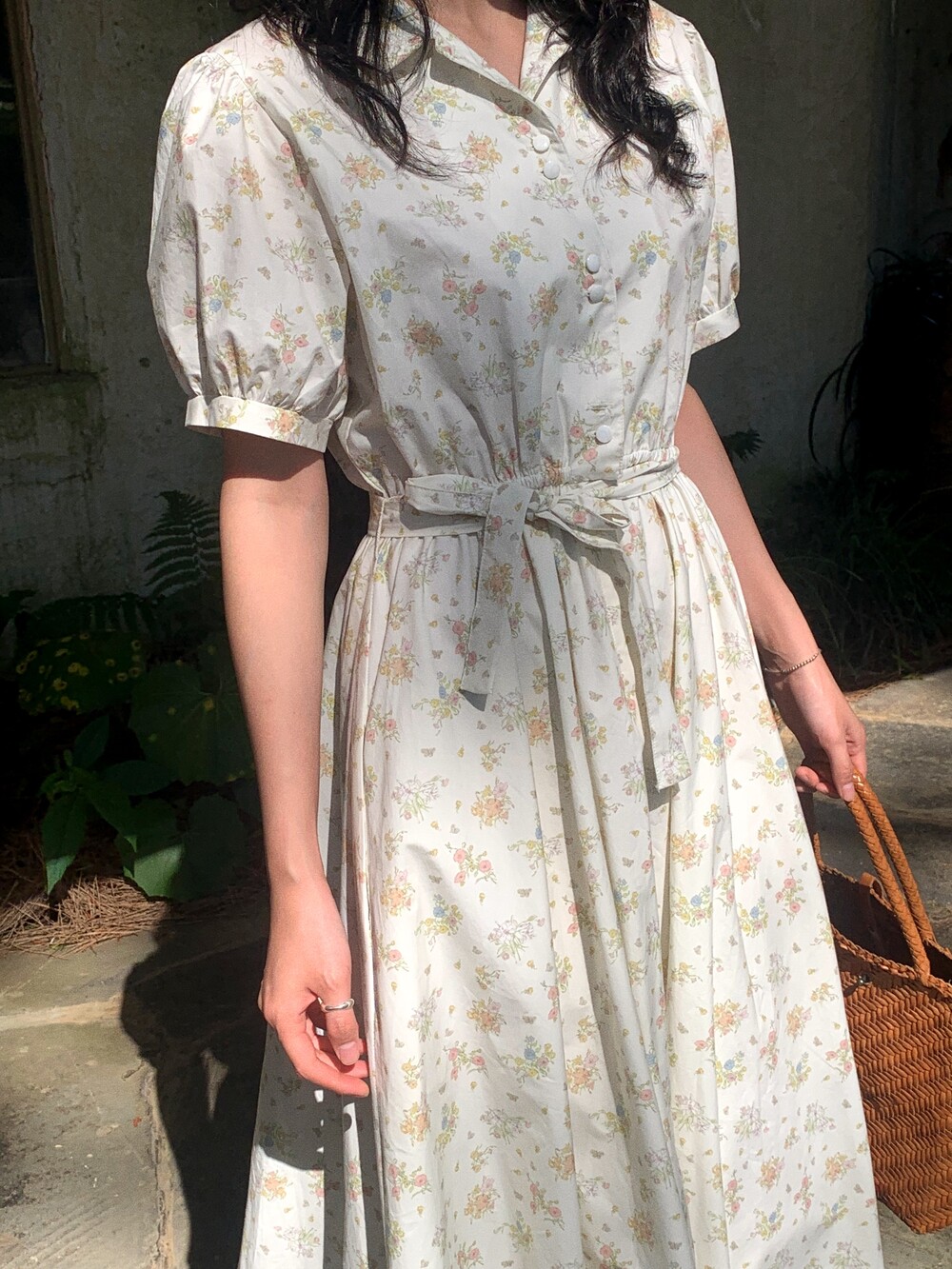 작은 셔츠 카라와 퍼프소매, 플레어 스커트까지