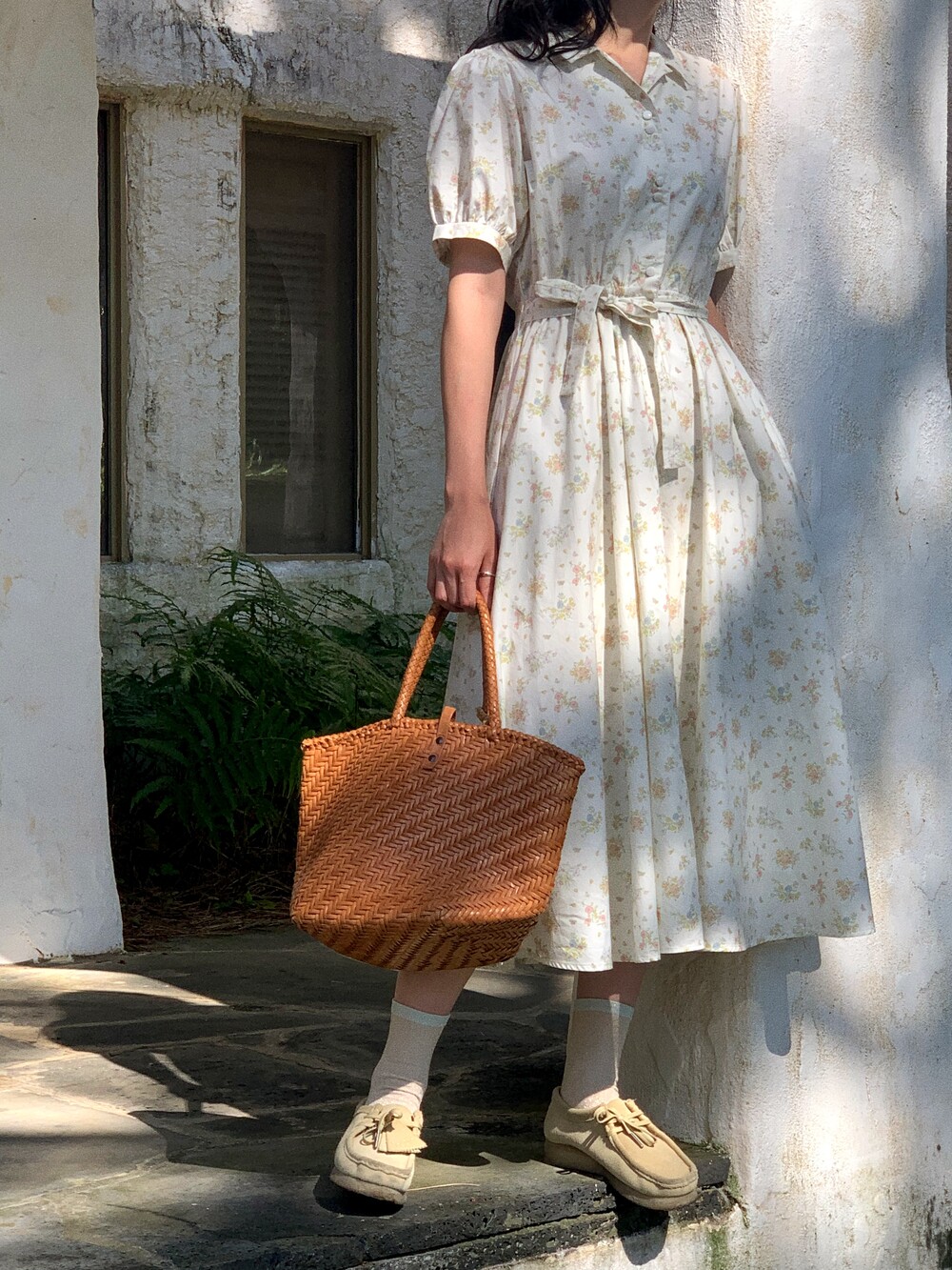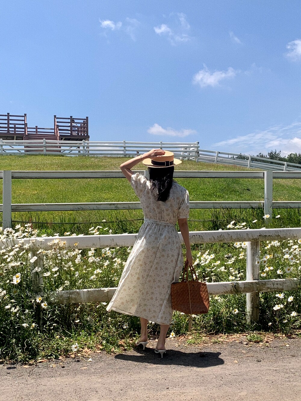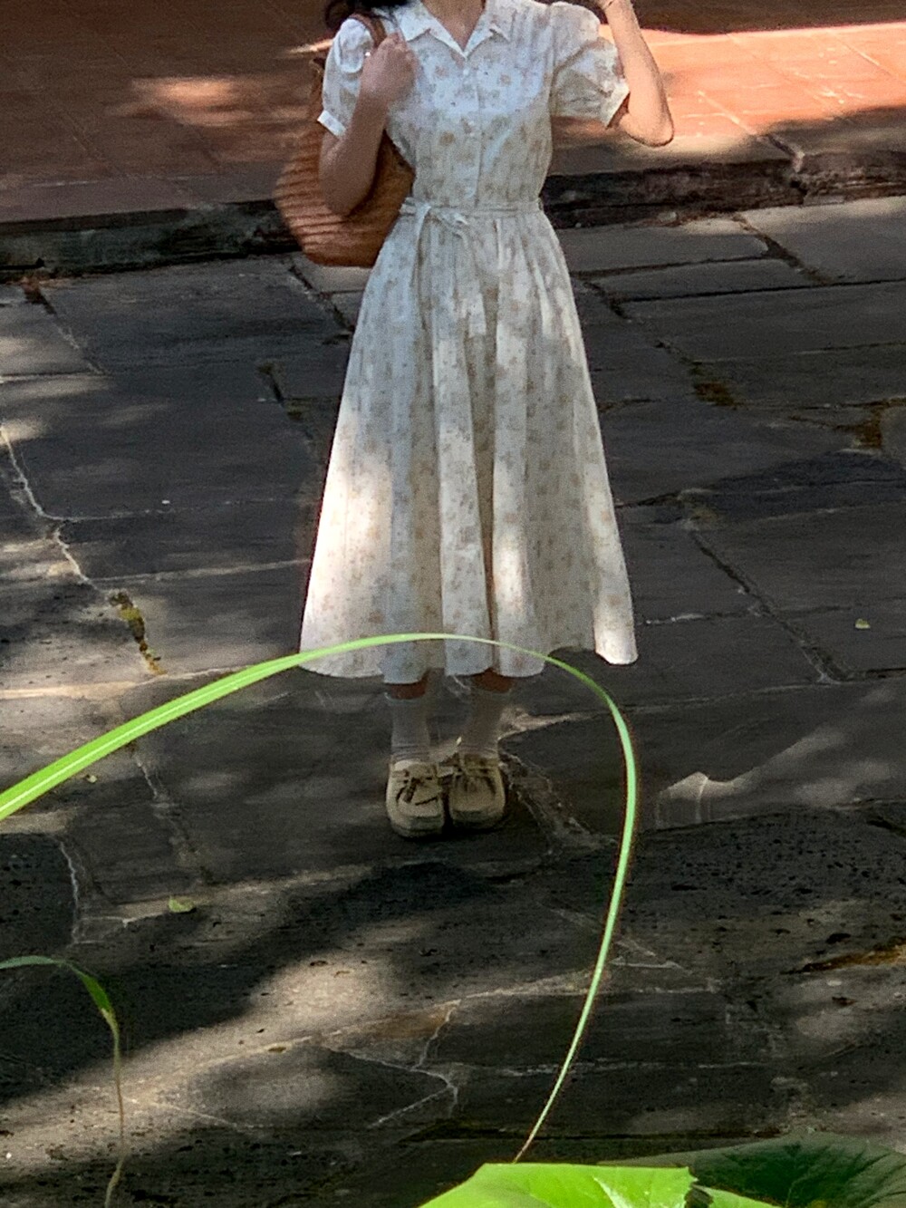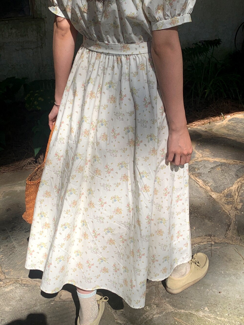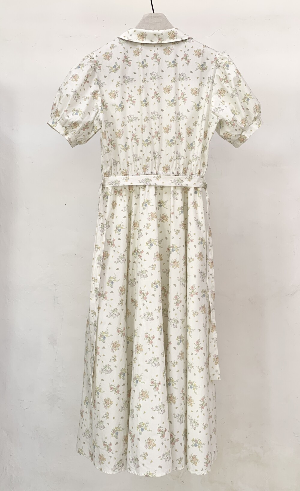 작은 셔츠 카라와 퍼프소매, 플레어 스커트까지