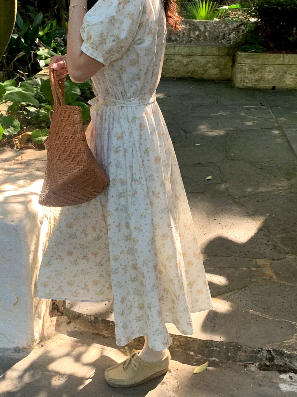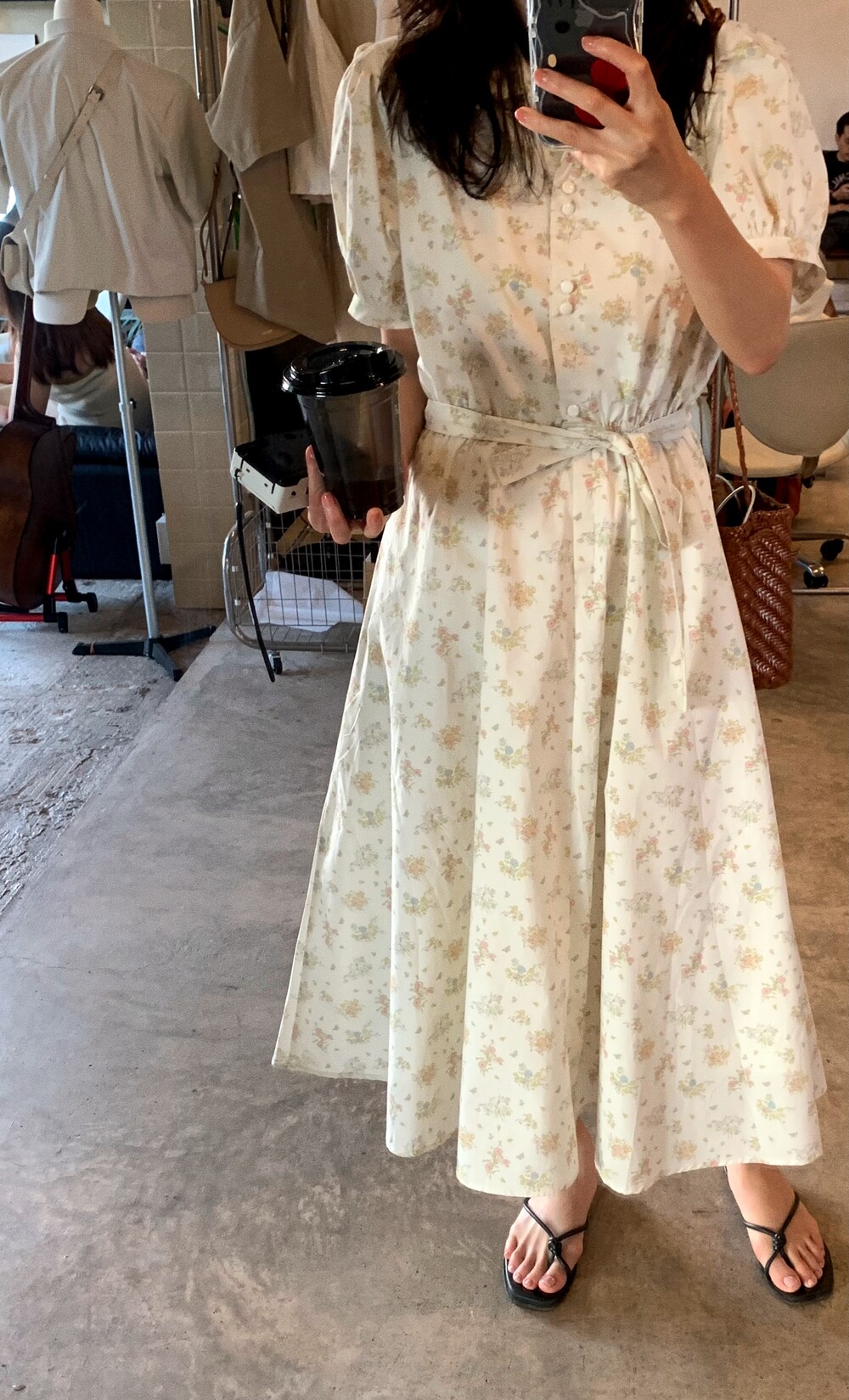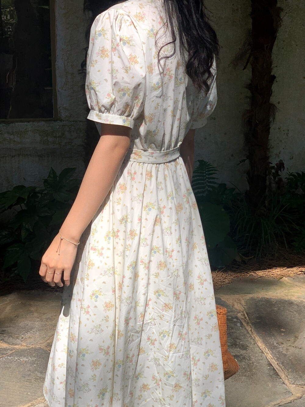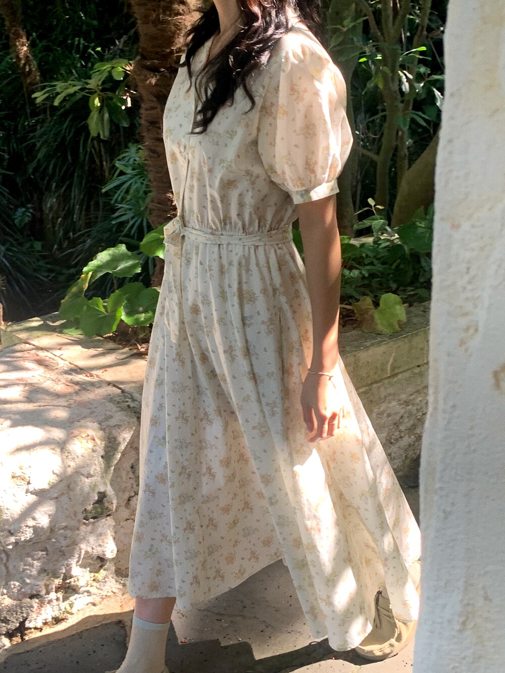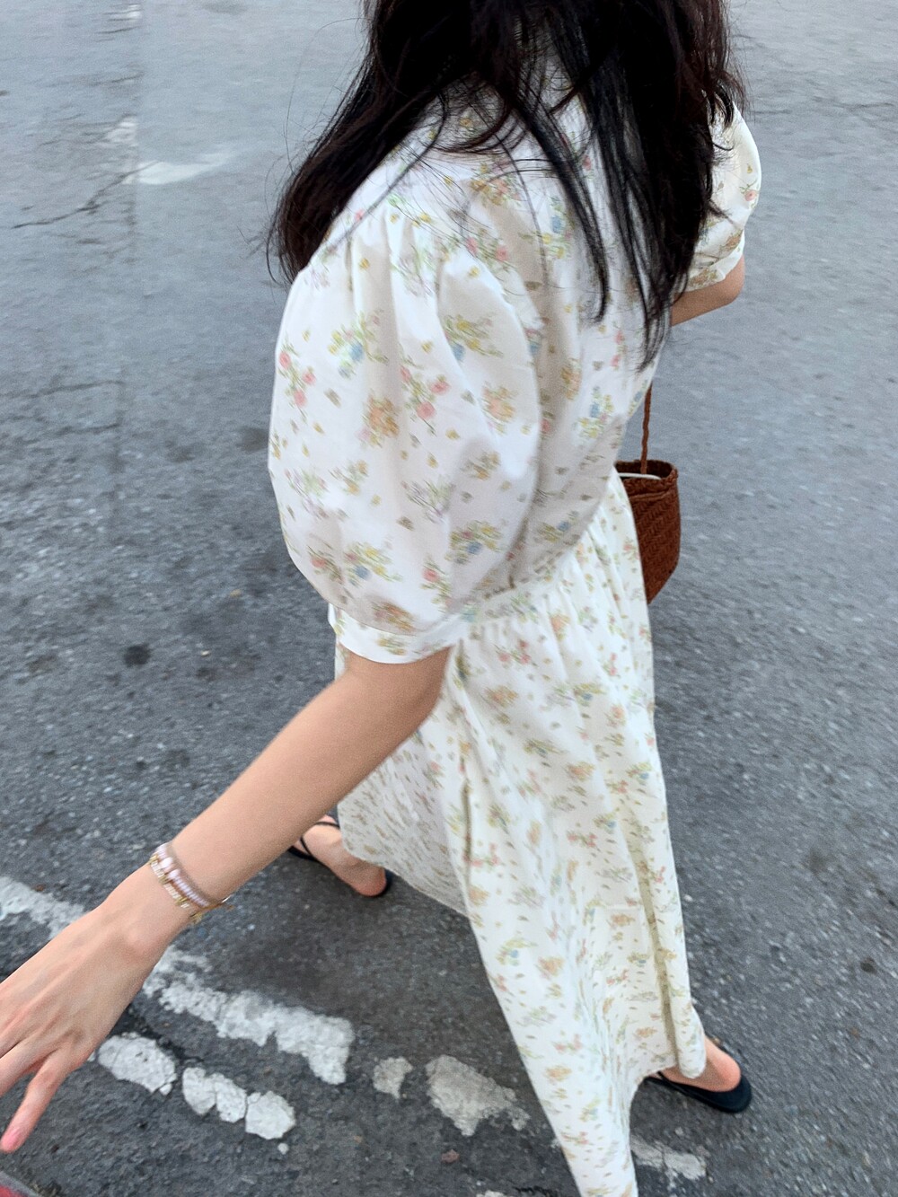 작은 셔츠 카라와 퍼프소매, 플레어 스커트까지