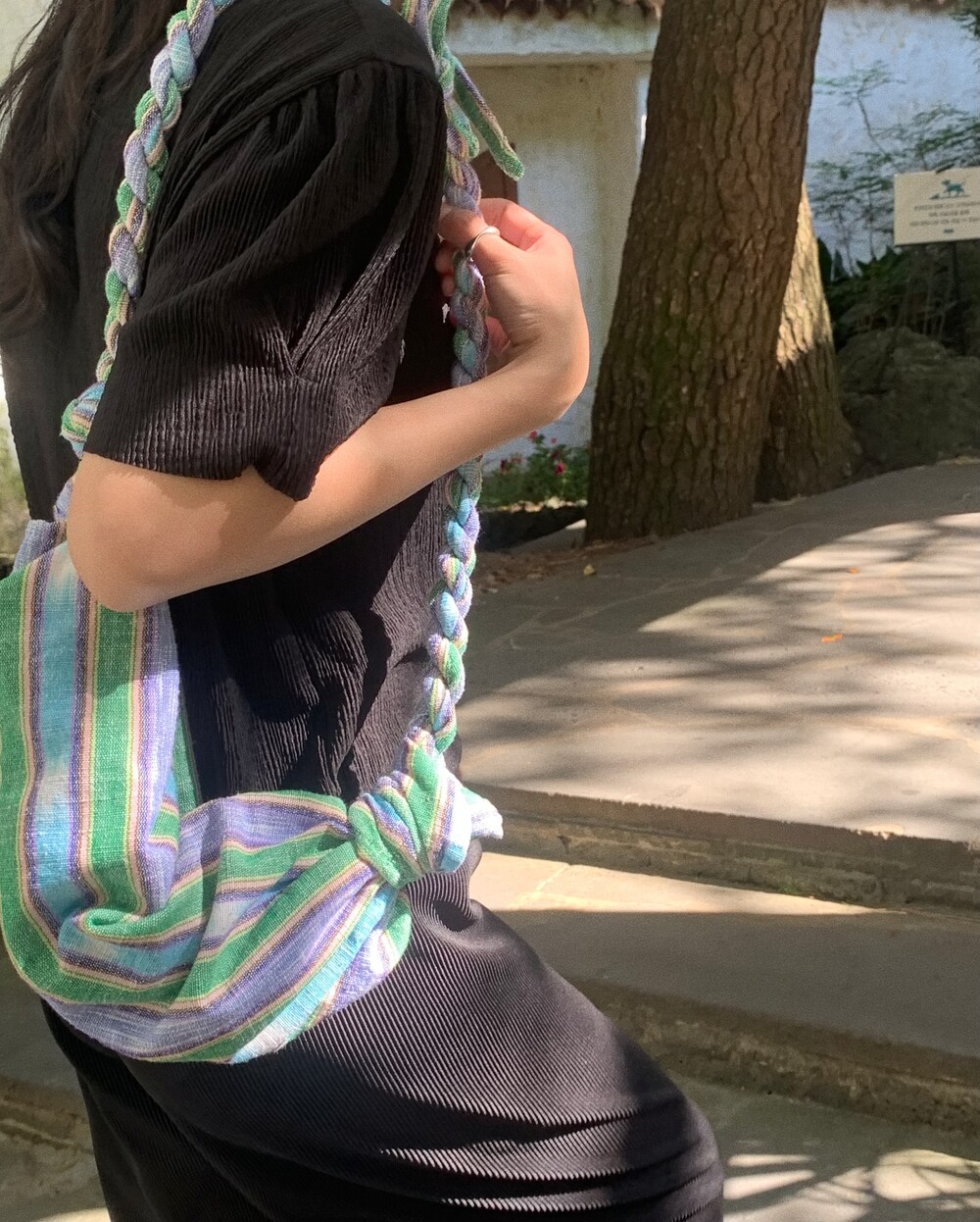 둥글린 스퀘어 네크라인은 같은 원단 바이어스로 단정하게 마무리했습니다
