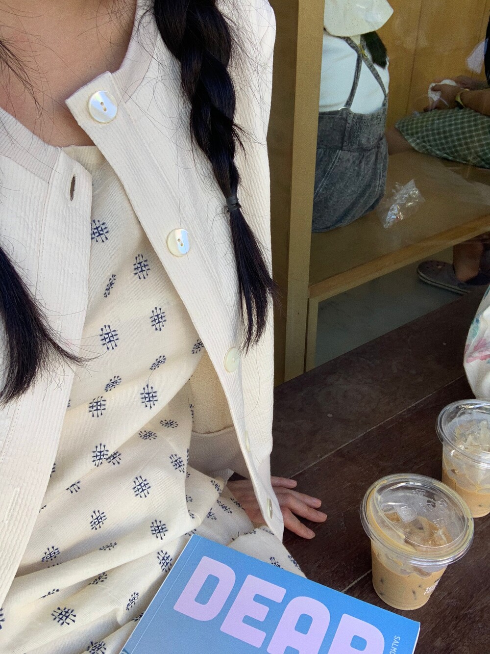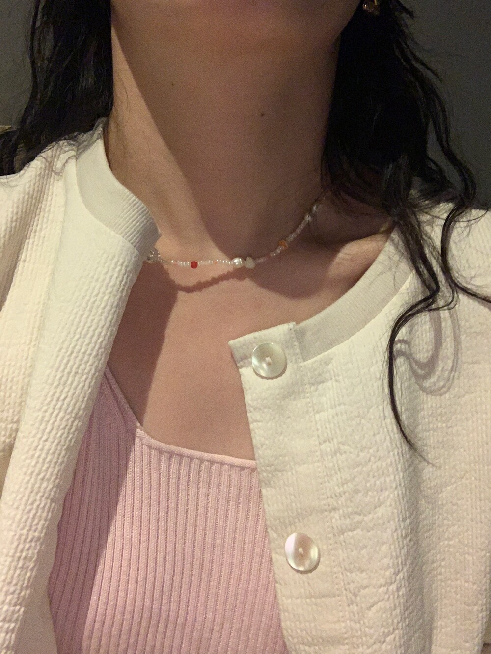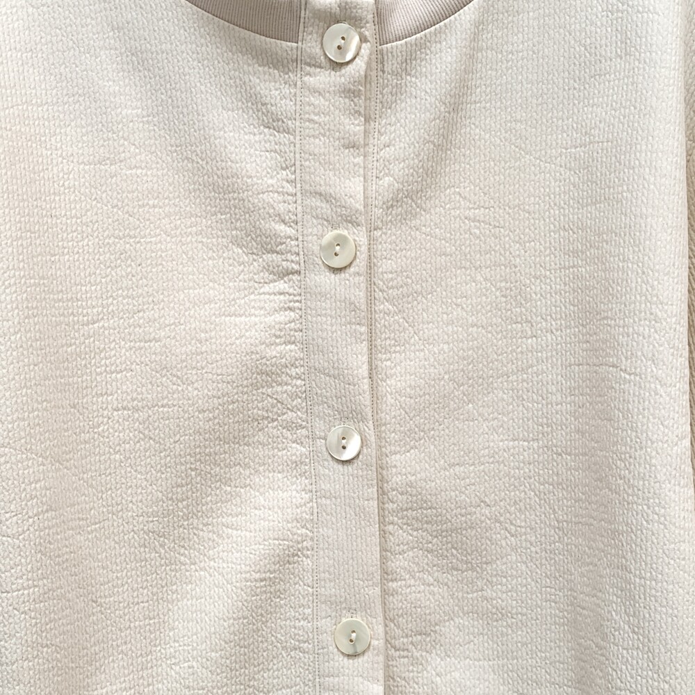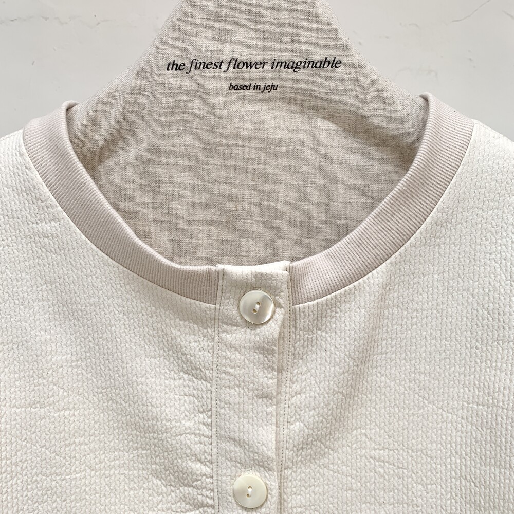 라운드 네크라인을 따라 5개의 자개버튼이 있어 편하게 입고 벗을 수 있습니다