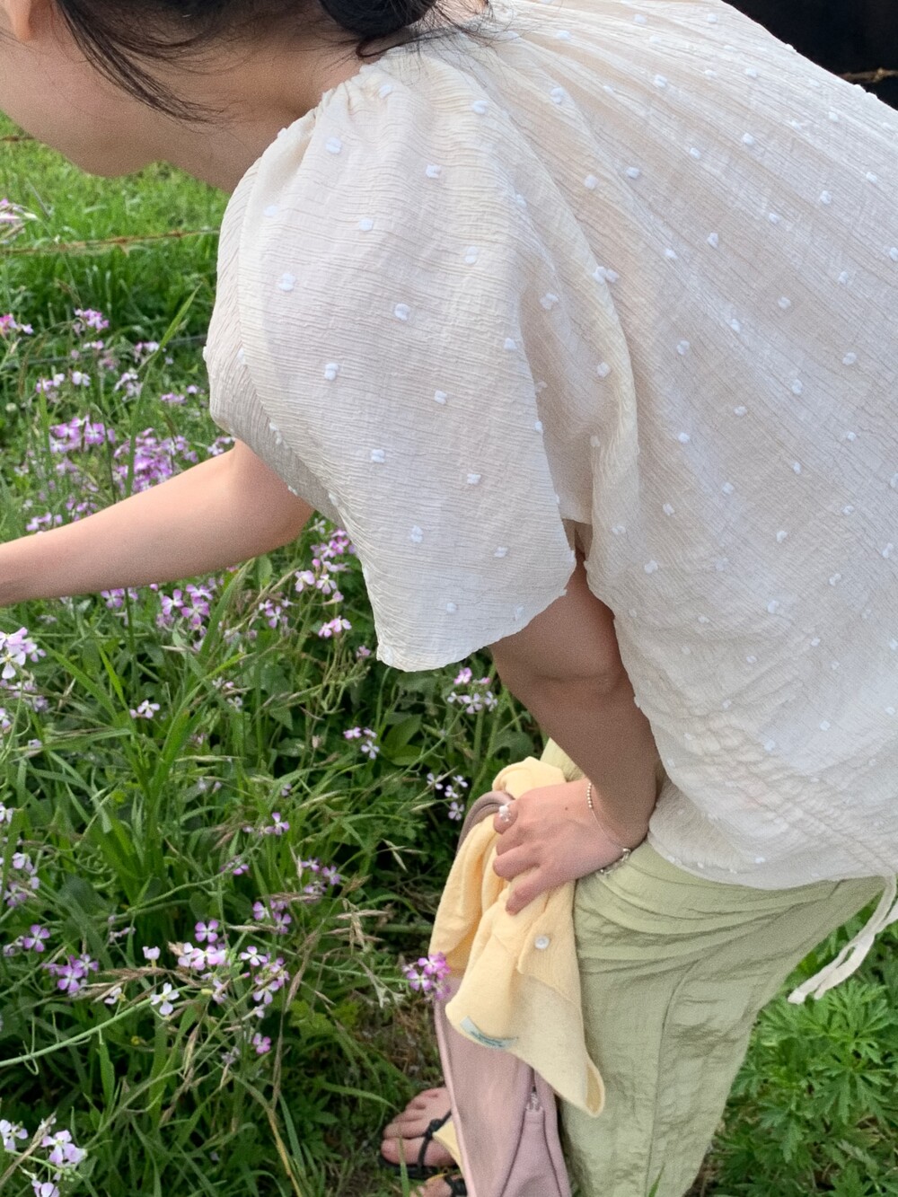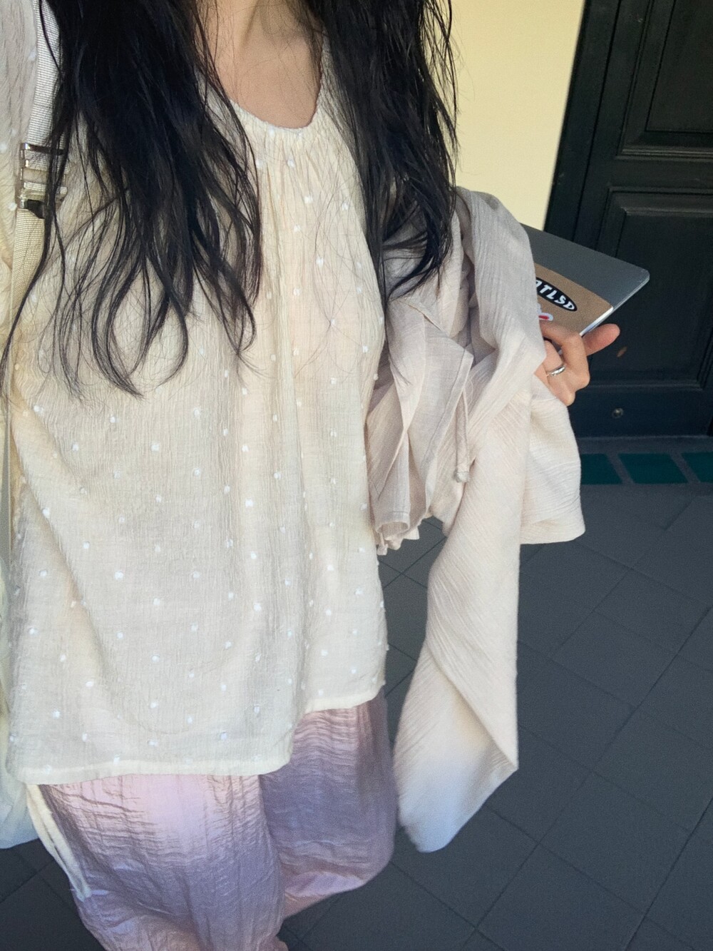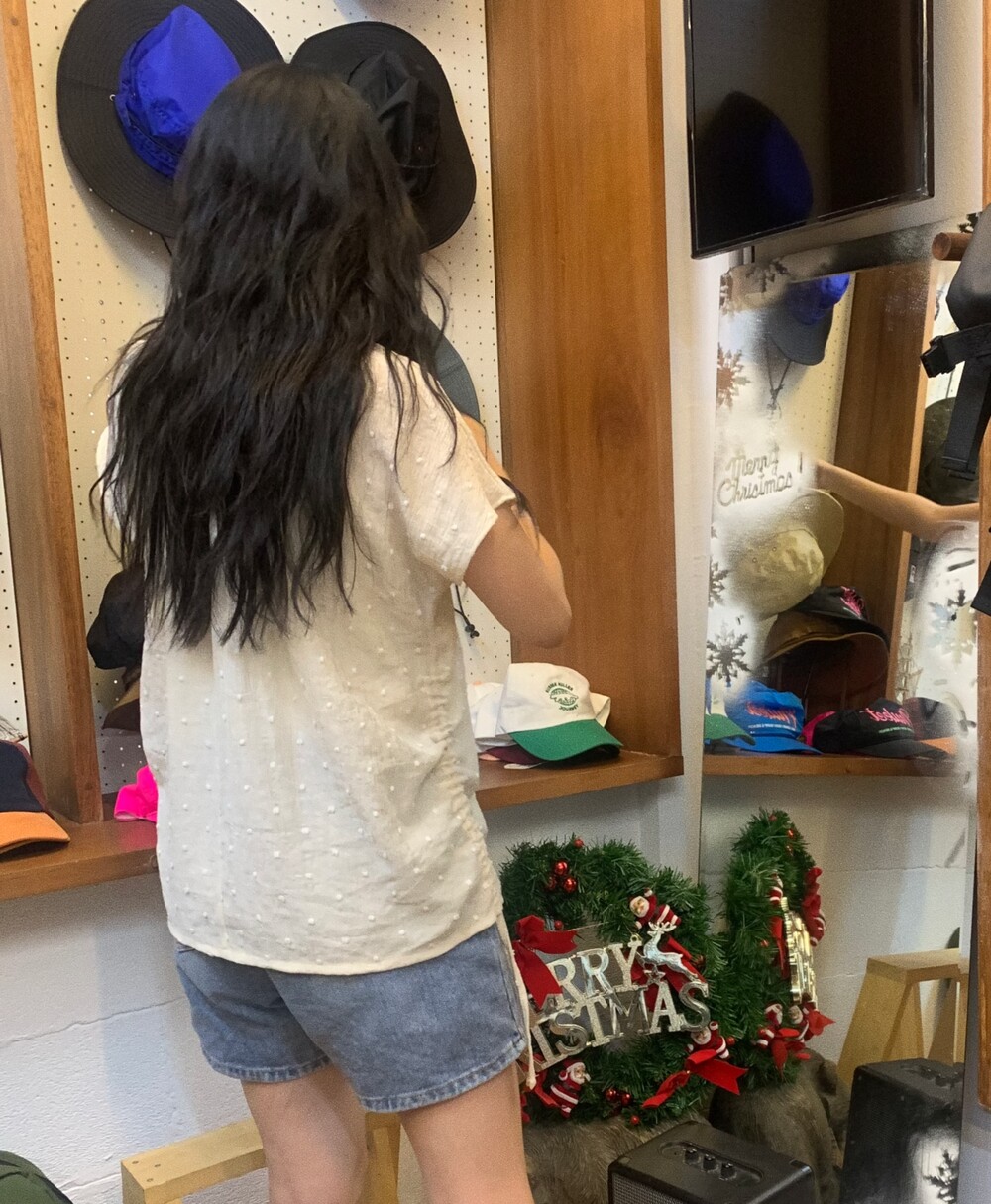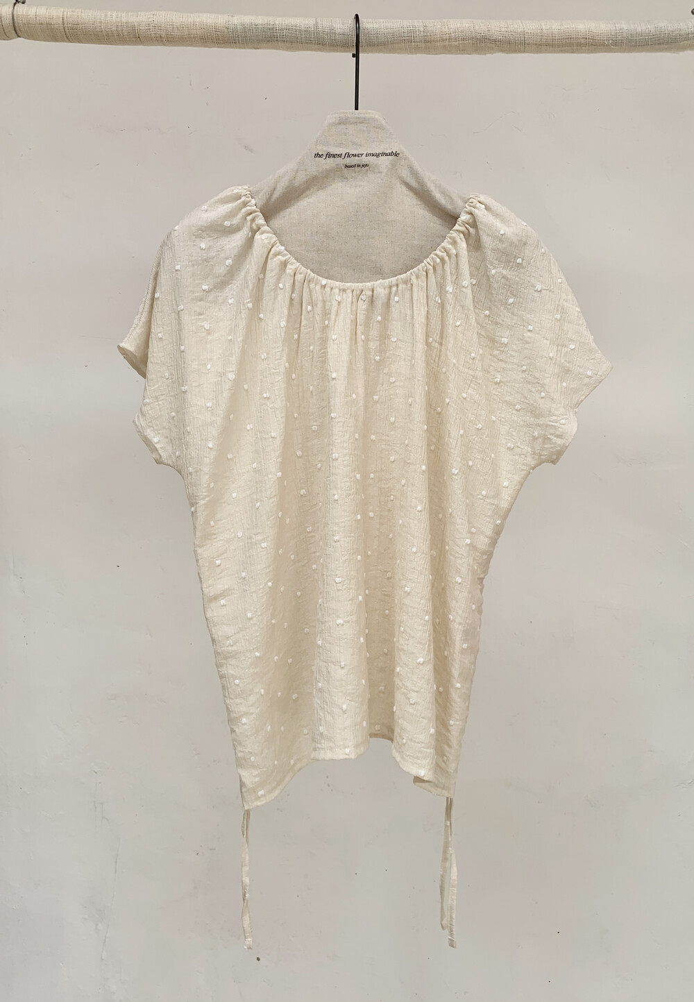 가볍고 얇은 링클 소재에 눈송이처럼 귀여운 도트 패턴이 입체적으로 올라가 있어요