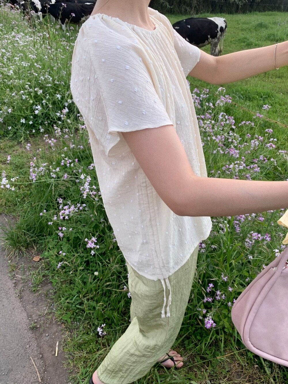 둥근 네크라인은 전체 밴딩으로 잔잔하게 셔링이 잡혀요