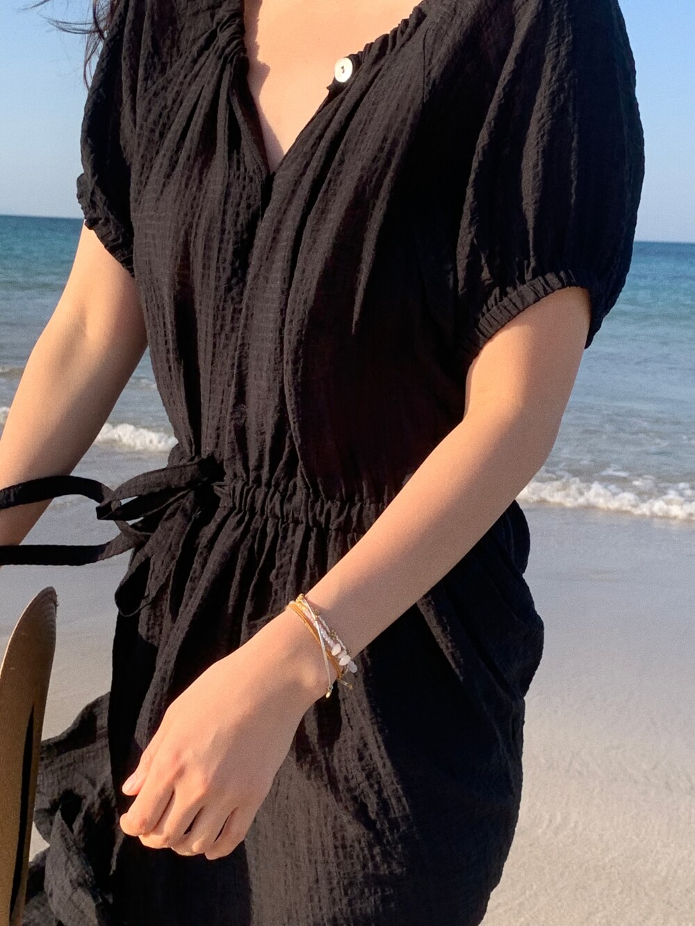 네크라인, 소매 끝, 허리 부분에 밴딩을 넣어 자연스럽게 셔링이 잡혀요