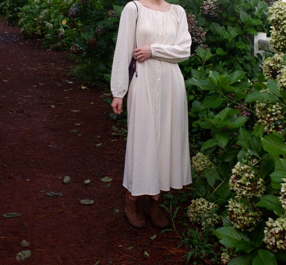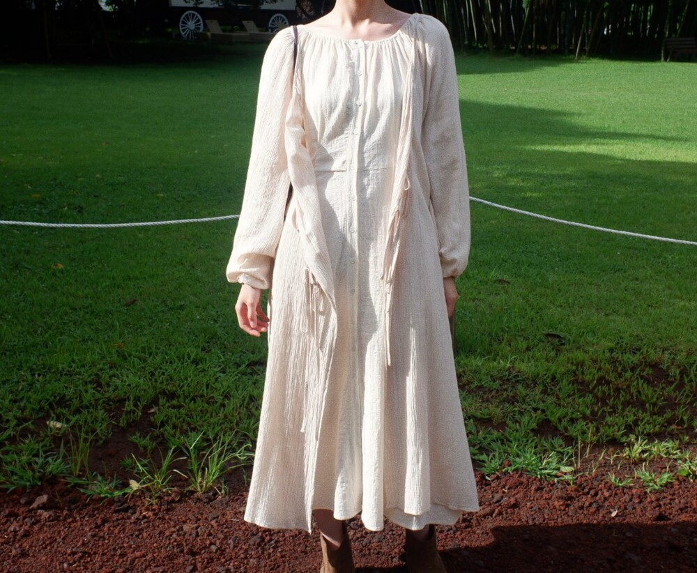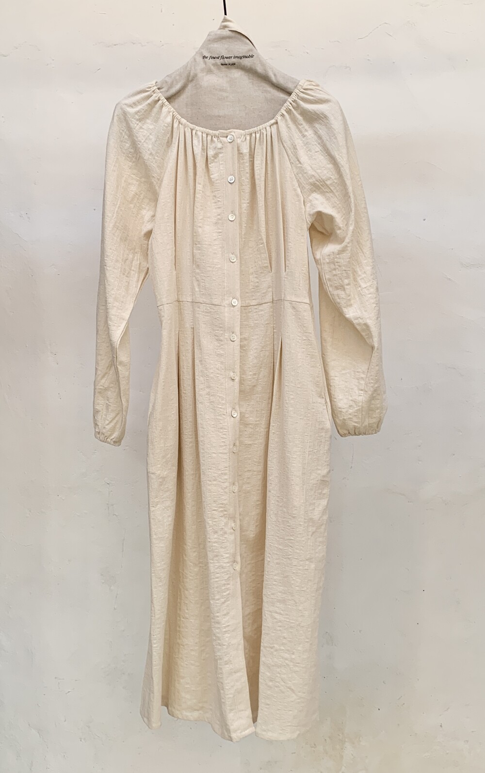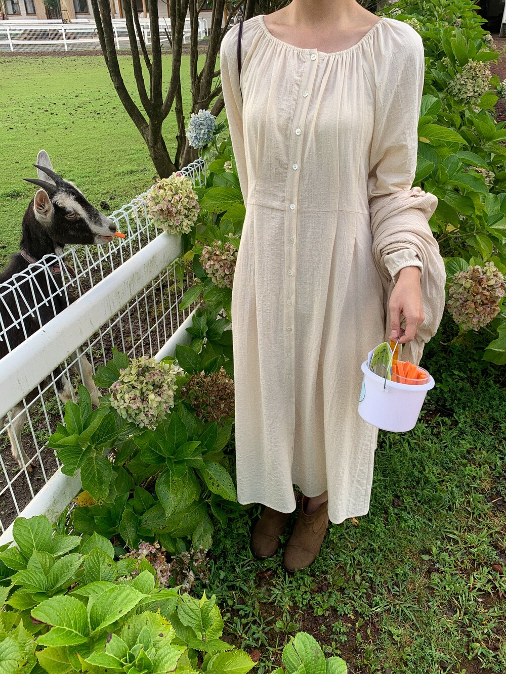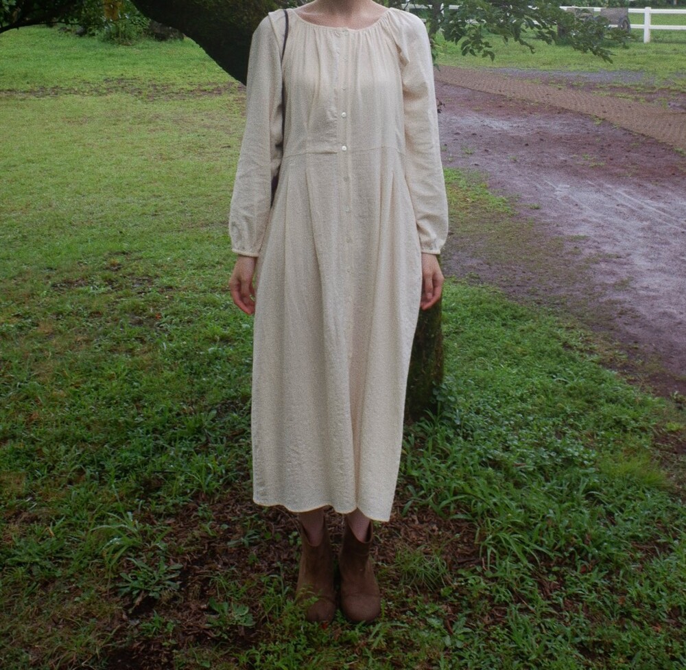 허리는 턱 디테일로 라인을 잡았고 스커트가 자연스럽게 퍼져 예쁜 실루엣을 만들어줍니다