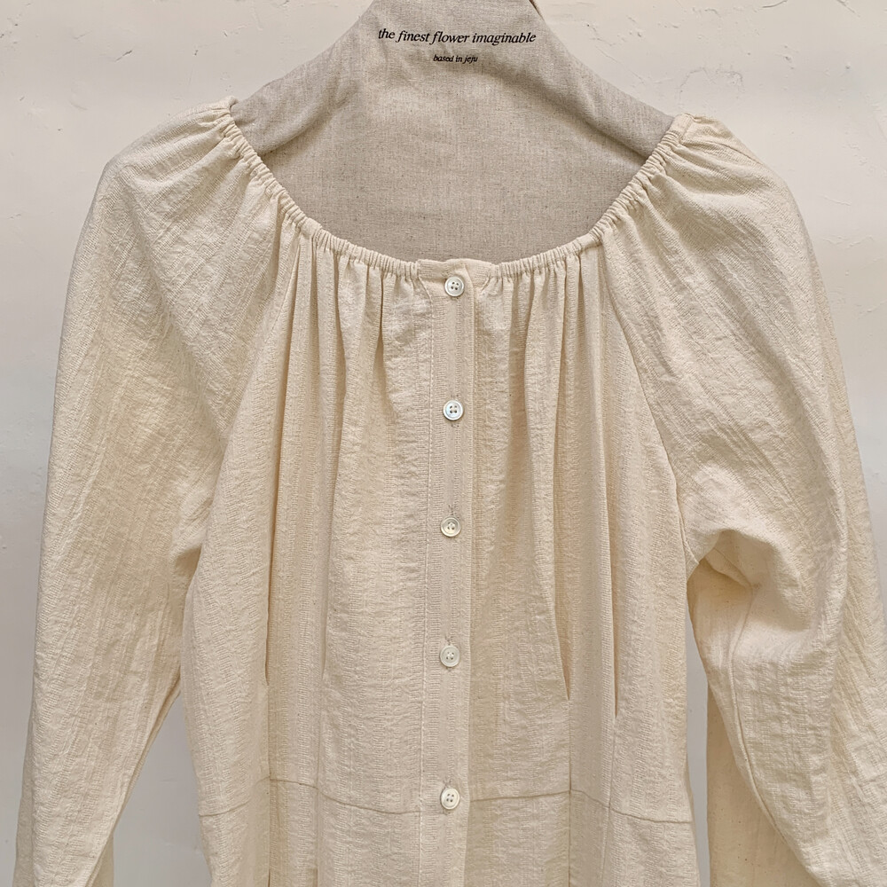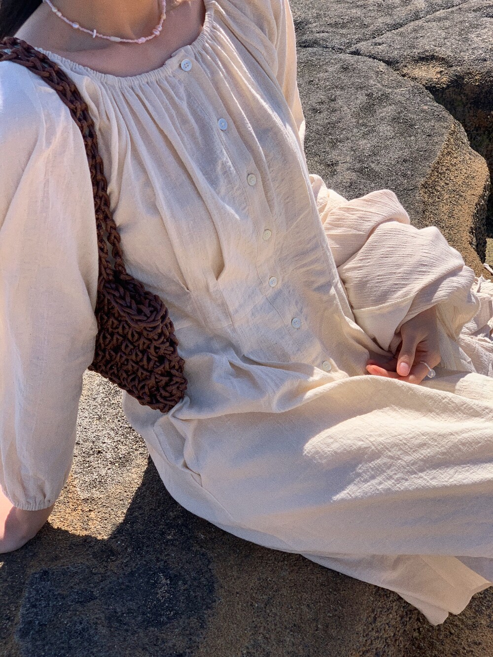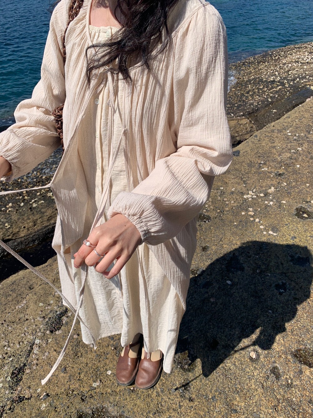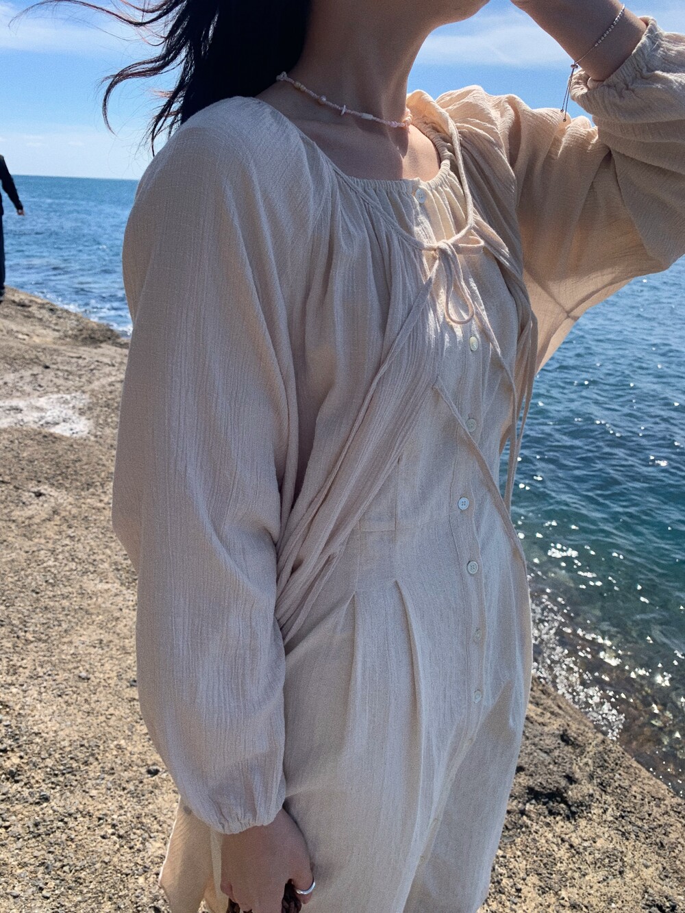 네크라인과 슬리브 끝부분은 얇은 폭의 밴드를 넣어 잔잔하게 셔링이 잡혀요