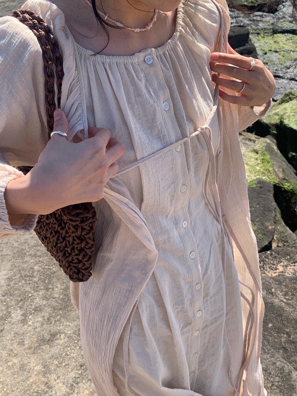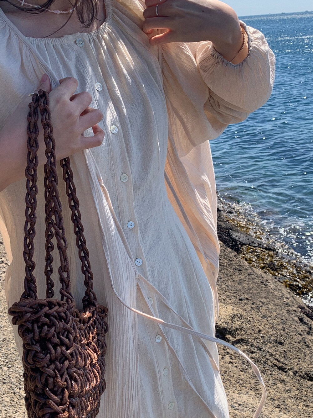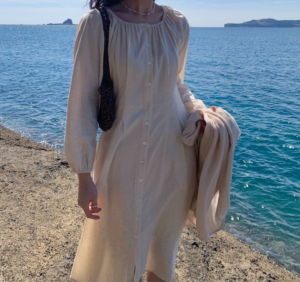 깊지 않은 스퀘어 네크라인으로 쇄골과 목선이 드러나 가녀린 느낌이 들어요