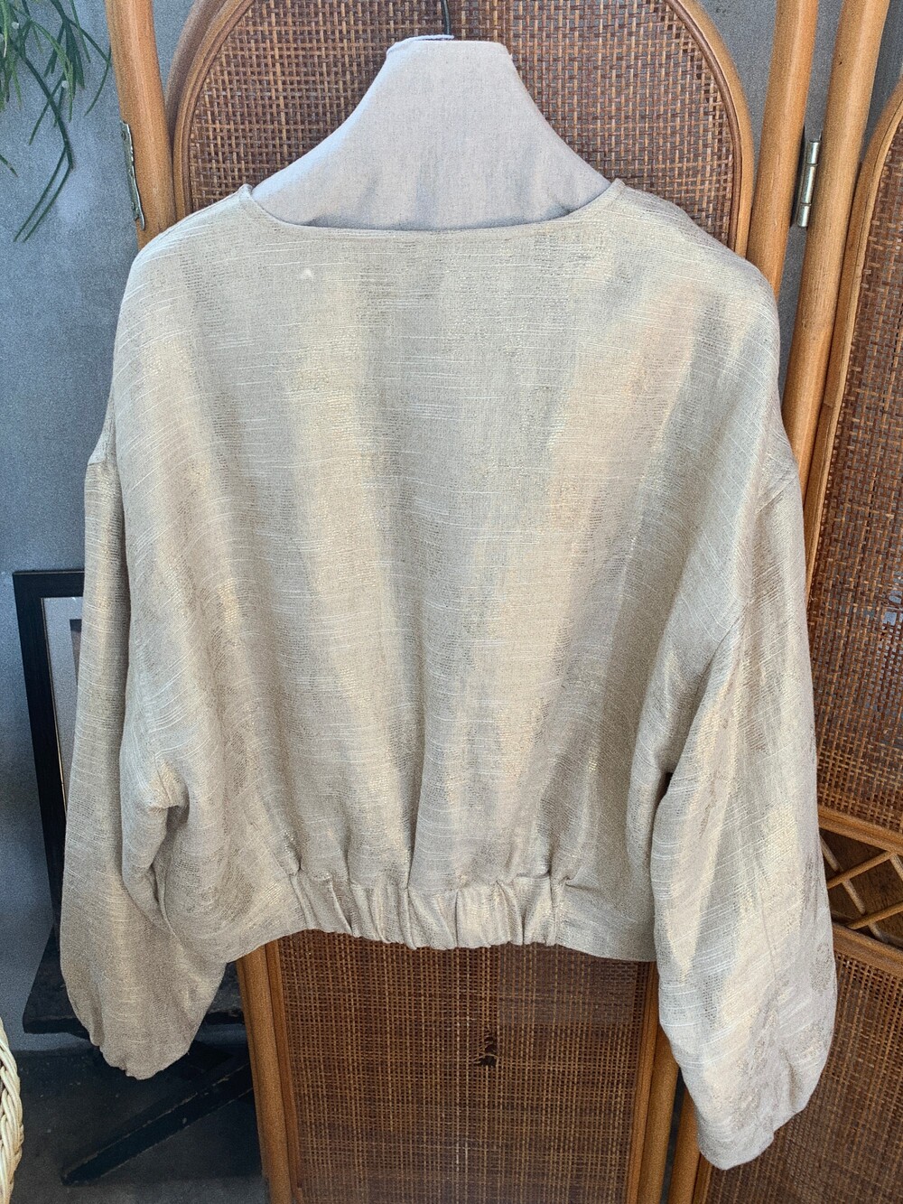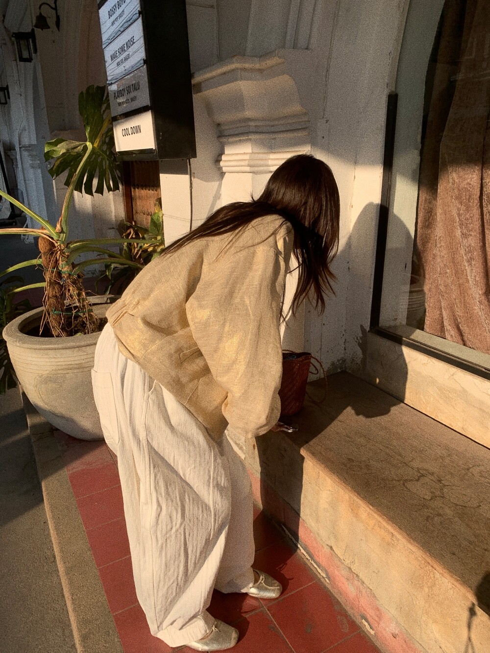 소매는 볼륨감을 살려 여유 있게 떨어지고, 손목 부분은 가볍게 셔링을 잡아