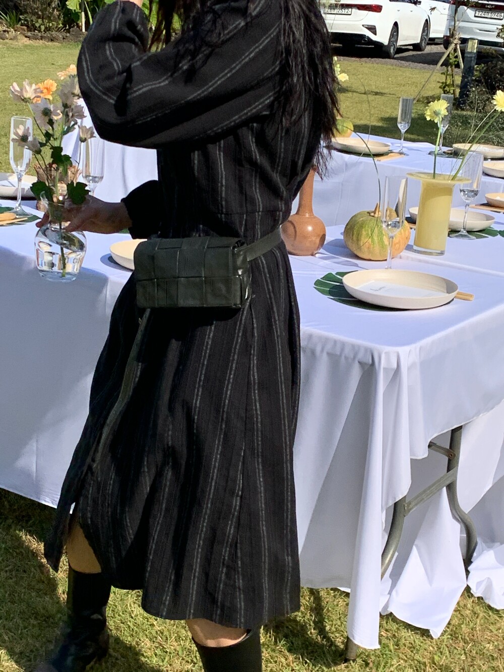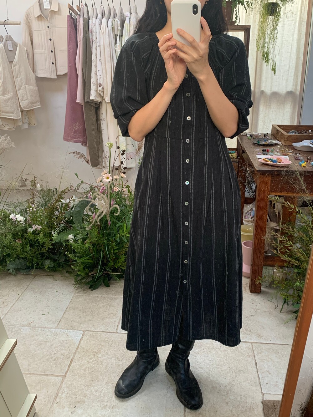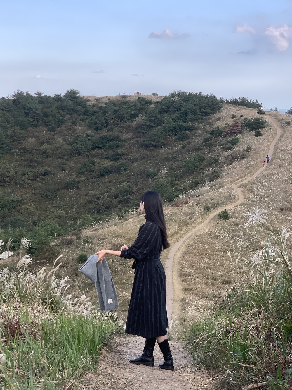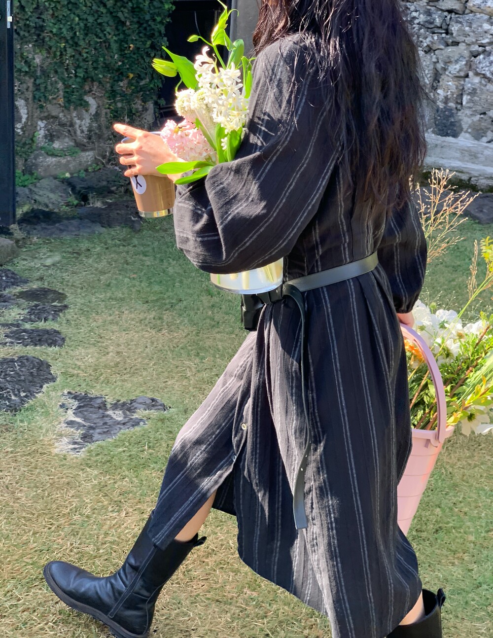 무릎 아래로 내려오는 길이감으로 부츠와 함께 페미닌한 무드로 입어도 좋고,
