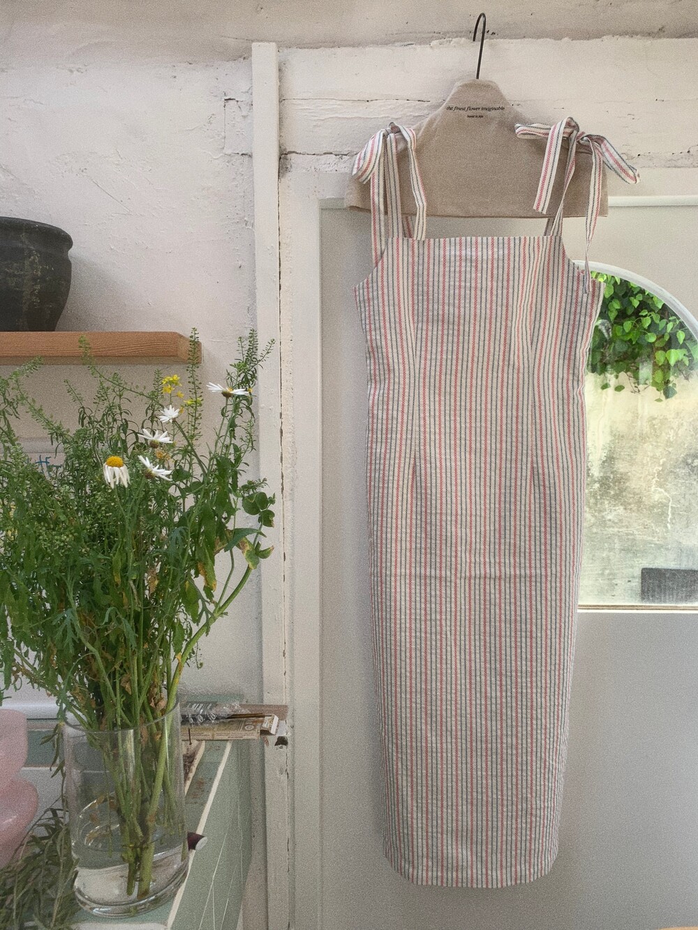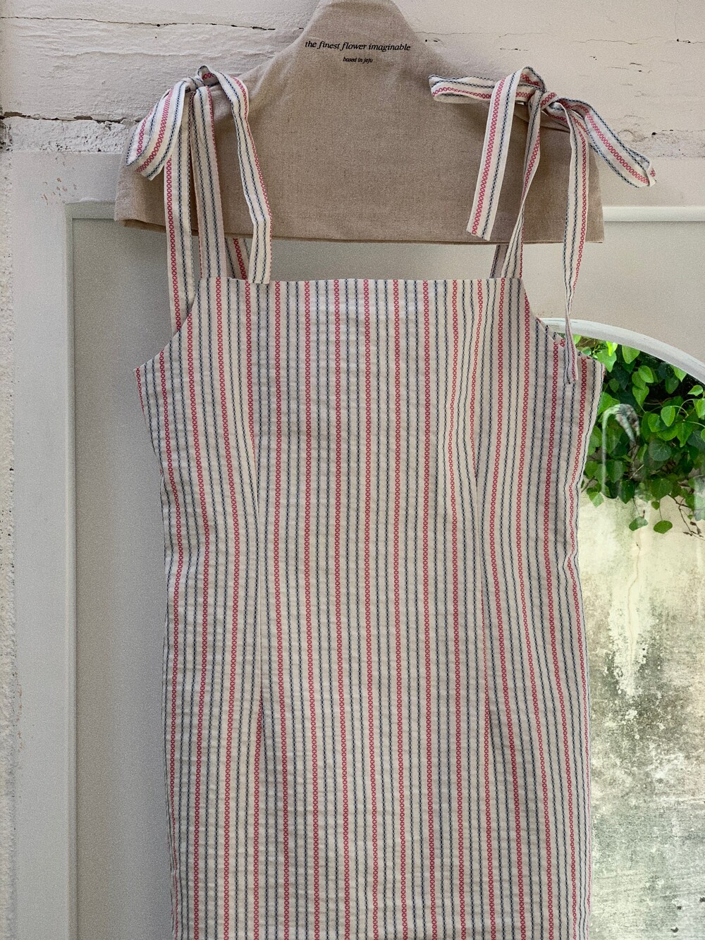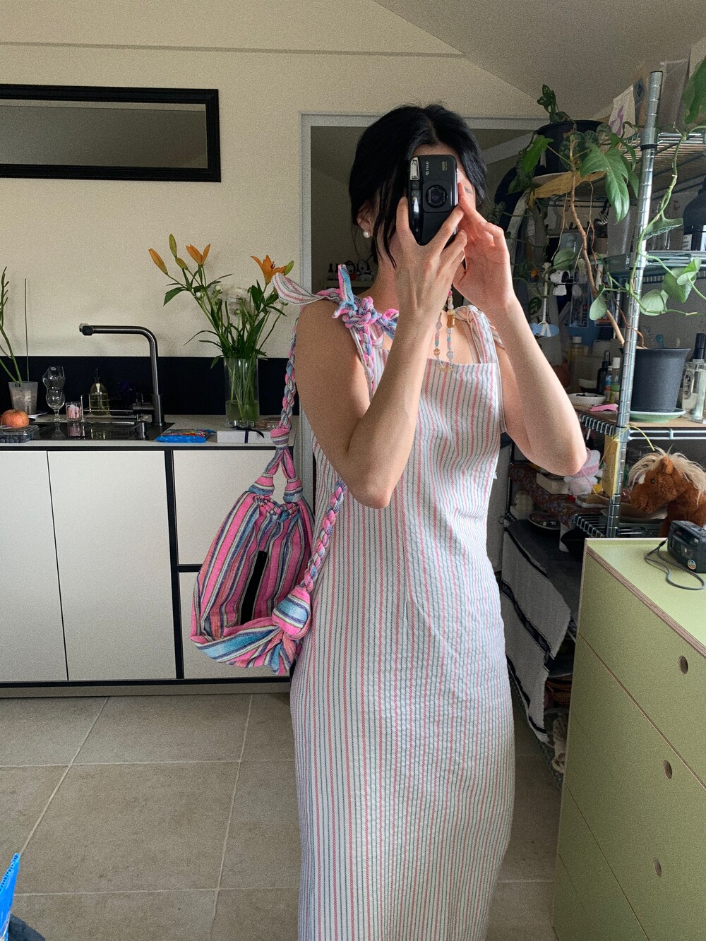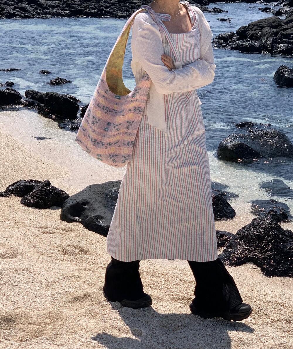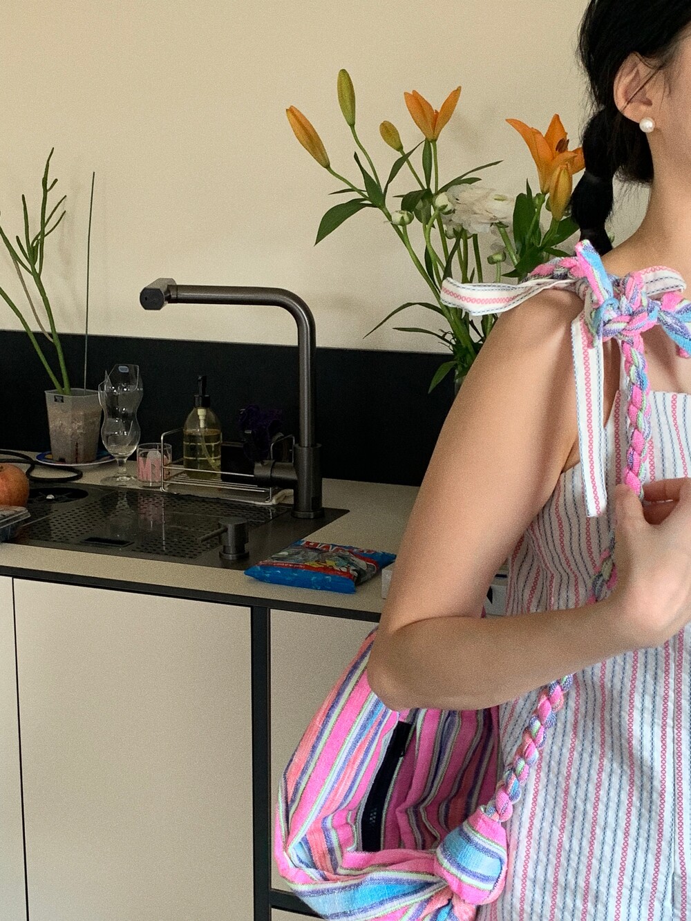 어깨끈은 고정되어 있지 않으며 몸에 맞게 묶어서 착용해주시면 되어요.