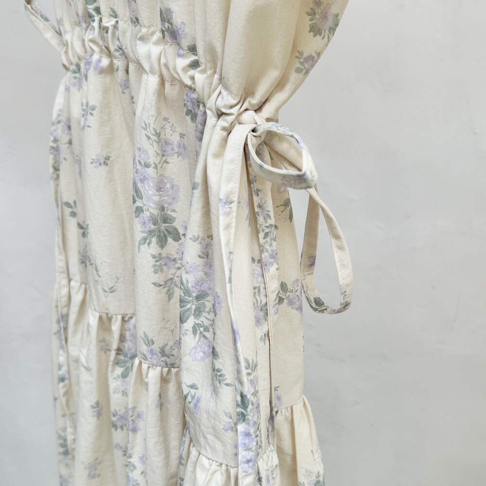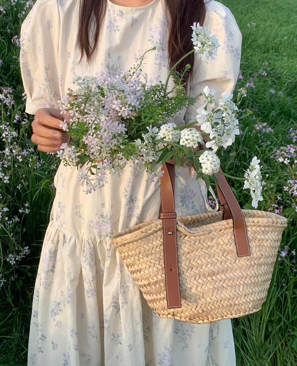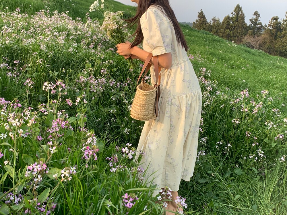 아주 옅은 레몬옐로우 컬러에 빈티지한 느낌의 플라워 프린트가 있어요