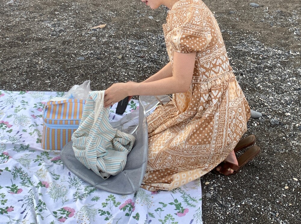 약간 위쪽으로 잡아준 허리선과 셔링을 촘촘하게 잡아서 스커트 라인이 자연스럽게 퍼져요.