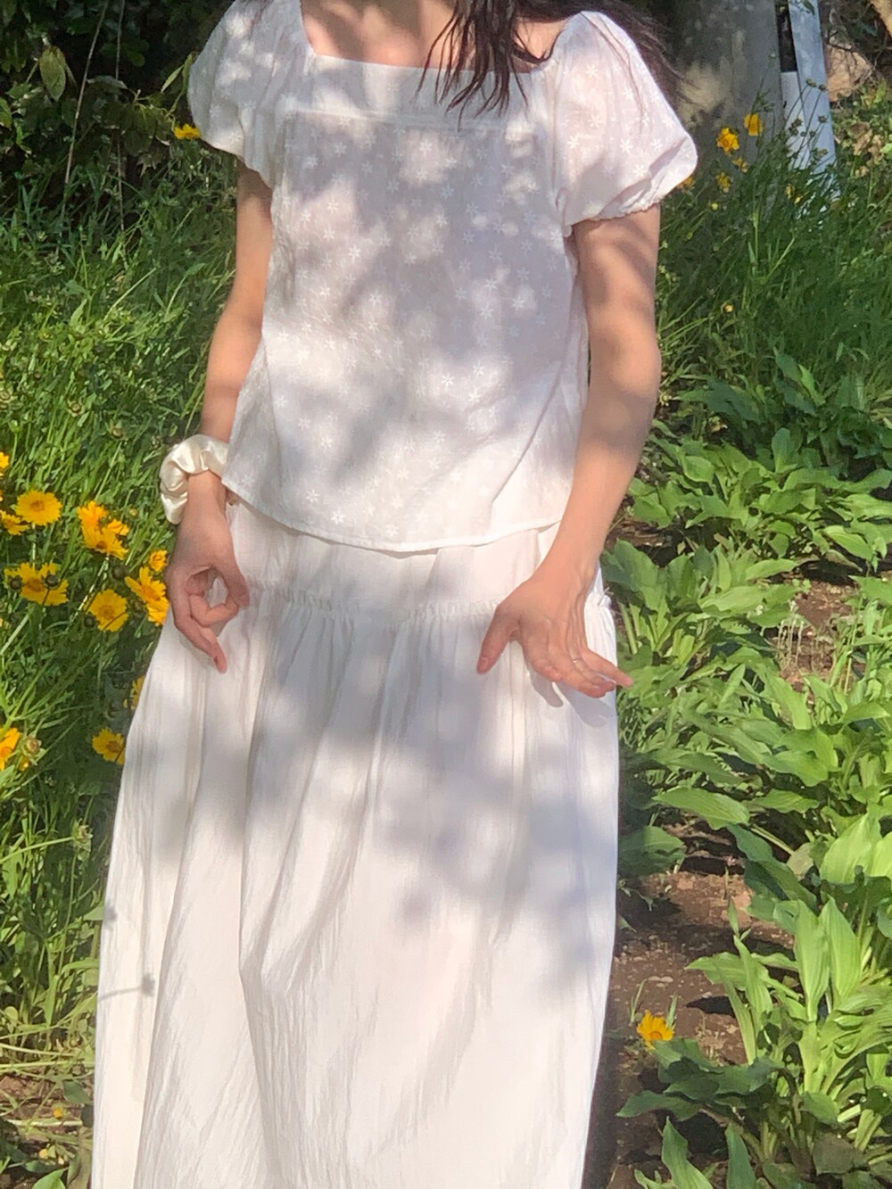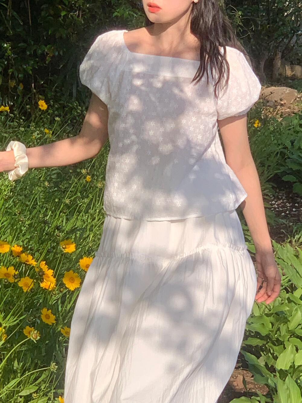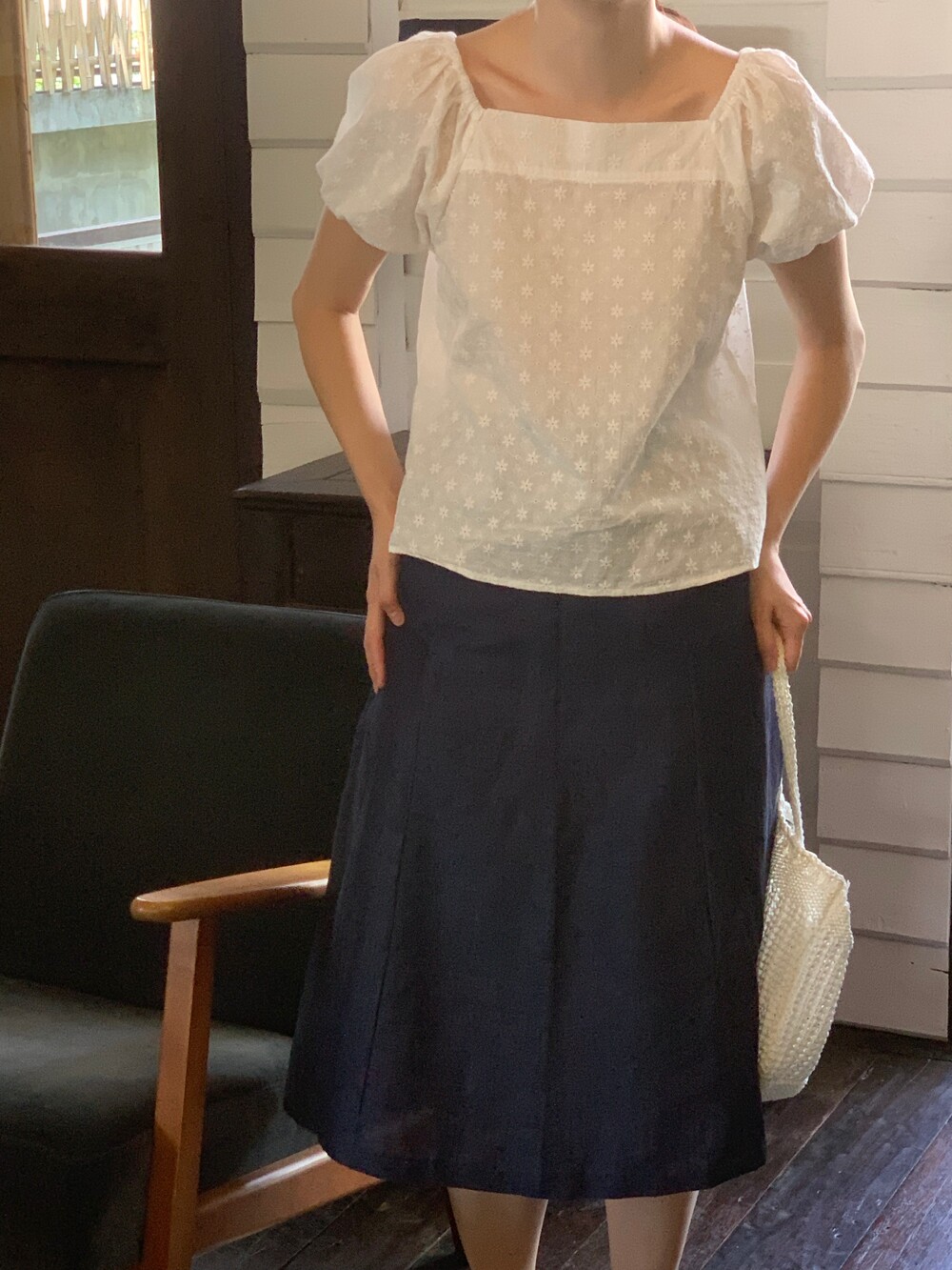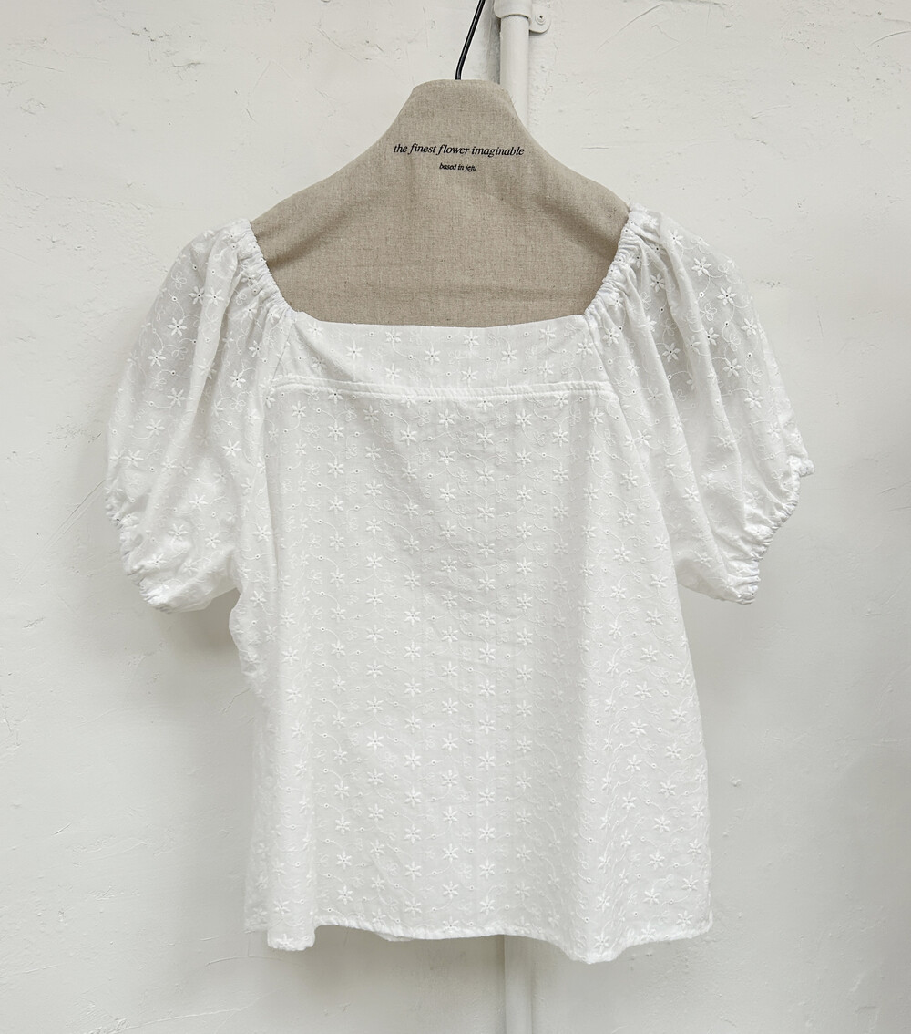 밴딩으로 처리한 퍼프소매는 귀여움과 사랑스러움을 더해줍니다