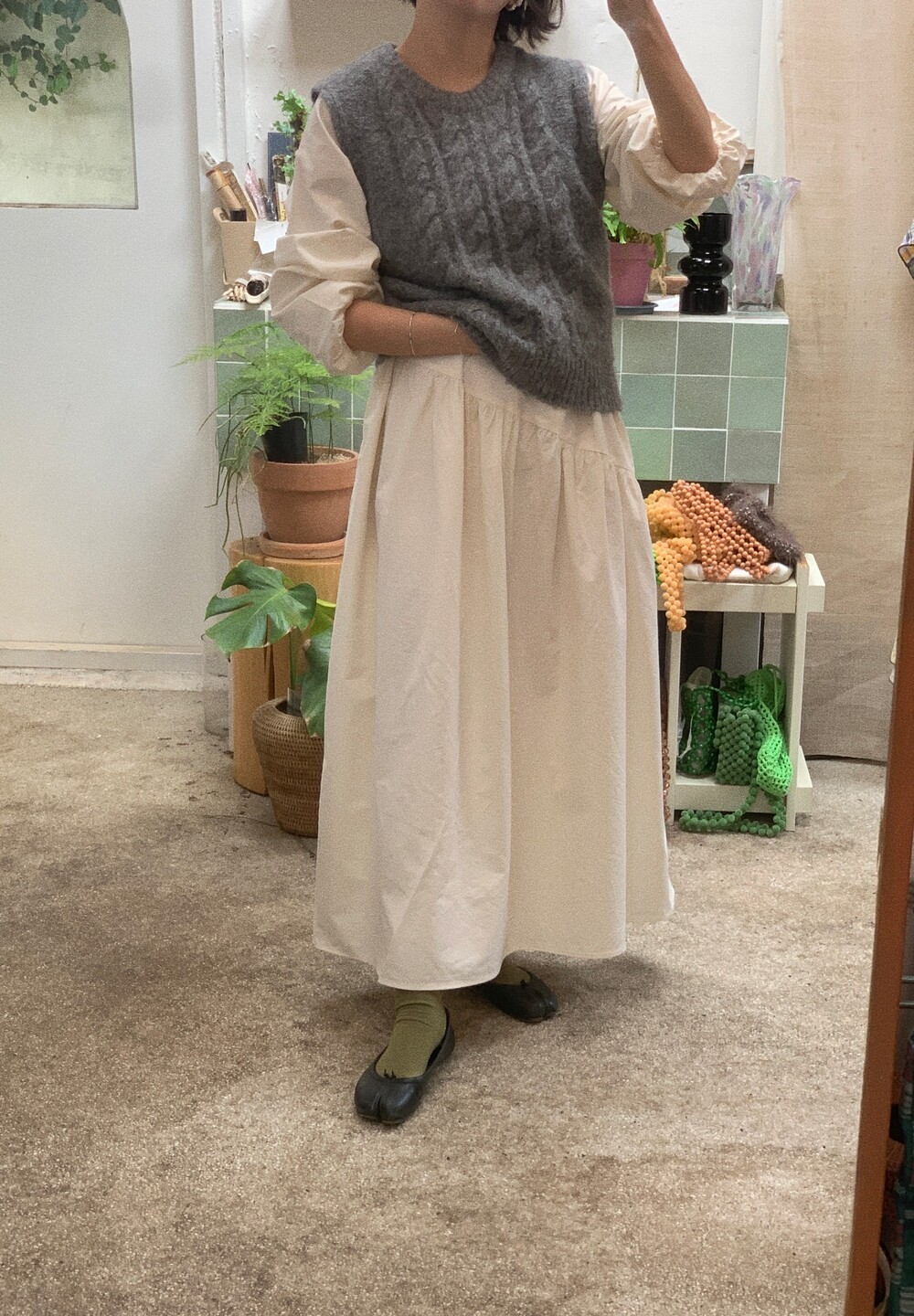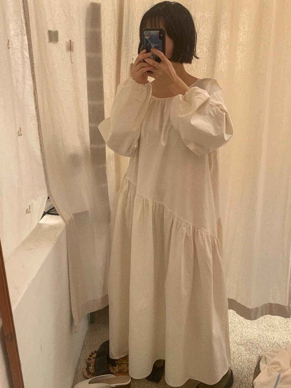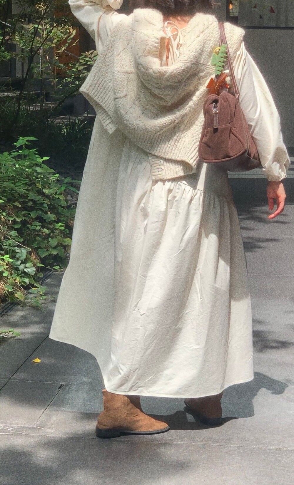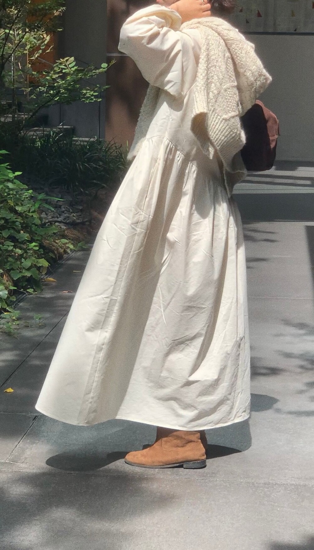 허리선은 강조하지 않고, 살짝 내려 부드러운 곡선으로 떨어지게 만들었습니다.