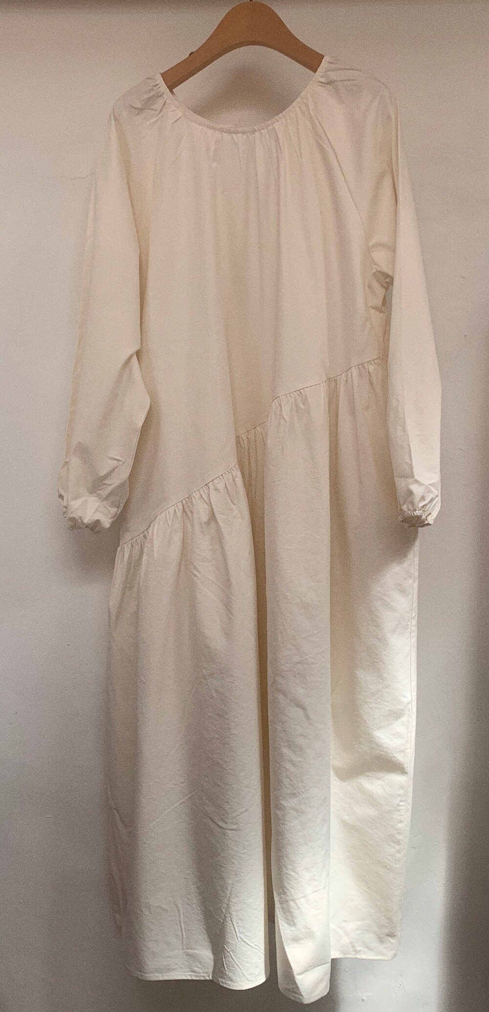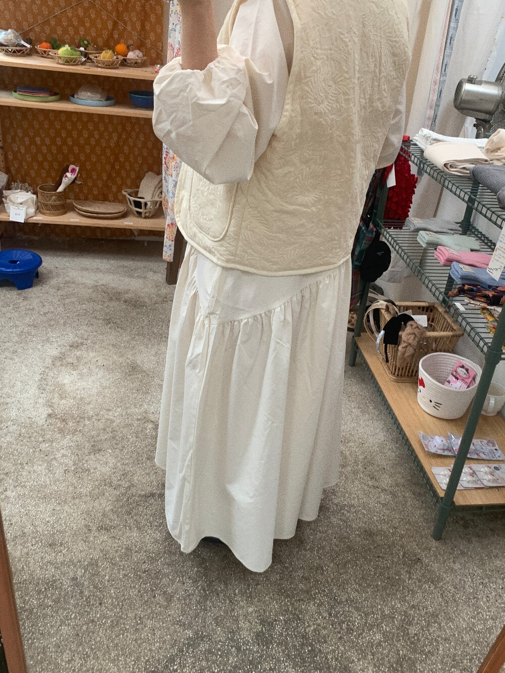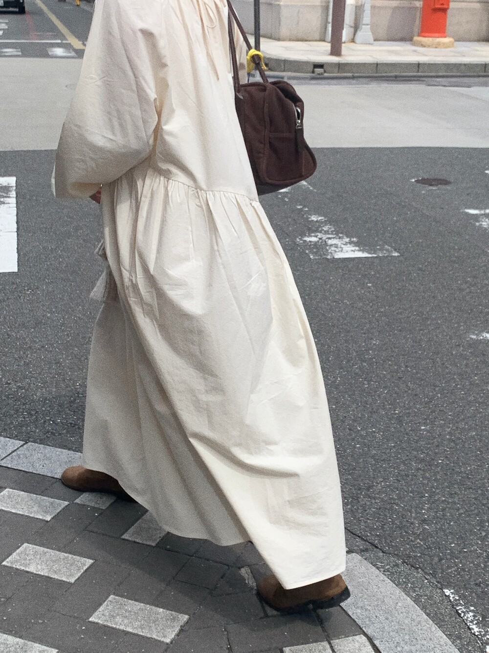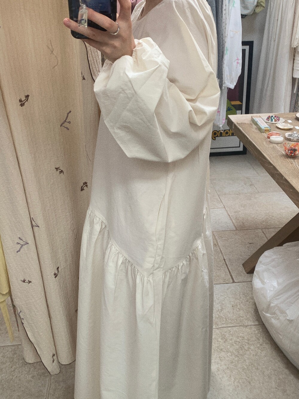 허리선은 강조하지 않고, 살짝 내려 부드러운 곡선으로 떨어지게 만들었습니다.