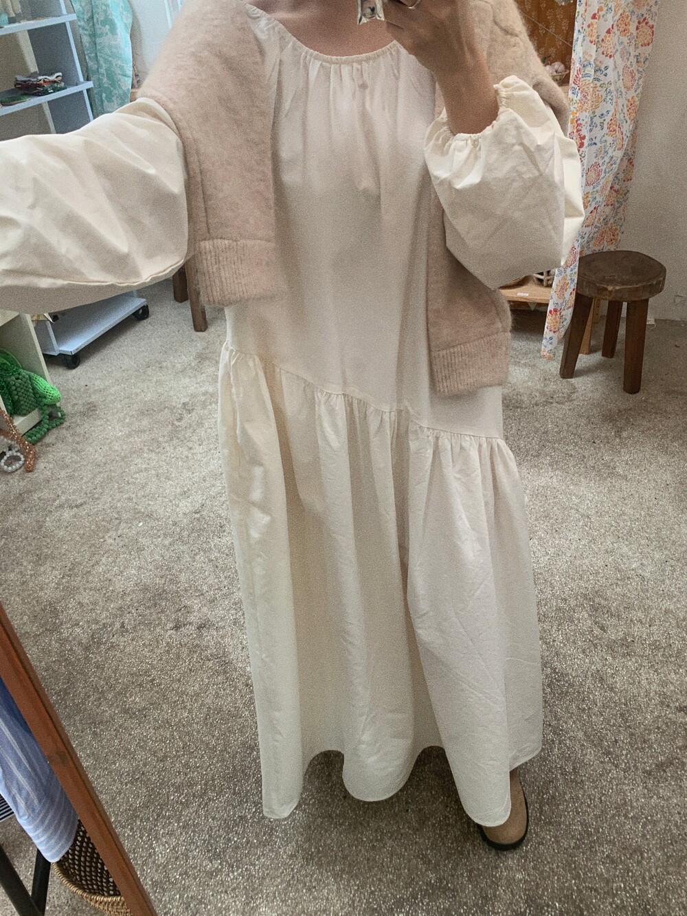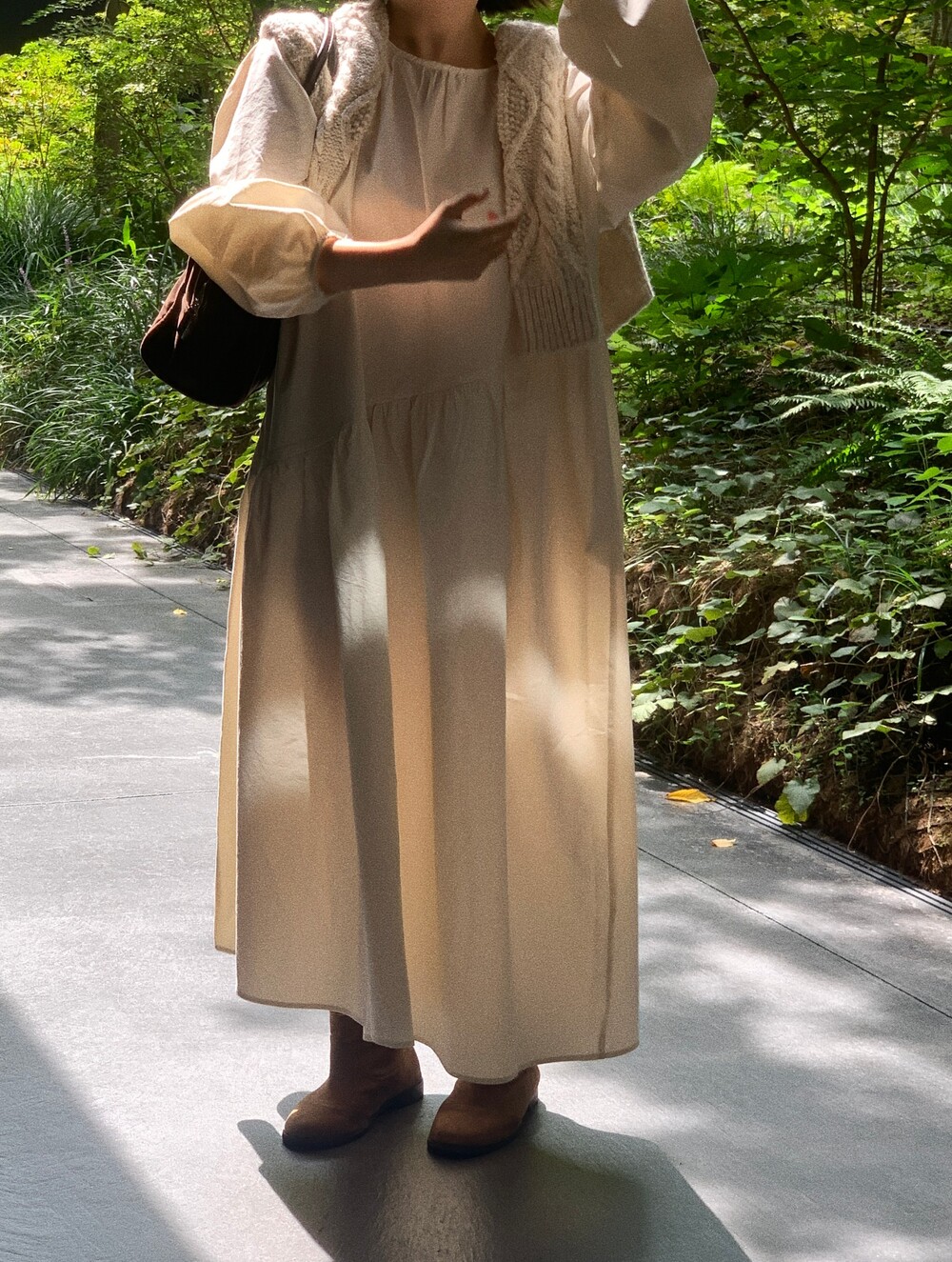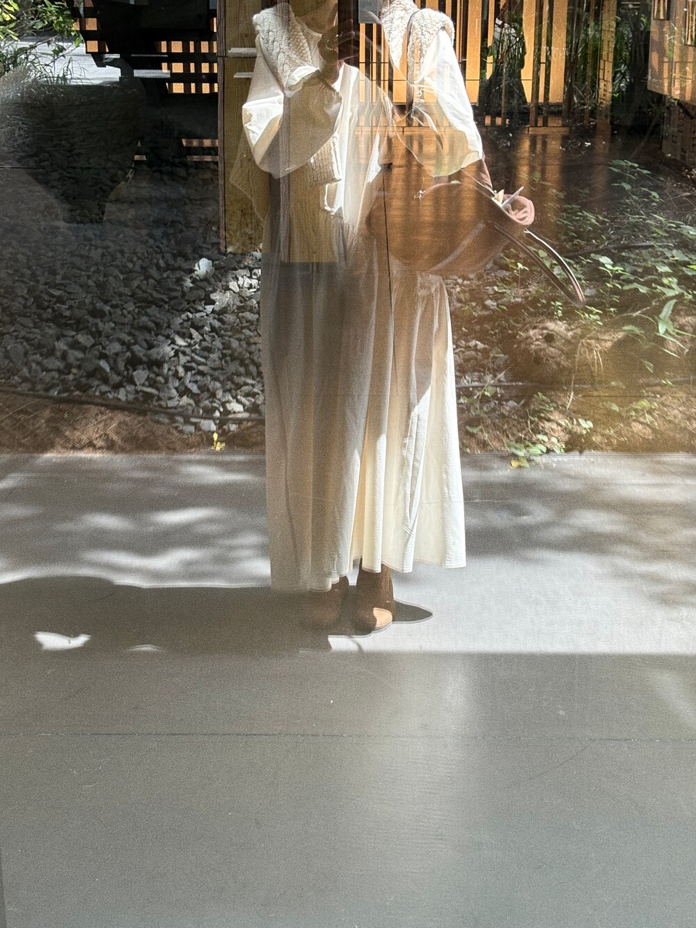 안감이 없는 드레스라 행여 비침이 심할까 싶어 내리쬐는 햇살아래에서 촬영한 모습입니다.