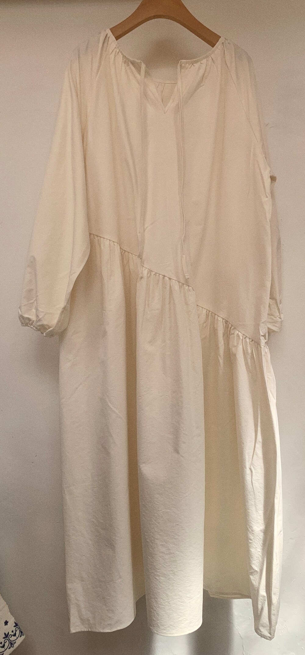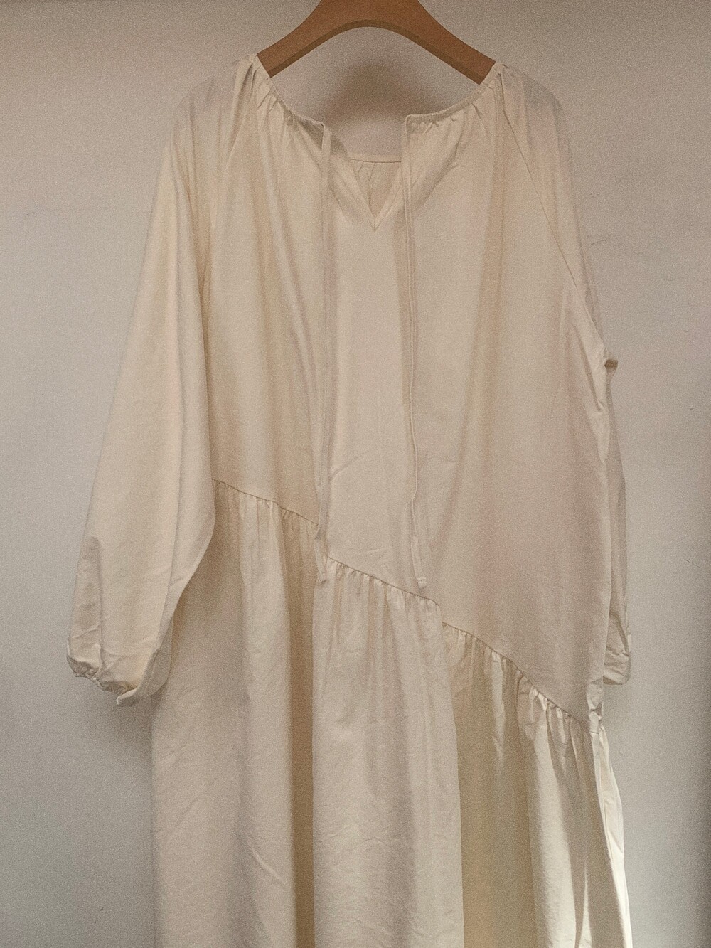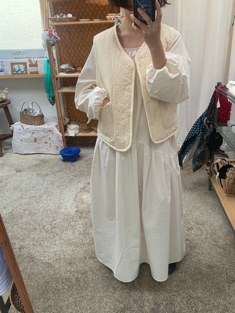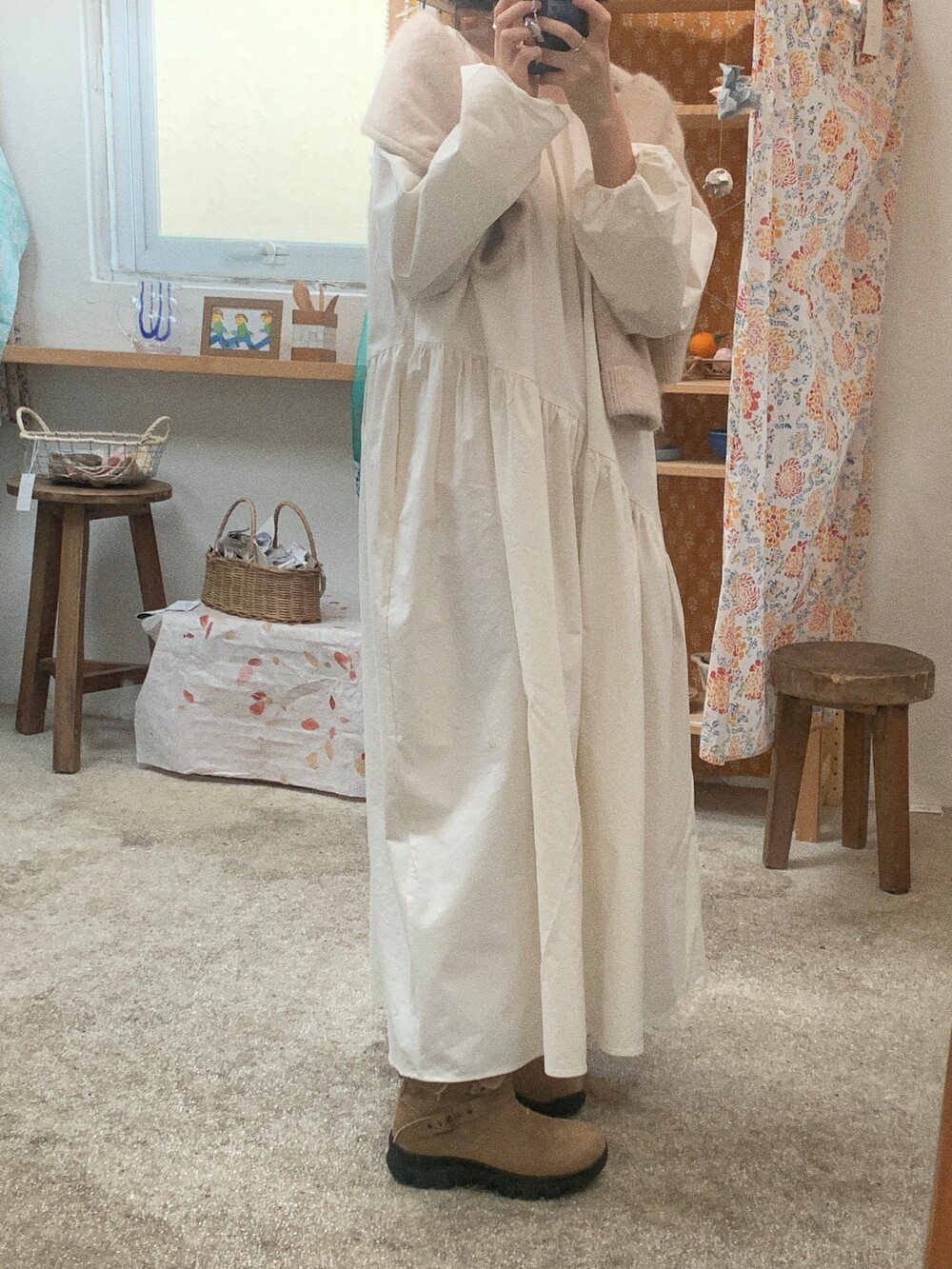 지퍼나 버튼 없이 끈으로 여밈할 수 있게 목 뒤에 넣어주어 러블리한 무드를 더했습니다.