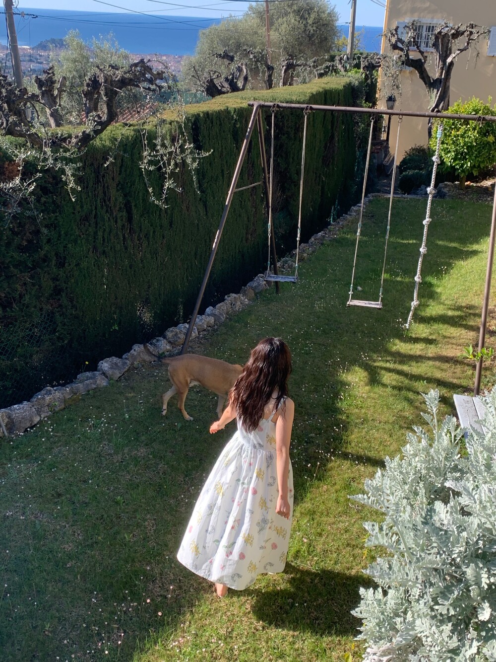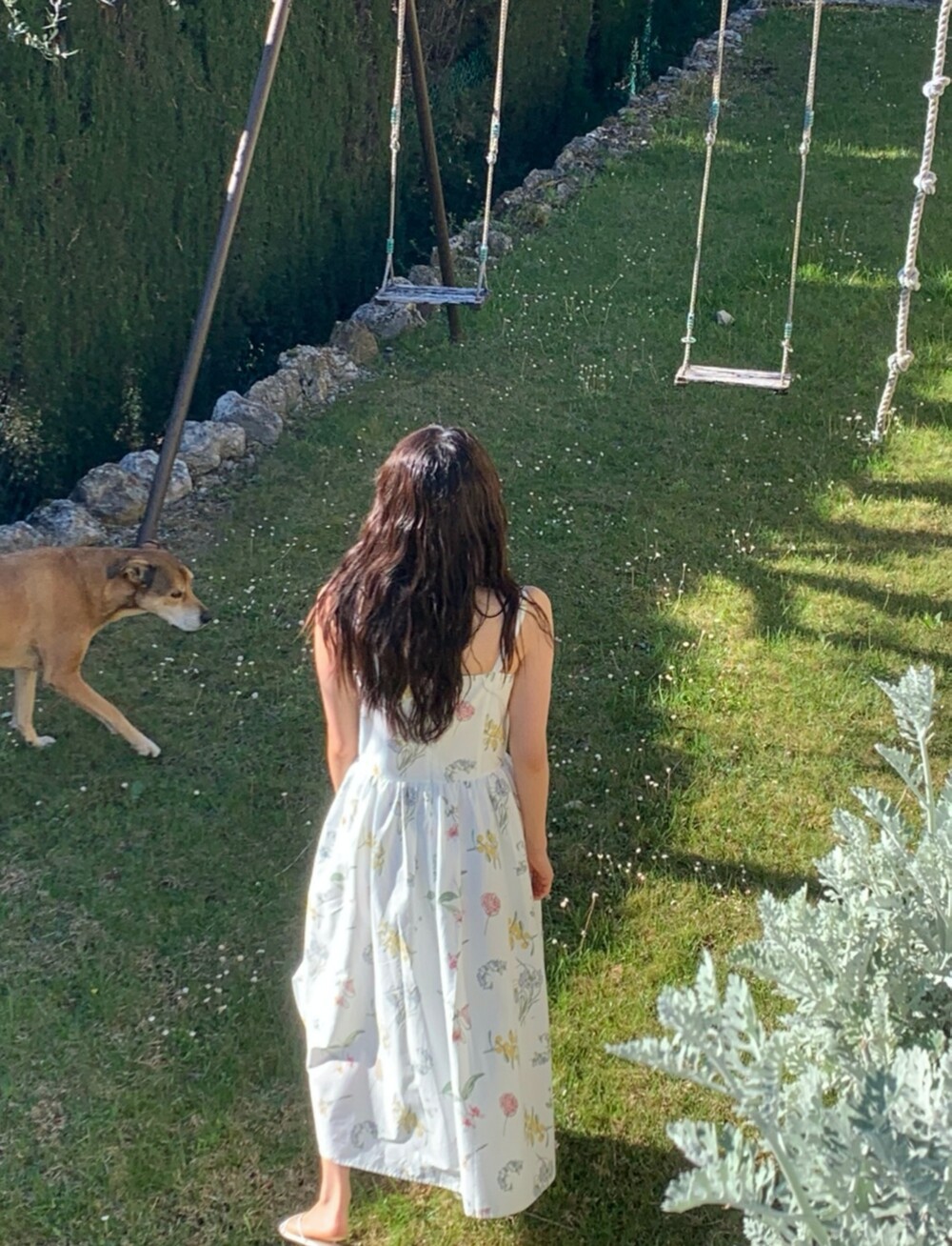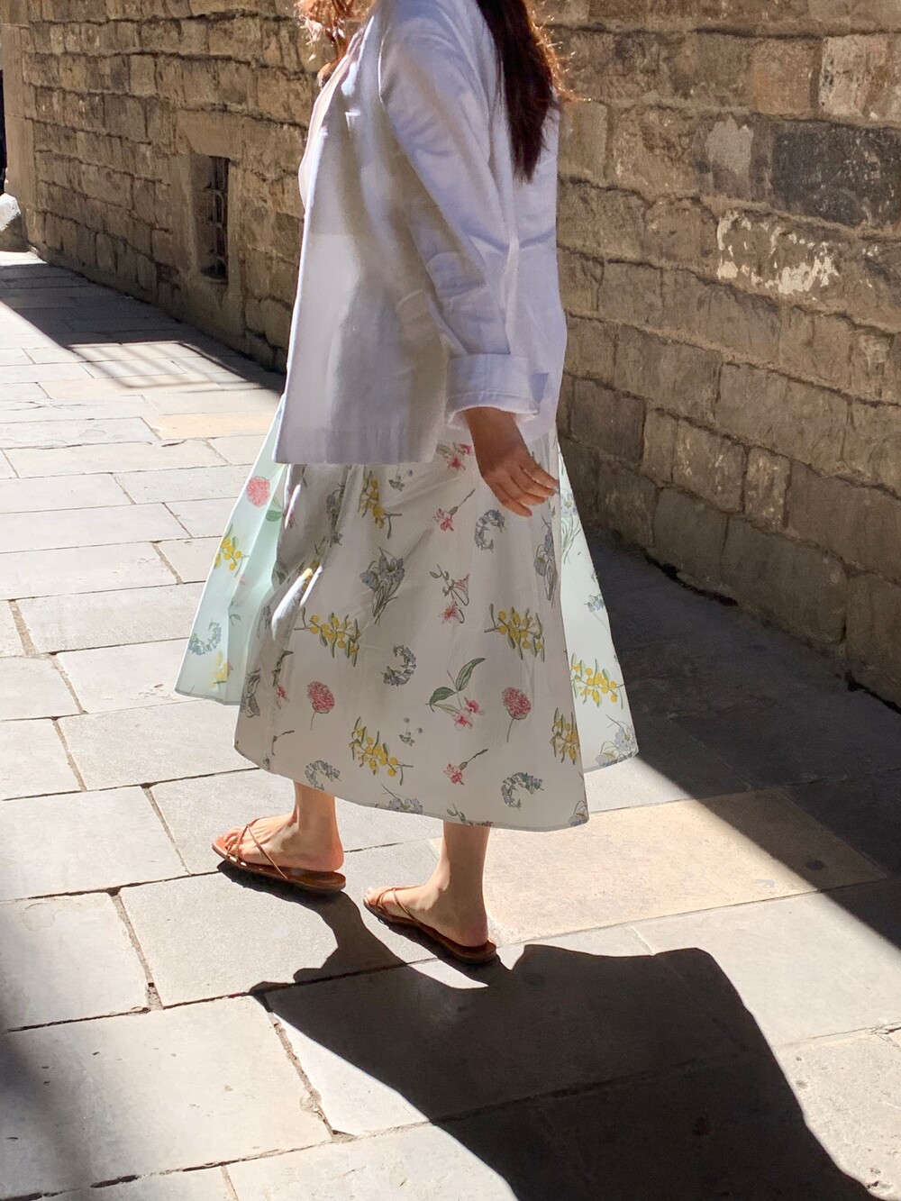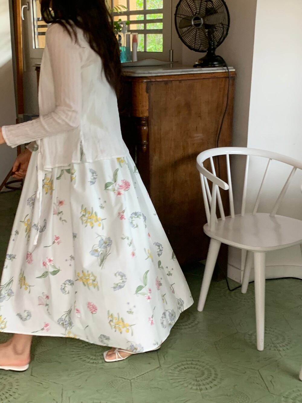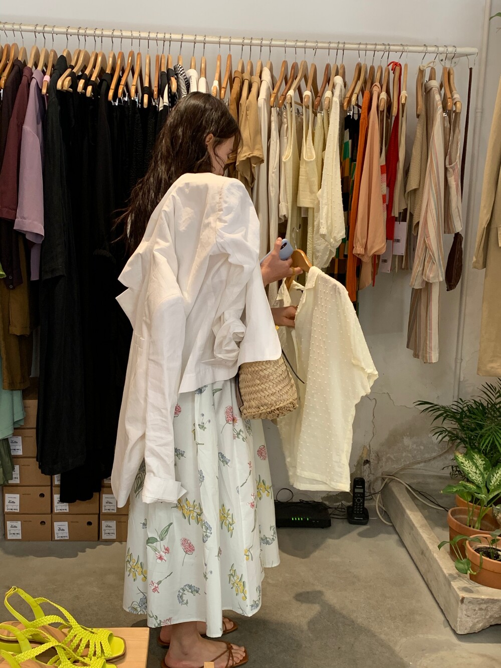 셔링을 촘촘하게 잡아준 넉넉한 길이의 스커트는 로맨틱한 실루엣이 연출됩니다