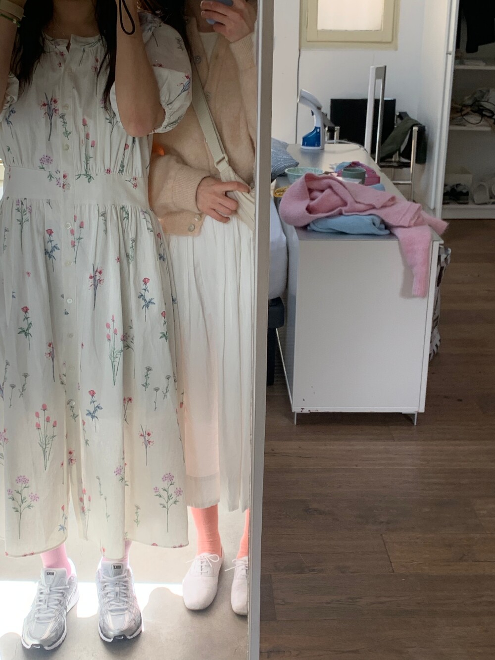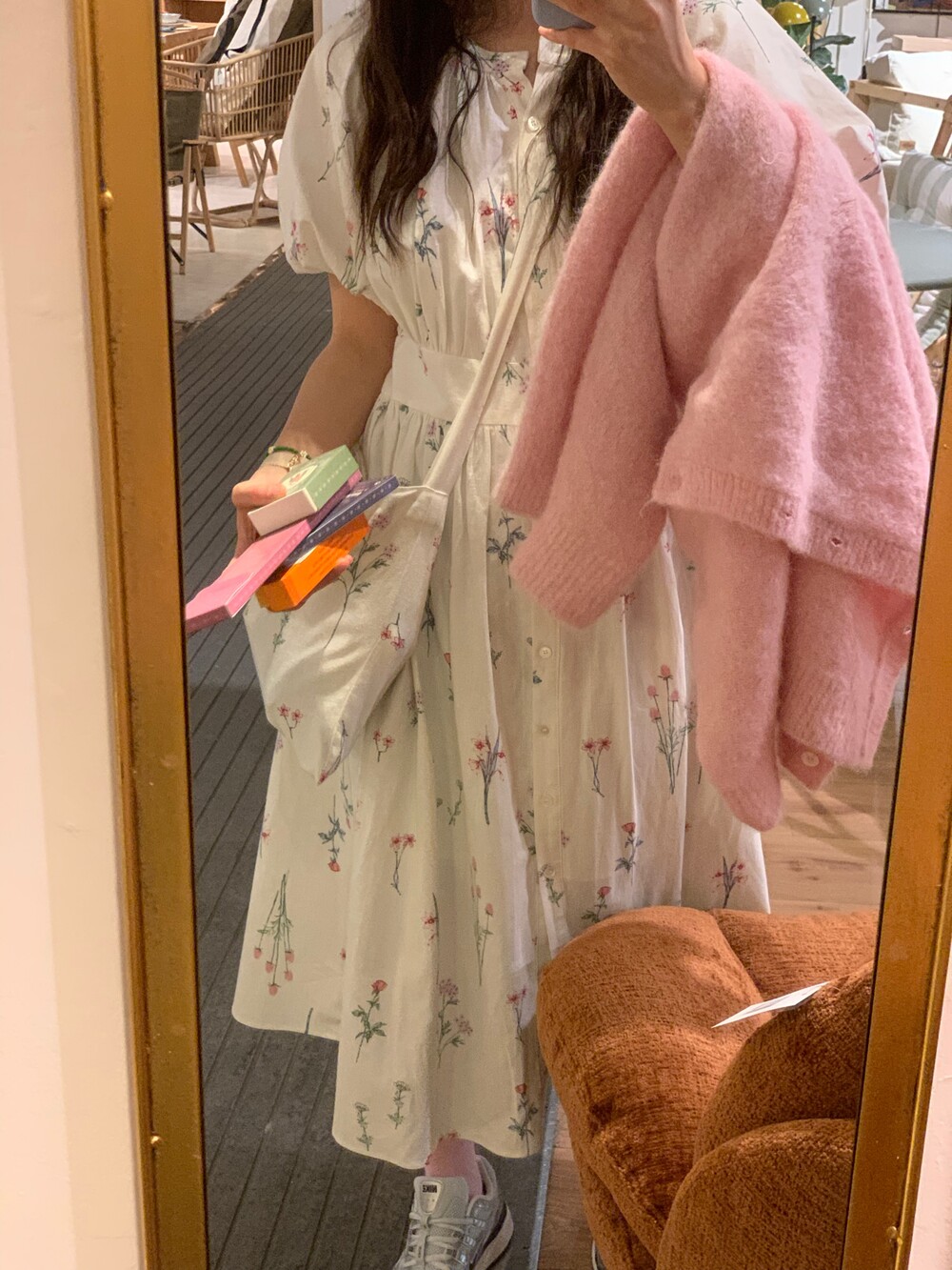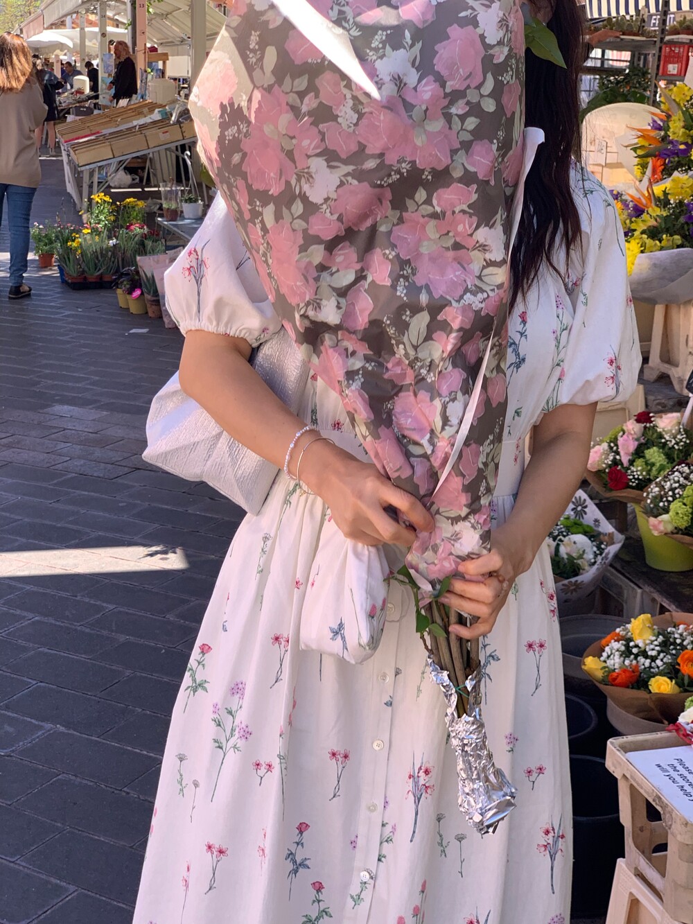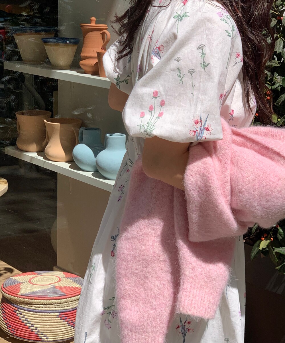 아이보리 컬러 바탕에 핑크+보라 톤의 작은 꽃들로 과하지 않으면서도 러블리한 무드에요