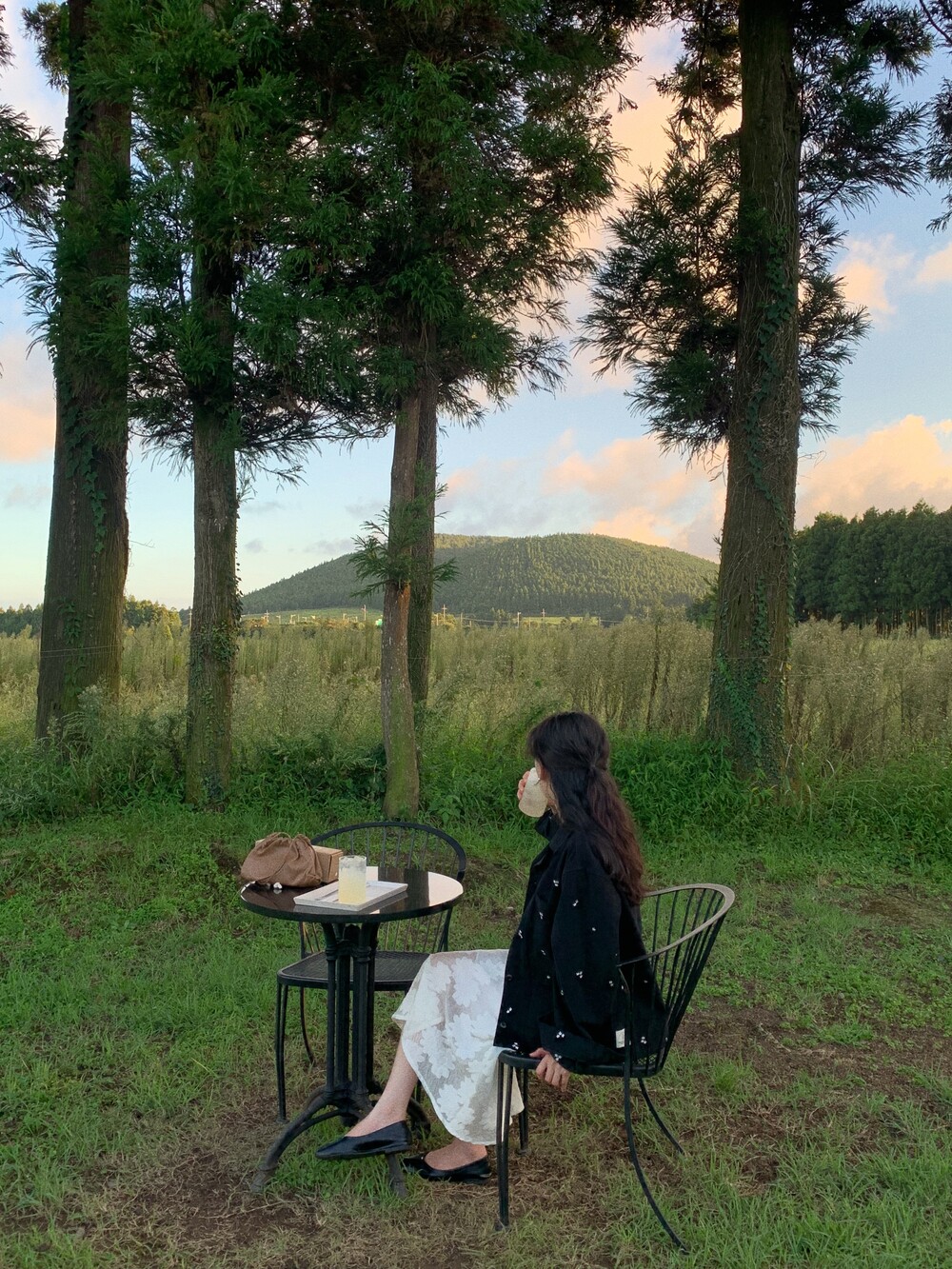 누빔 드레스와 꽃잎블라우스와 함께.