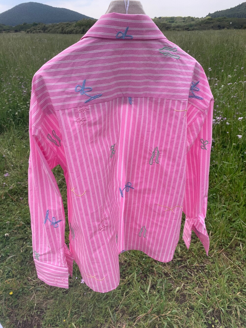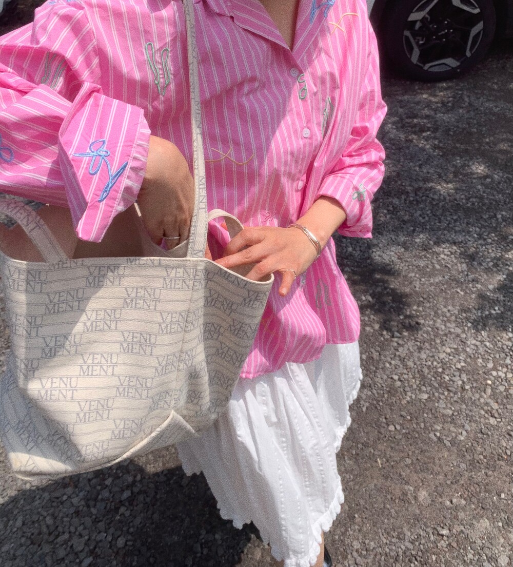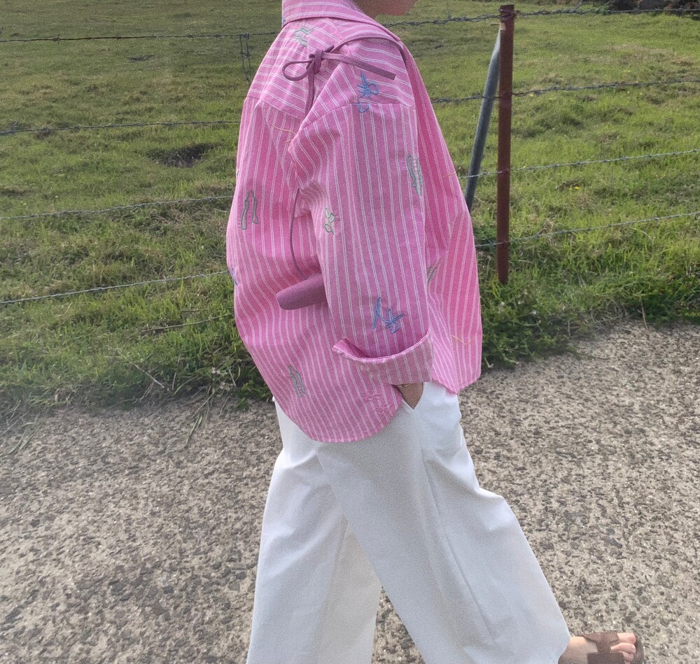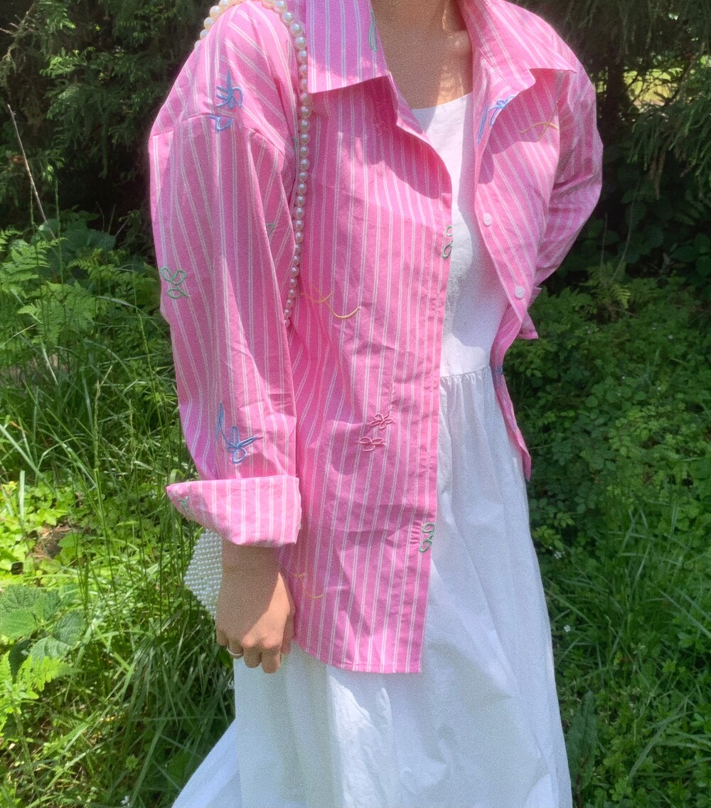 에코 워싱으로 만들어진 스트라이트 코튼 원단에 스케치한 자수를 씌워 세상에 하나뿐인 원단을 만들었습니다.