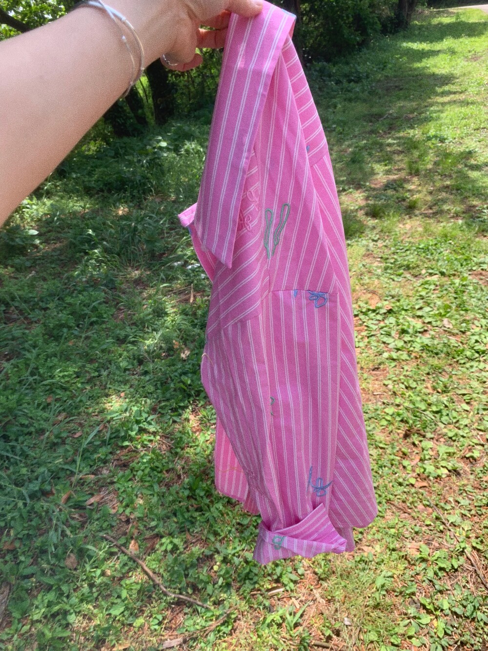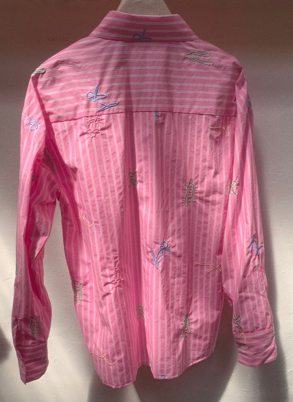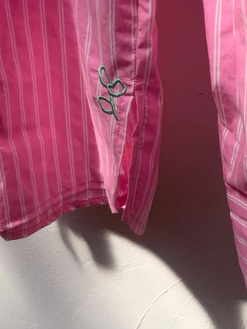 에코 워싱으로 만들어진 스트라이트 코튼 원단에 스케치한 자수를 씌워 세상에 하나뿐인 원단을 만들었습니다.