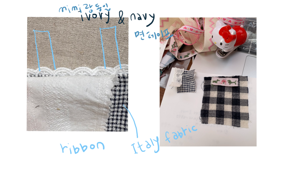 원단 조각들과 끈 테잎을 가지고 오랜시간 고민했습니다.