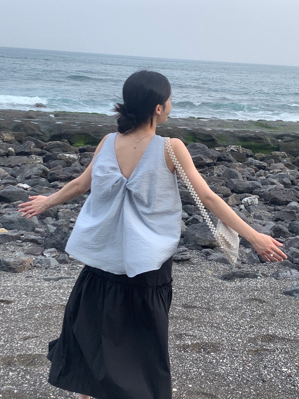 앞부분이 짧고 뒷부분이 긴 디자인으로 앞쪽은 크롭한 길이라 다리가 길어보여요