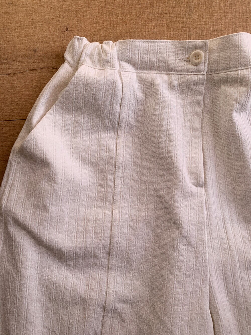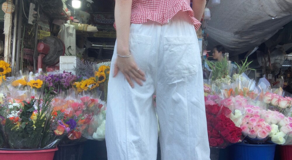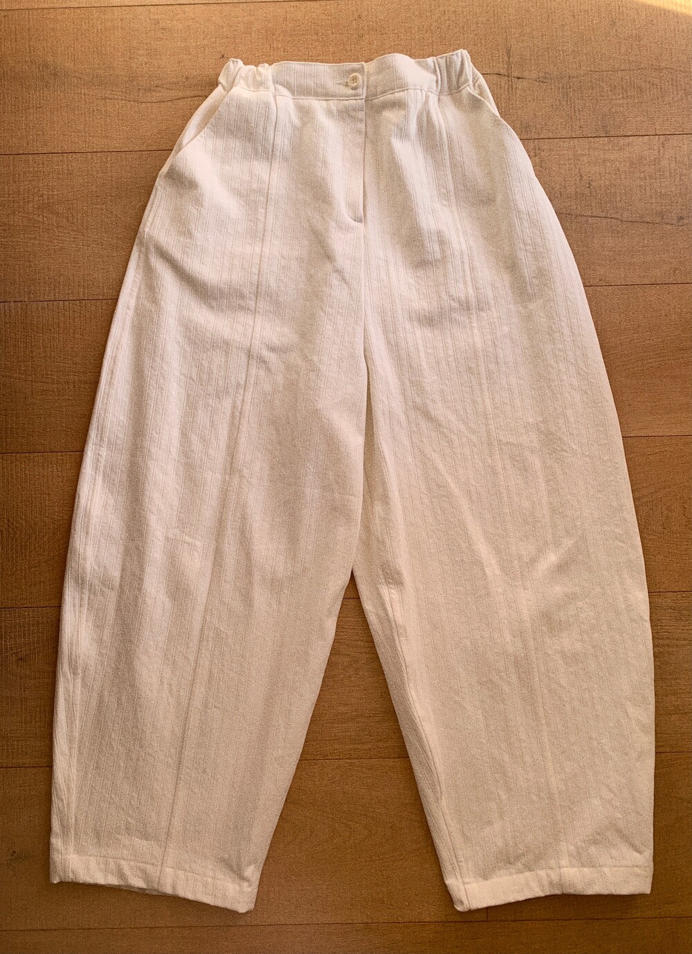 직선으로 툭 떨어지는 와이드 팬츠와는 다르게, 입체적으로 휘어지는 곡선 라인이 다리 형태를 부드럽게 감싸 움직일 때마다 자연스러운 볼륨을 만들어냅니다.