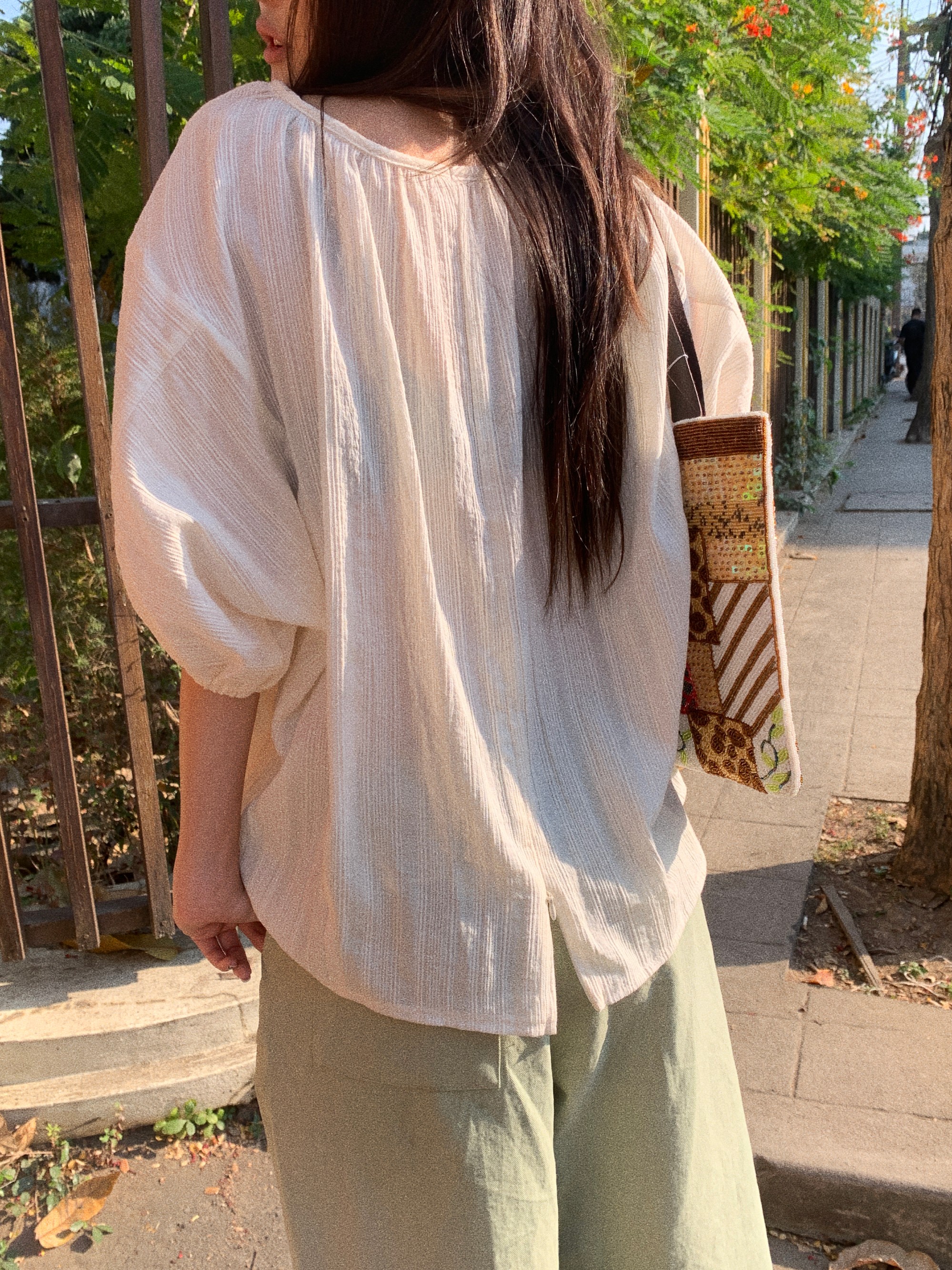 전체적으로 여유 있게 떨어지는 실루엣으로 상체라인을 자연스럽게 감싸며 편안한 무드를 완성합니다.