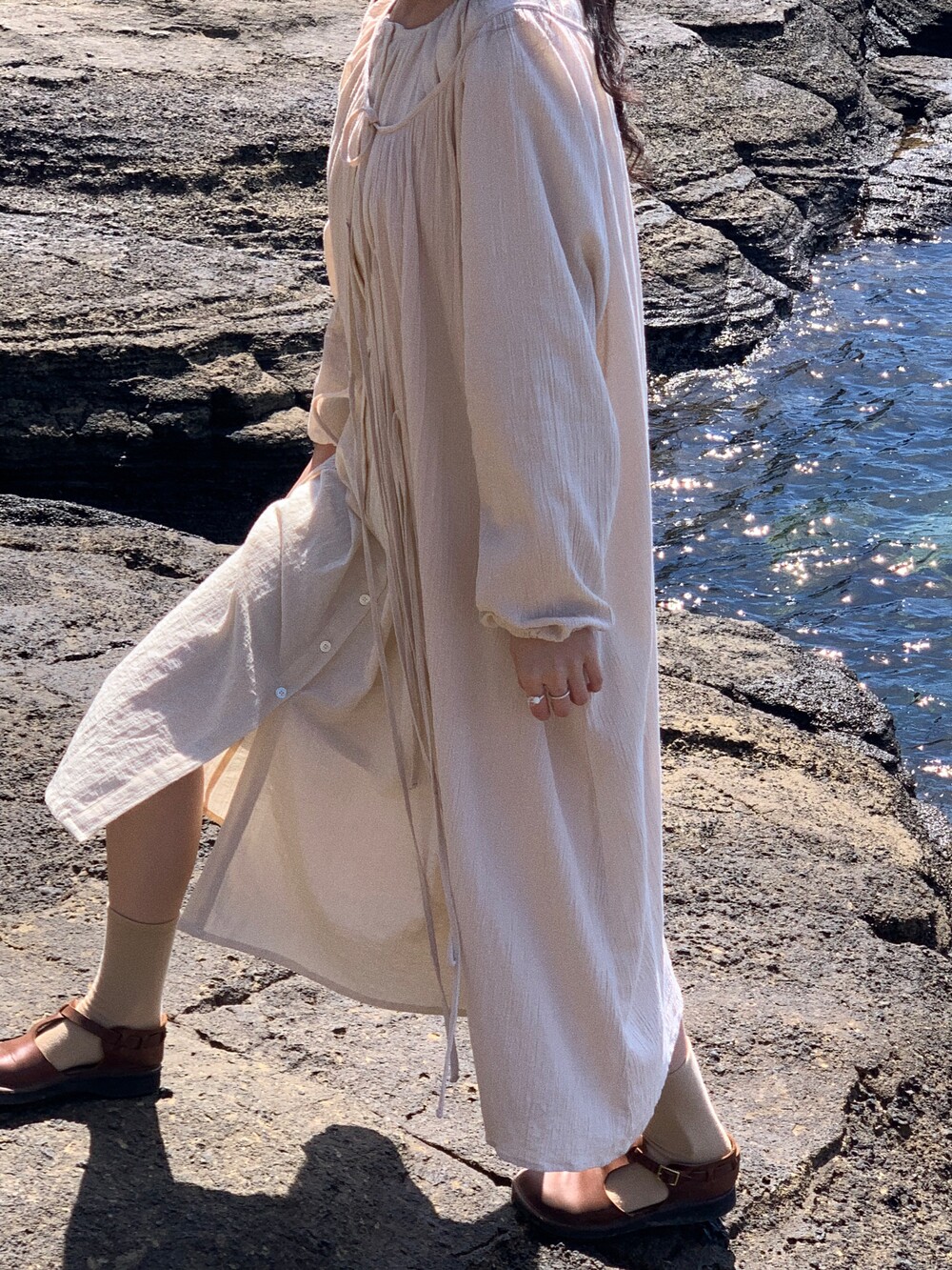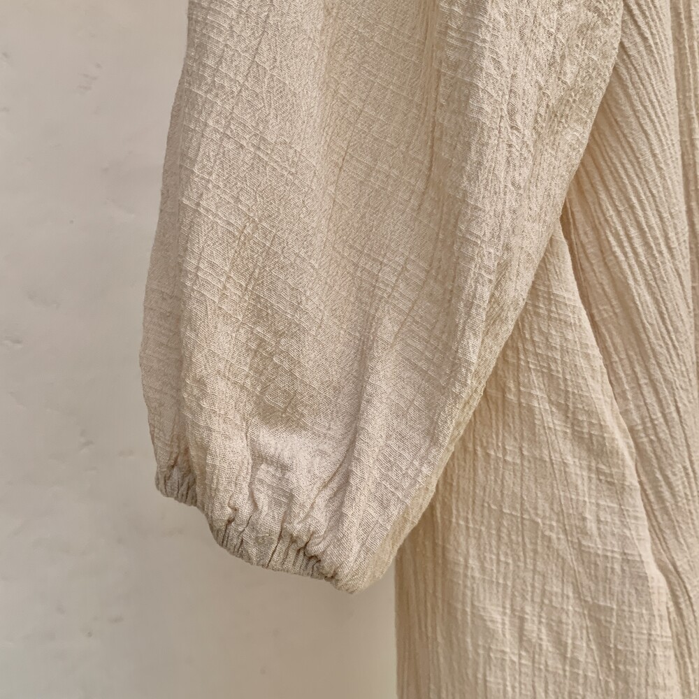 원단 전체에 자잘한 주름이 있어 몸에 달라붙지 않고 뜨거운 여름날까지 쾌적하게 착용하실 수 있습니다
