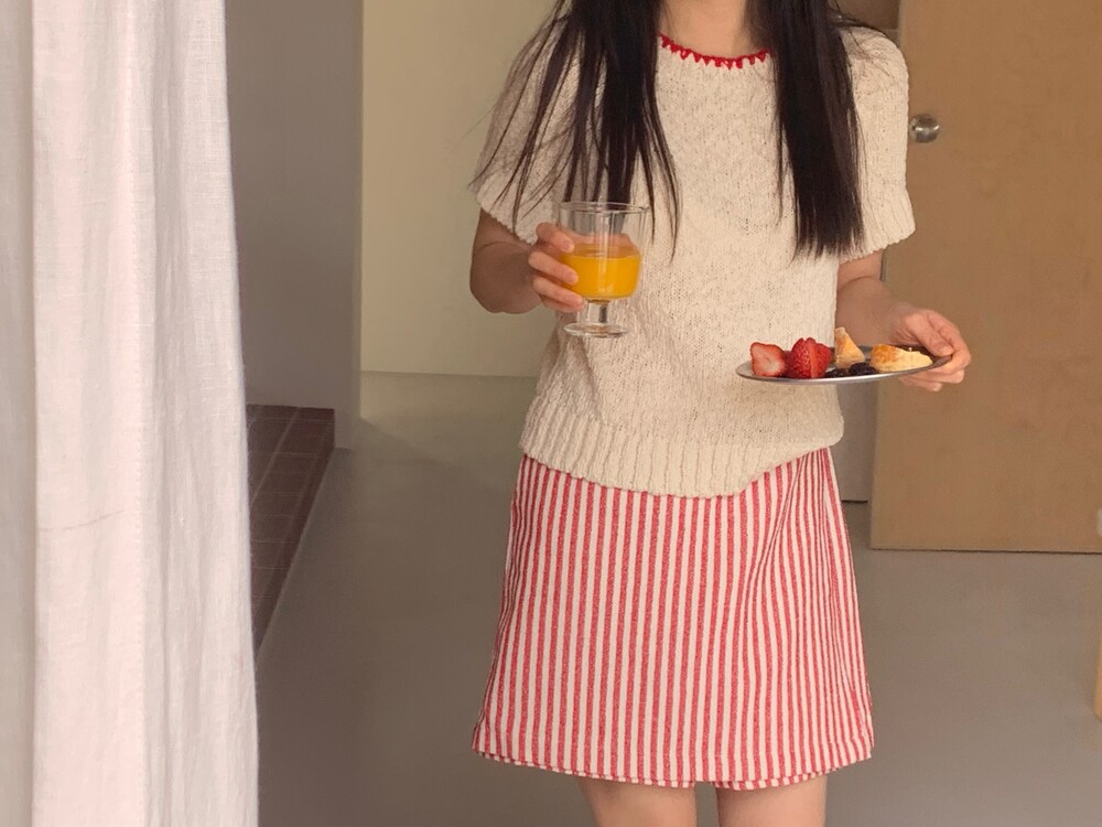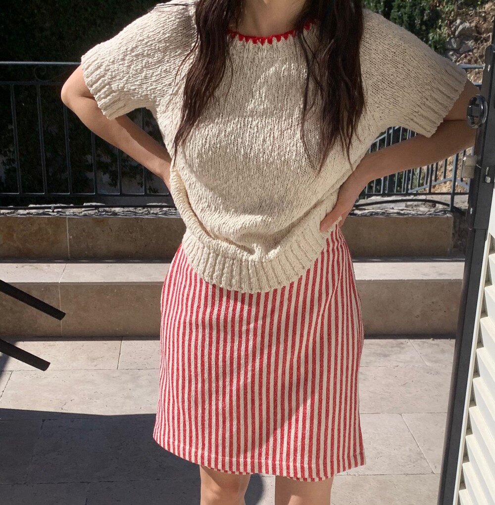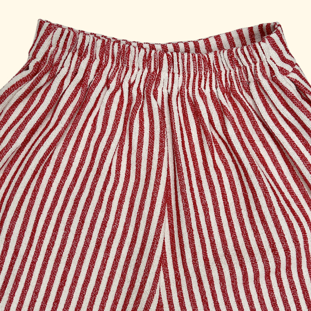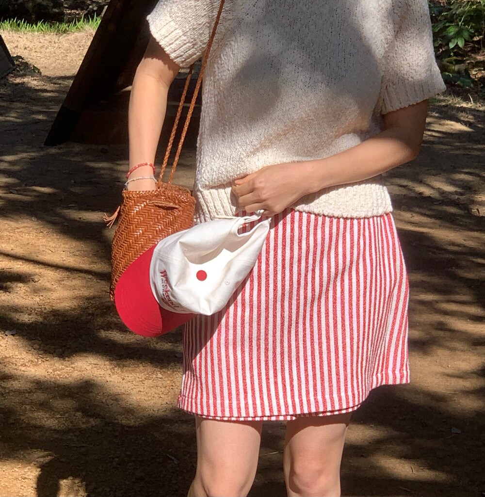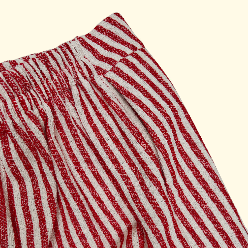 네추럴한 에크루 컬러 바탕에 맑고 선명한 레드 컬러의 스트라이프 패턴입니다