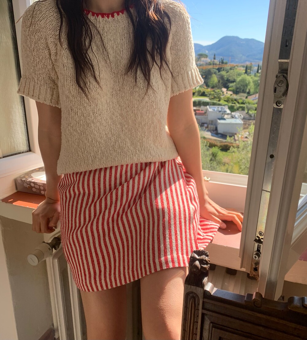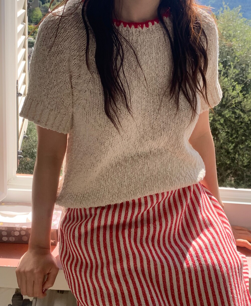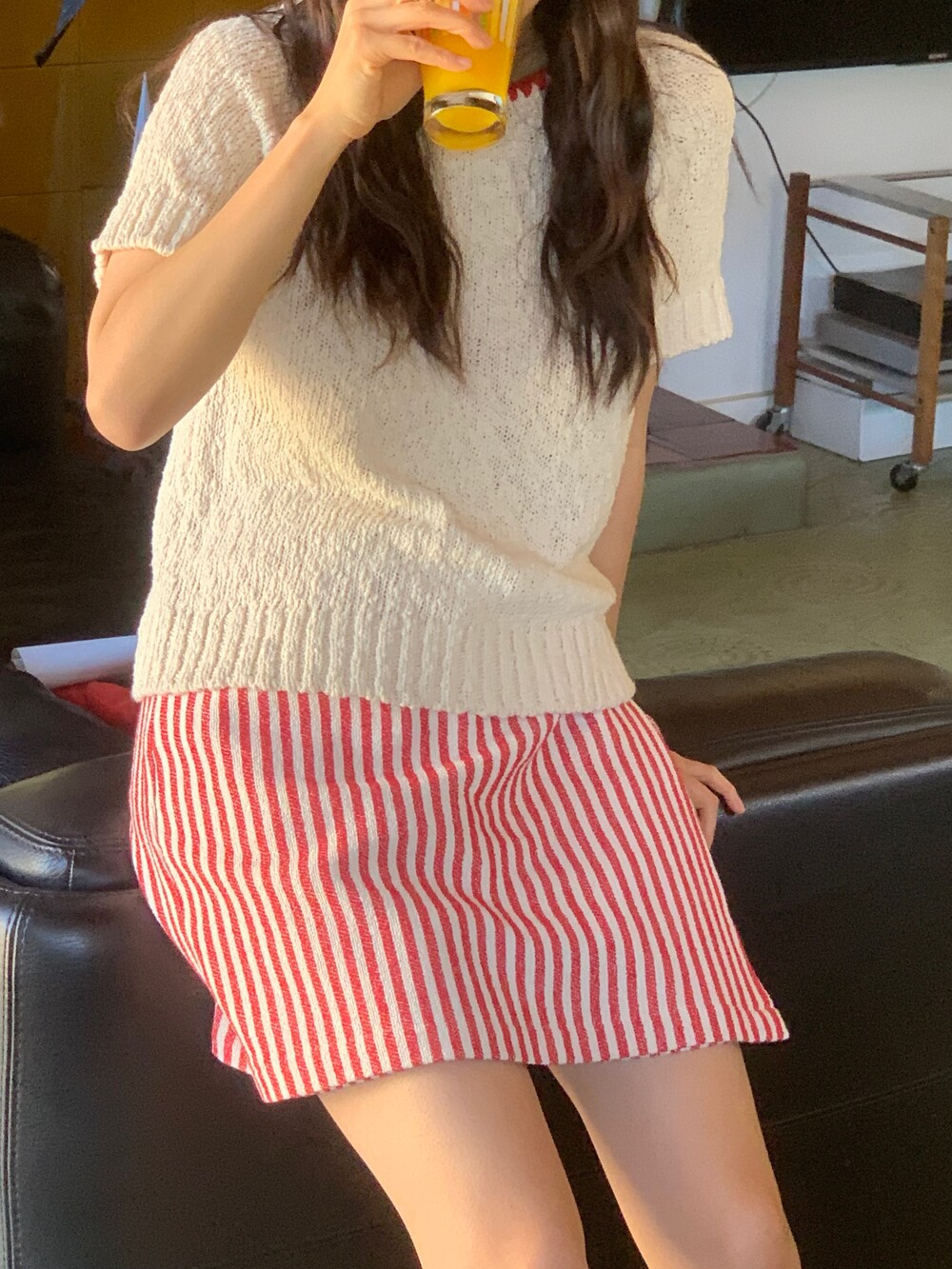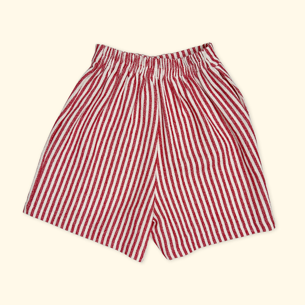 네추럴한 에크루 컬러 바탕에 맑고 선명한 레드 컬러의 스트라이프 패턴입니다