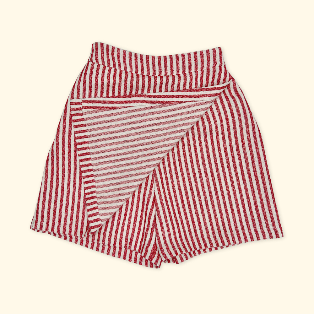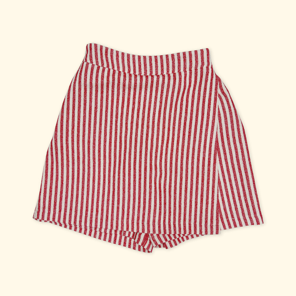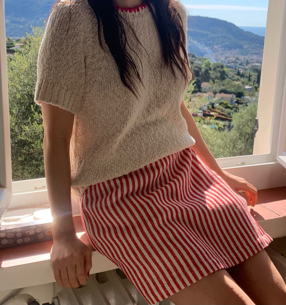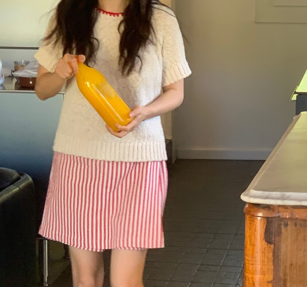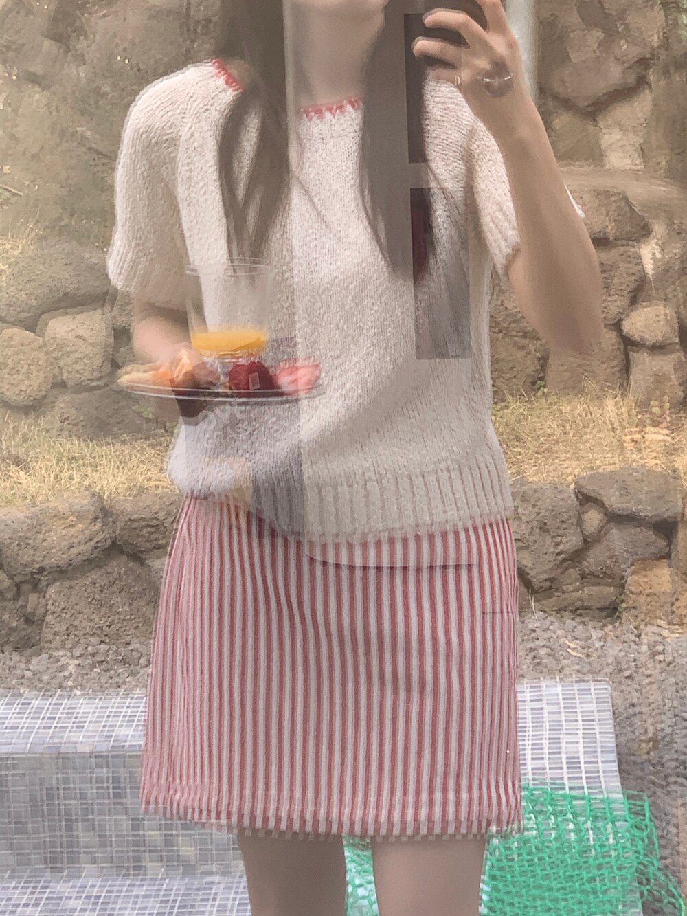 네추럴한 에크루 컬러 바탕에 맑고 선명한 레드 컬러의 스트라이프 패턴입니다