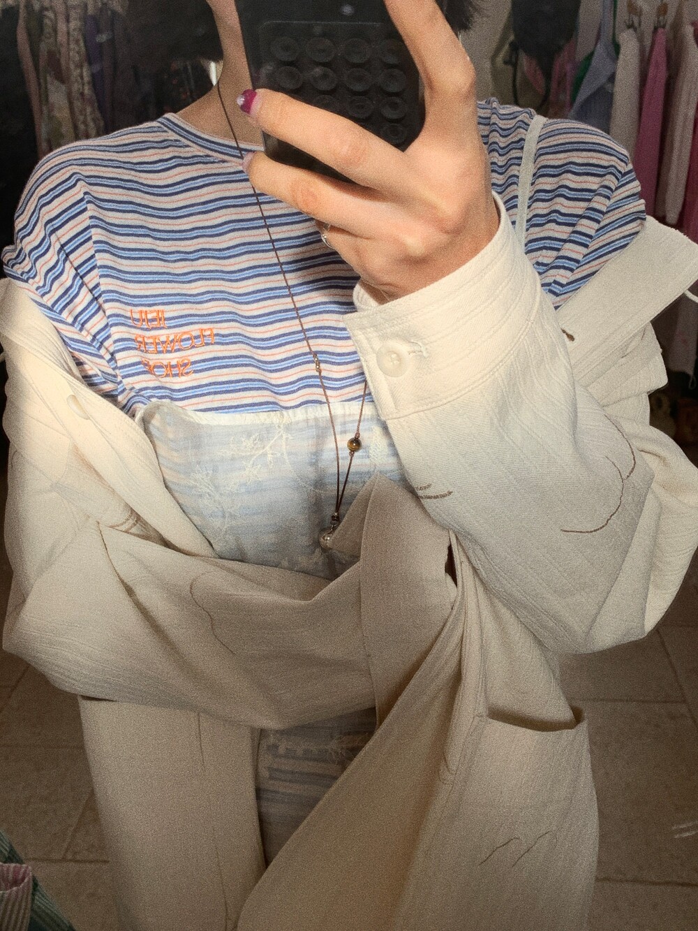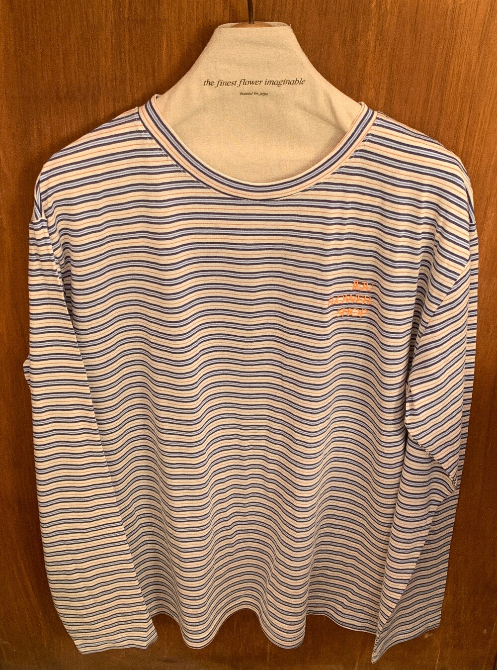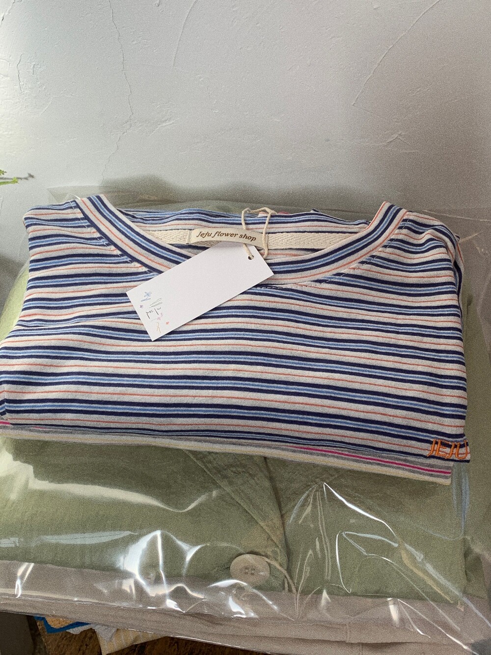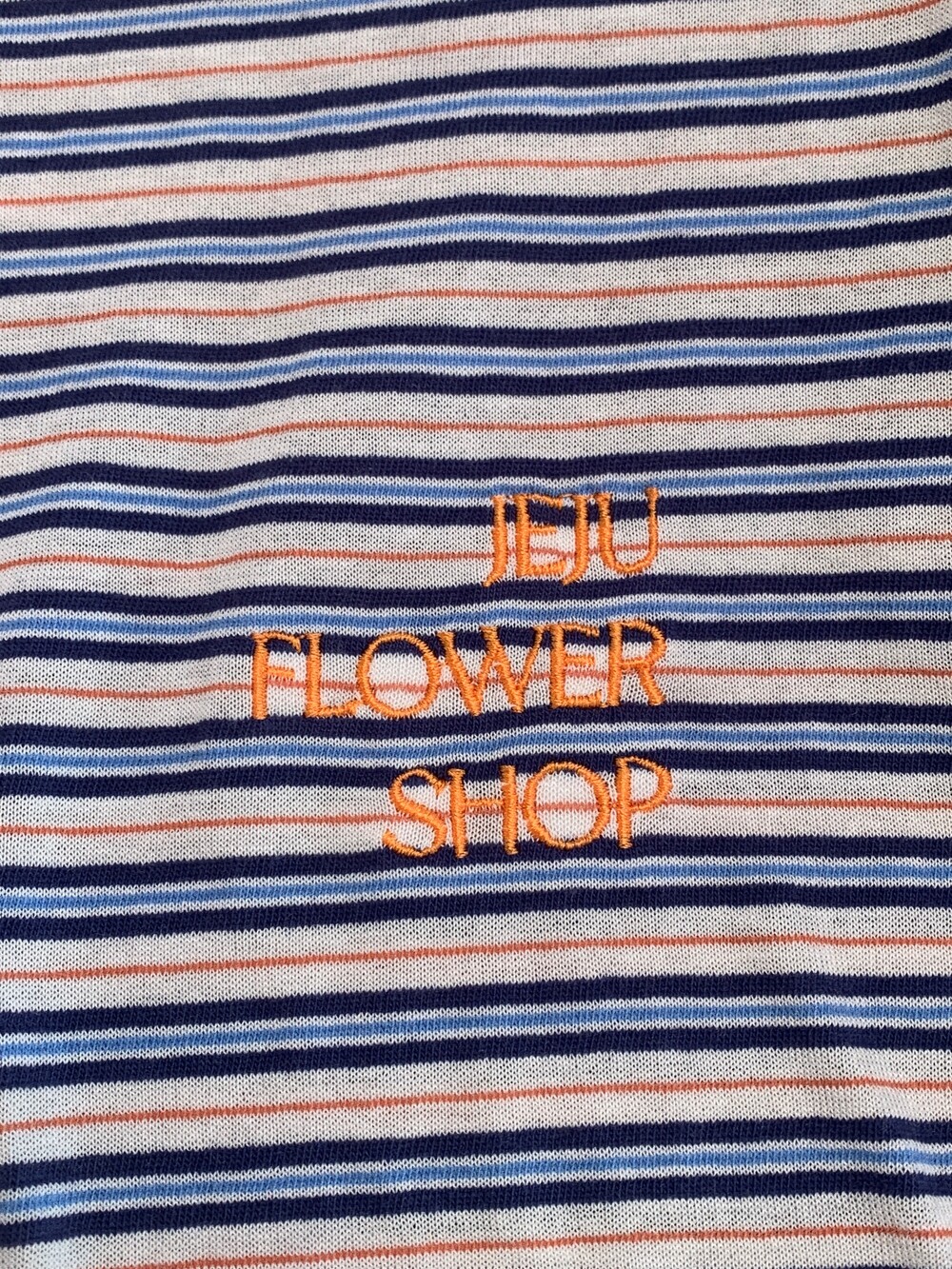가슴 부분에는 JEJU FLOWER SHOP 오렌지 자수로 그꽃의 무드를 더해주었습니다.
