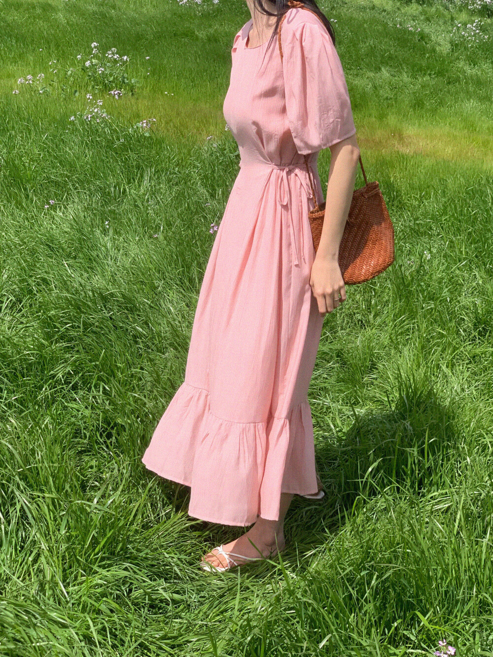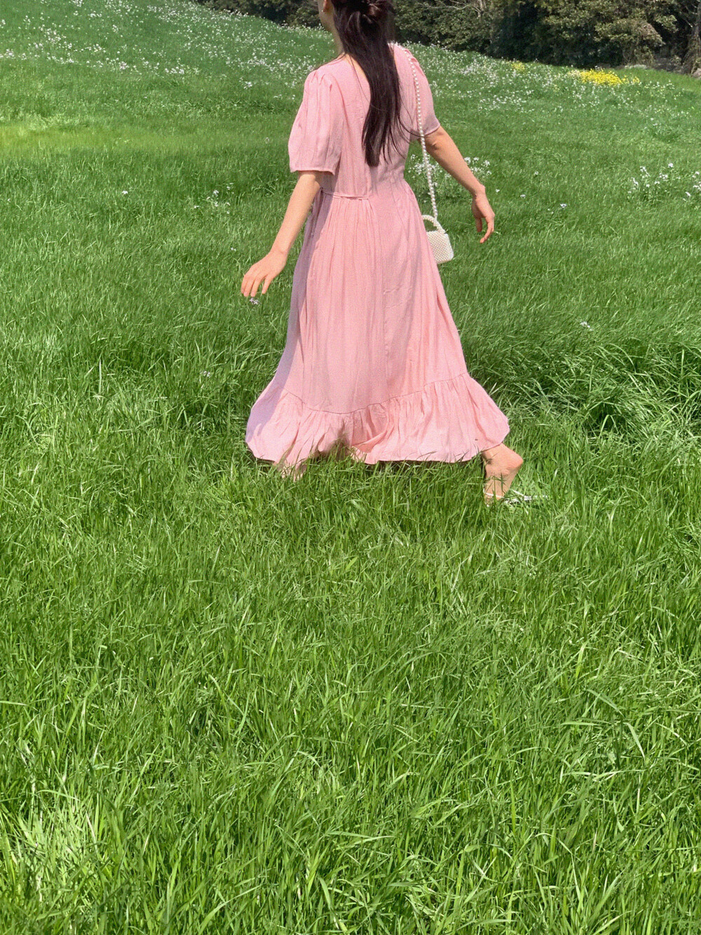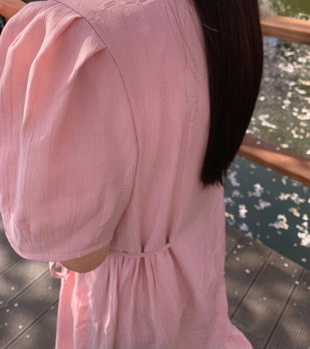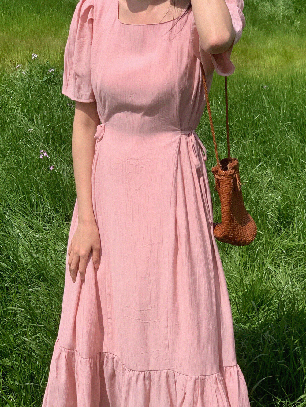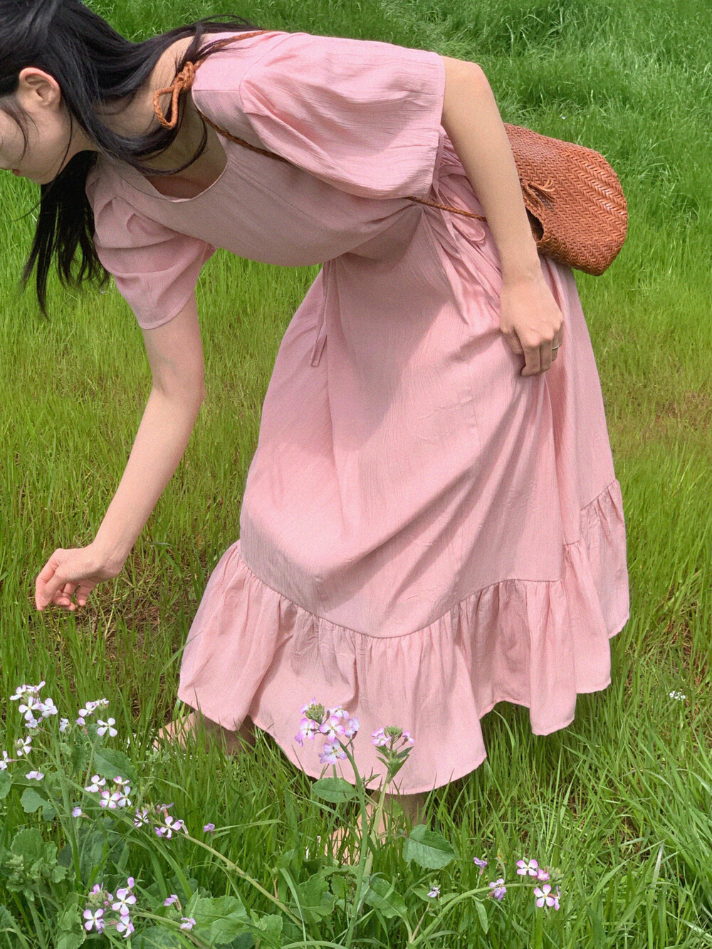 스퀘어 네크라인과 퍼프소매, 아랫단의 프릴이 옷의 무드를 사랑스럽게 만들어주었어요.