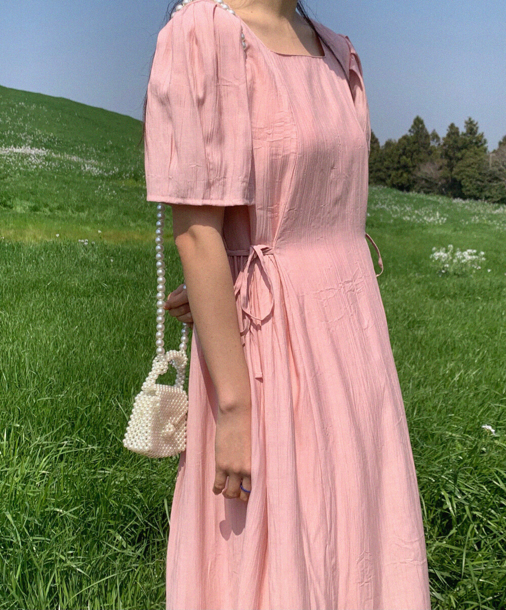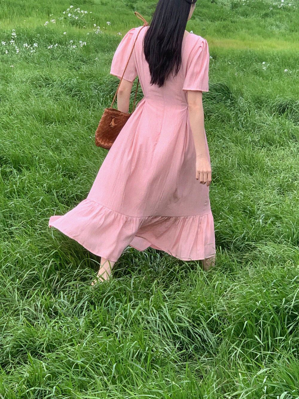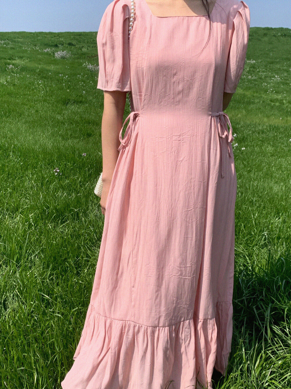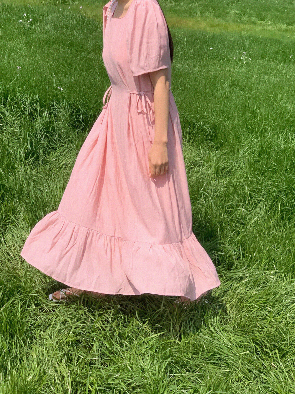 스퀘어 네크라인과 퍼프소매, 아랫단의 프릴이 옷의 무드를 사랑스럽게 만들어주었어요.