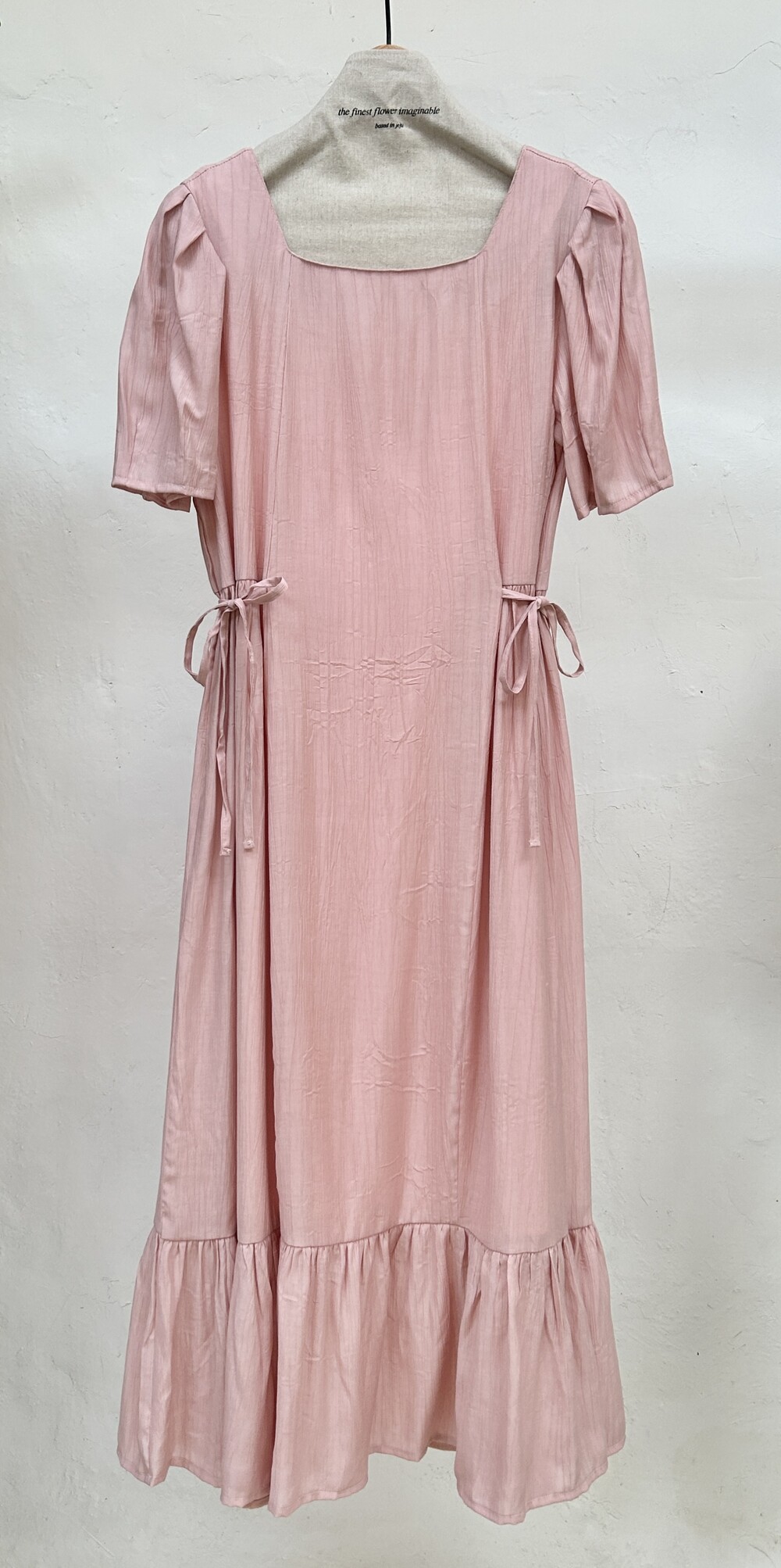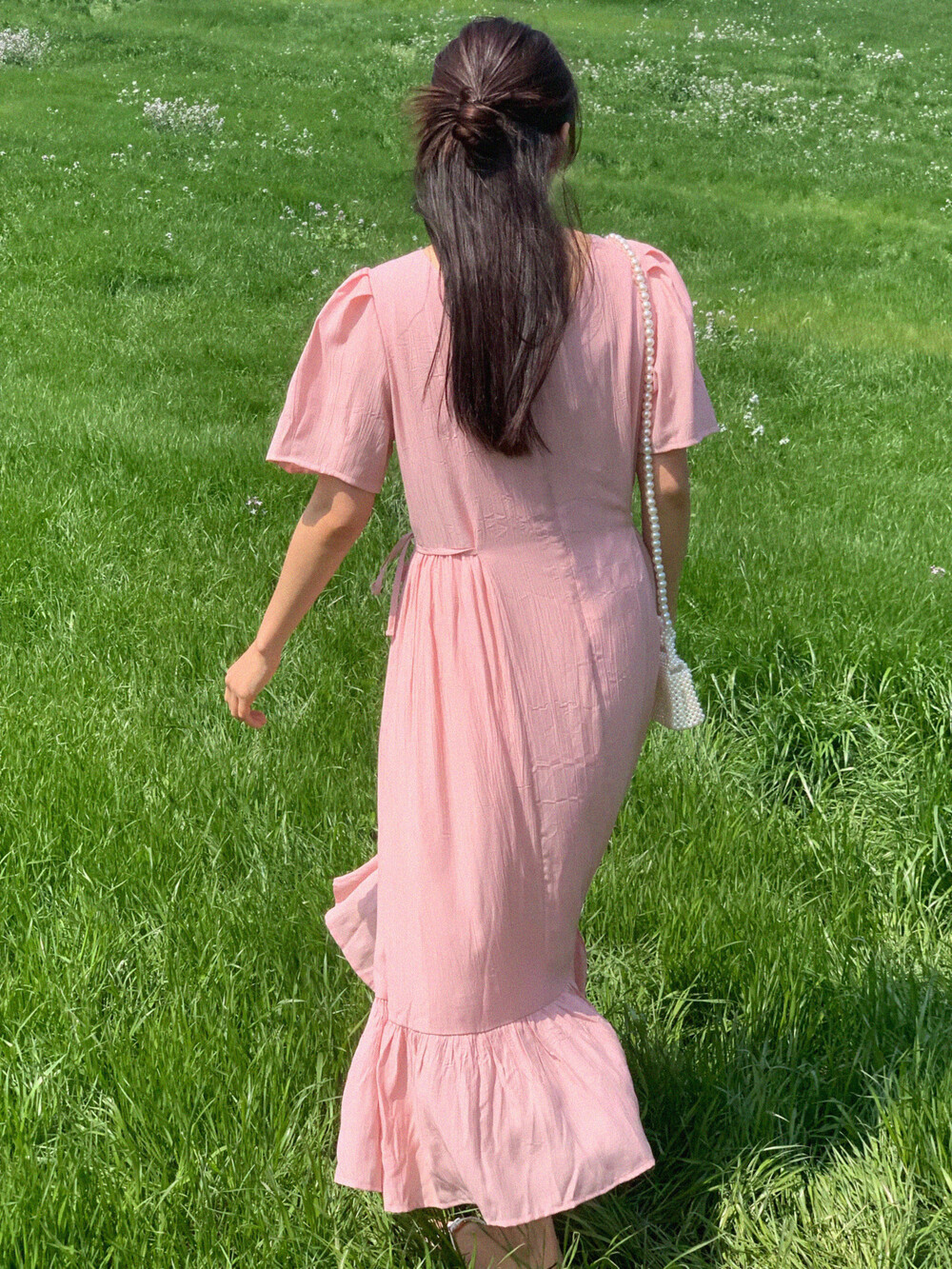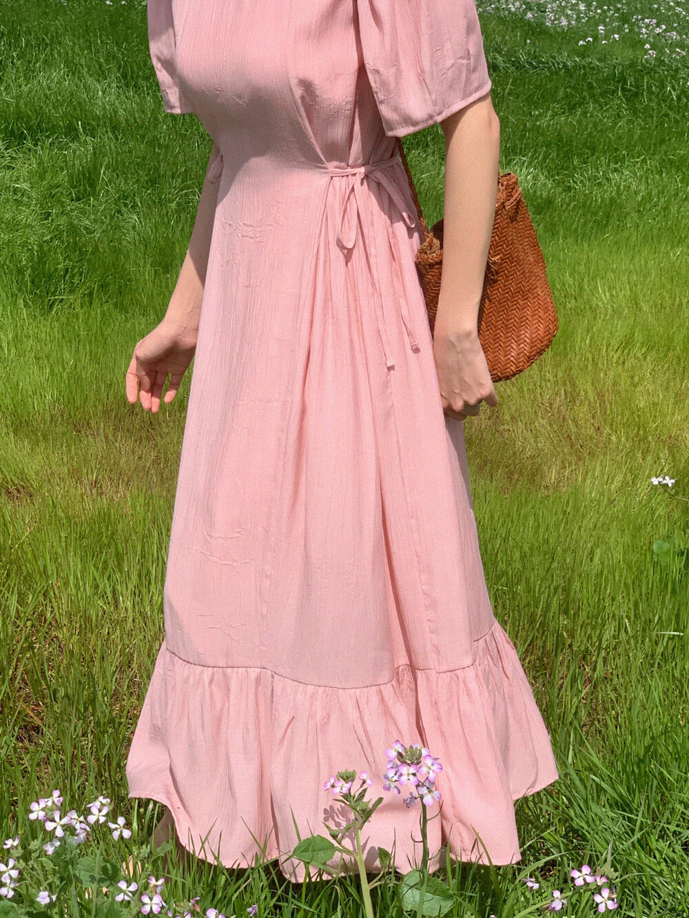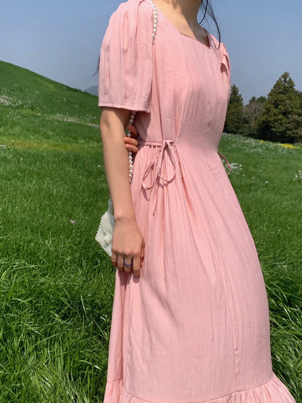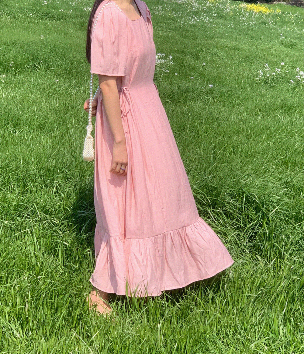 스퀘어 네크라인과 퍼프소매, 아랫단의 프릴이 옷의 무드를 사랑스럽게 만들어주었어요.