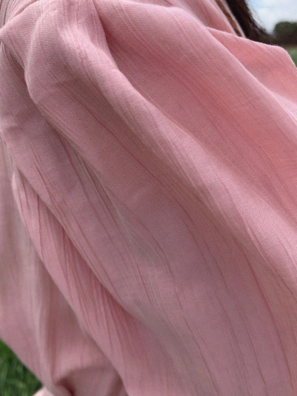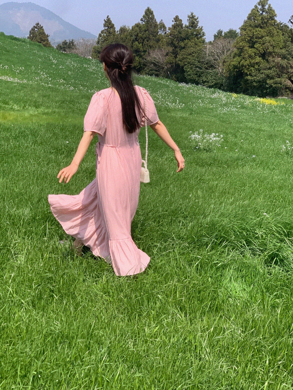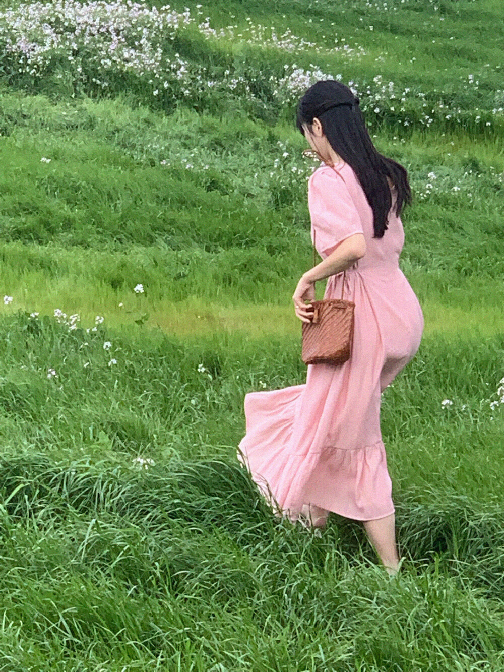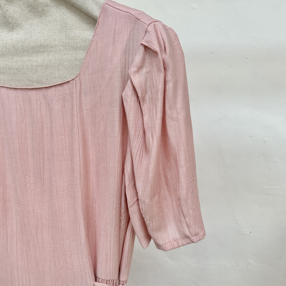 스퀘어 네크라인과 퍼프소매, 아랫단의 프릴이 옷의 무드를 사랑스럽게 만들어주었어요.