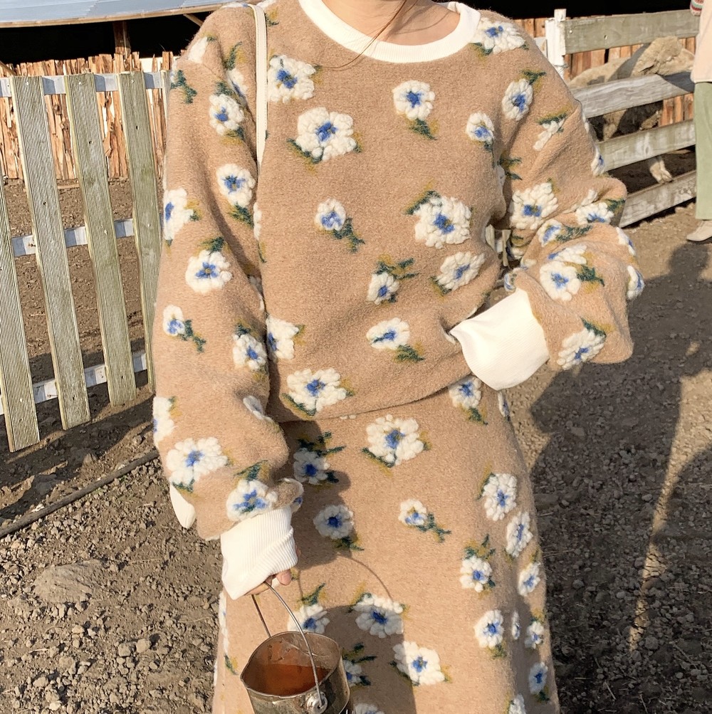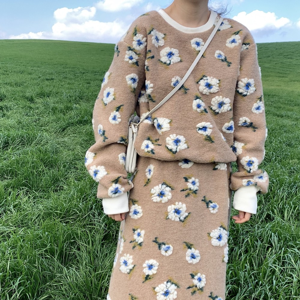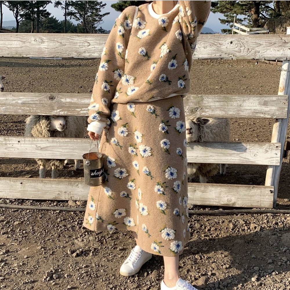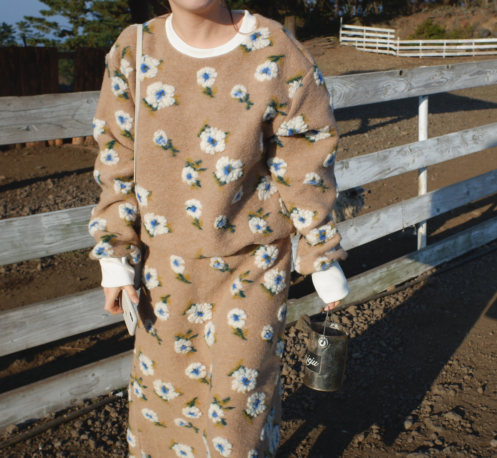 스웻셔츠와 A라인 스커트 셋업으로 구성했구요