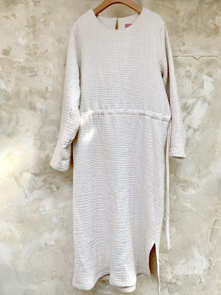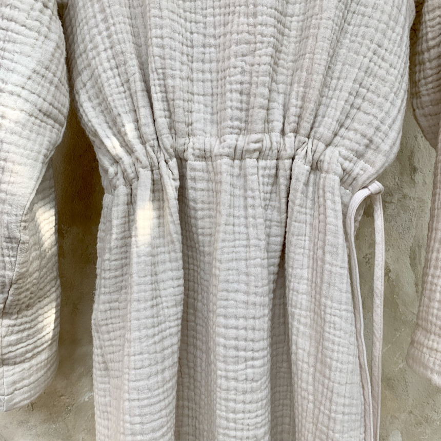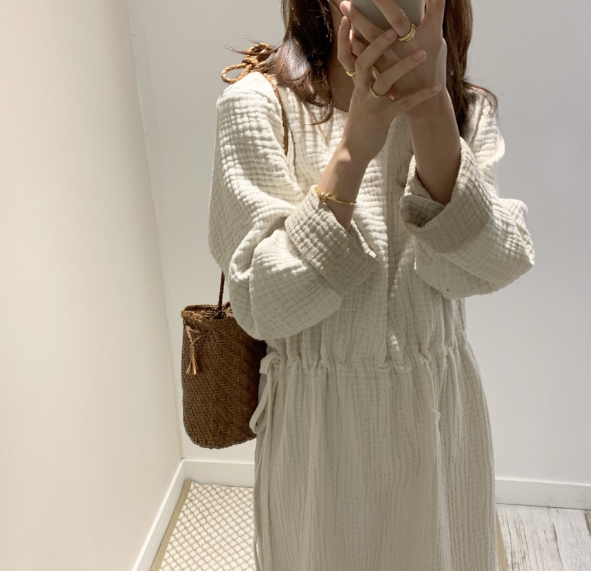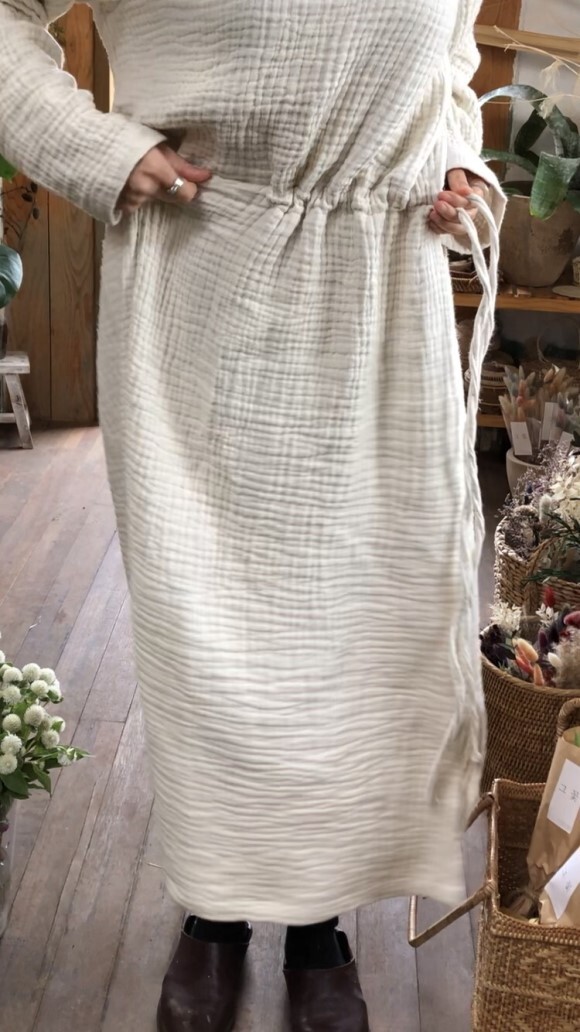 끈을 조이면서 허리부분에 주름을 넣어 입는원피스입니다.
