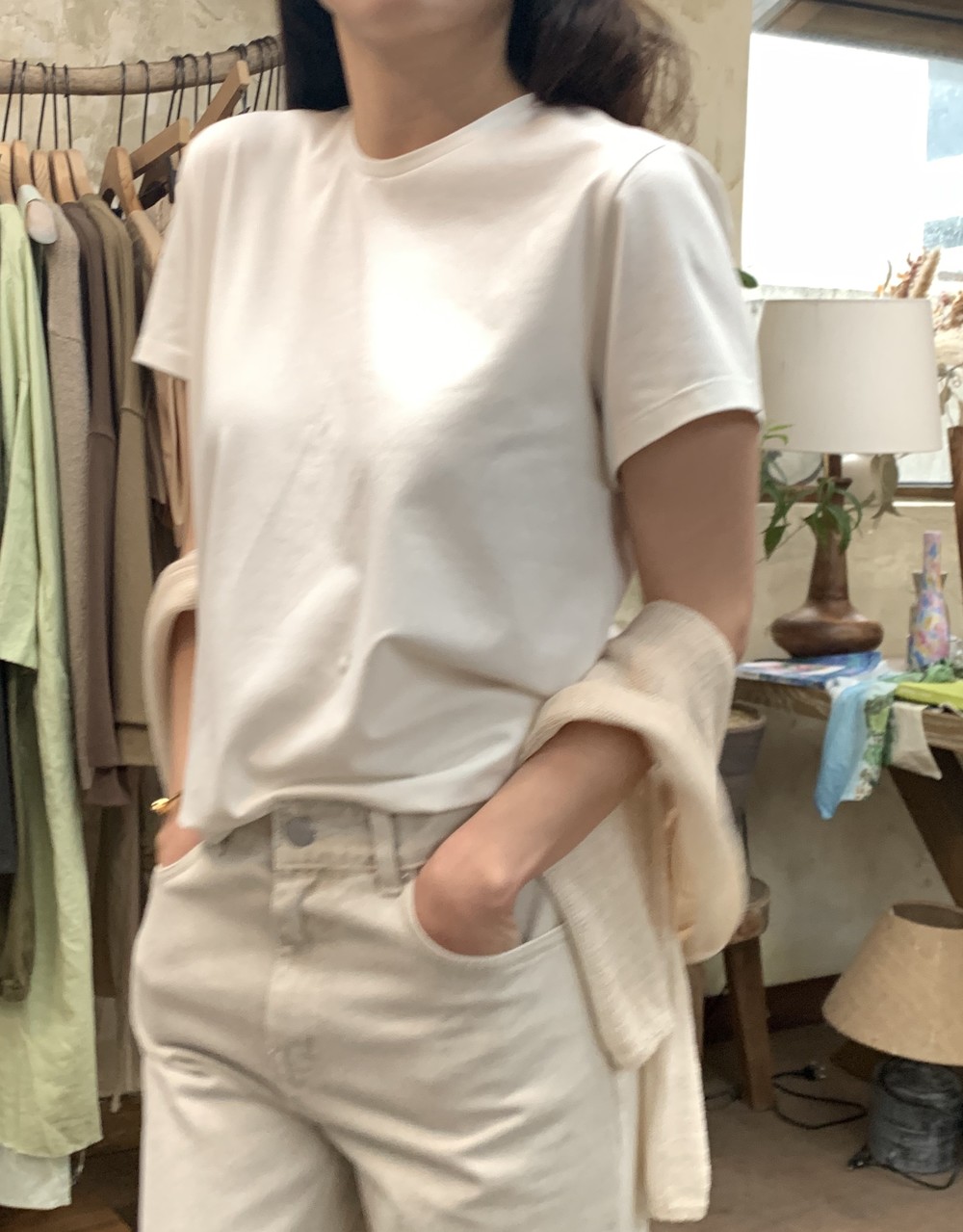 소재는 실켓면이고 바이오 워싱 된 코튼 스판이에요.