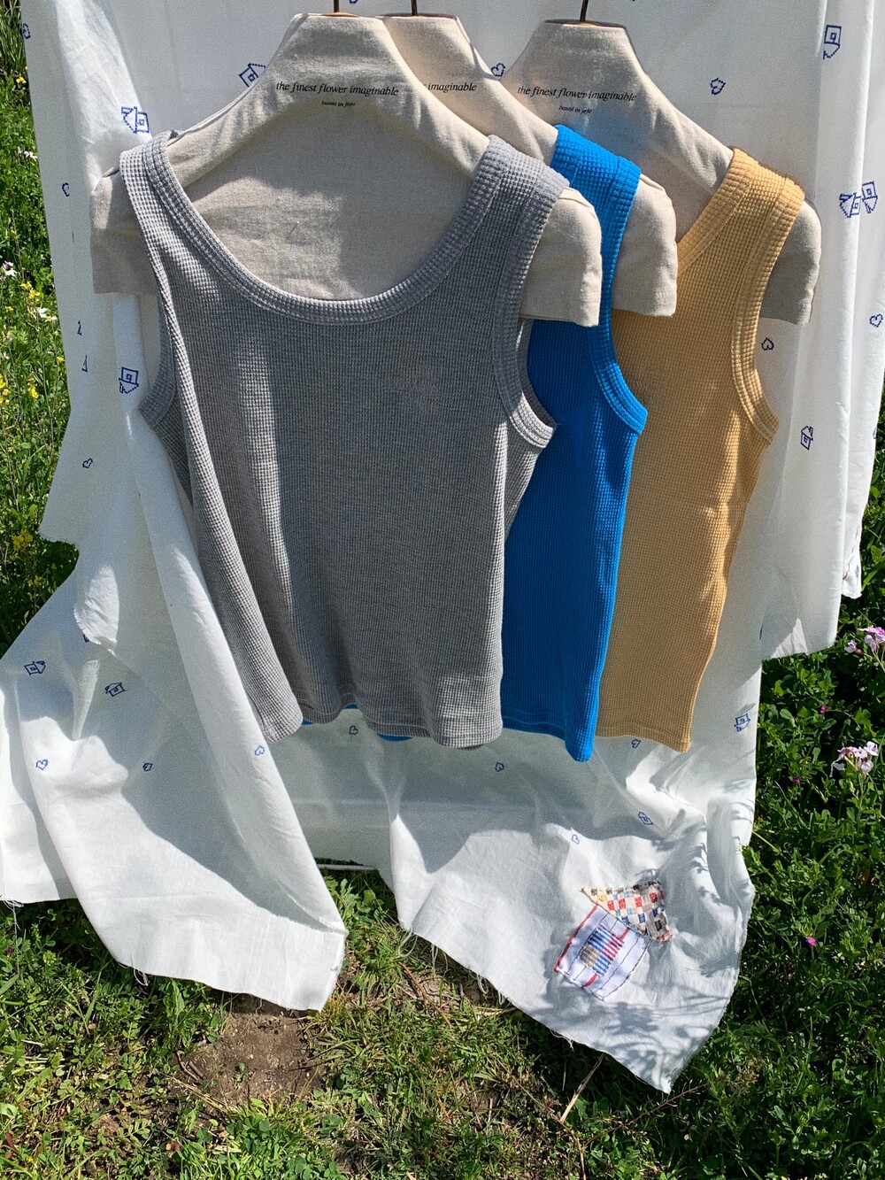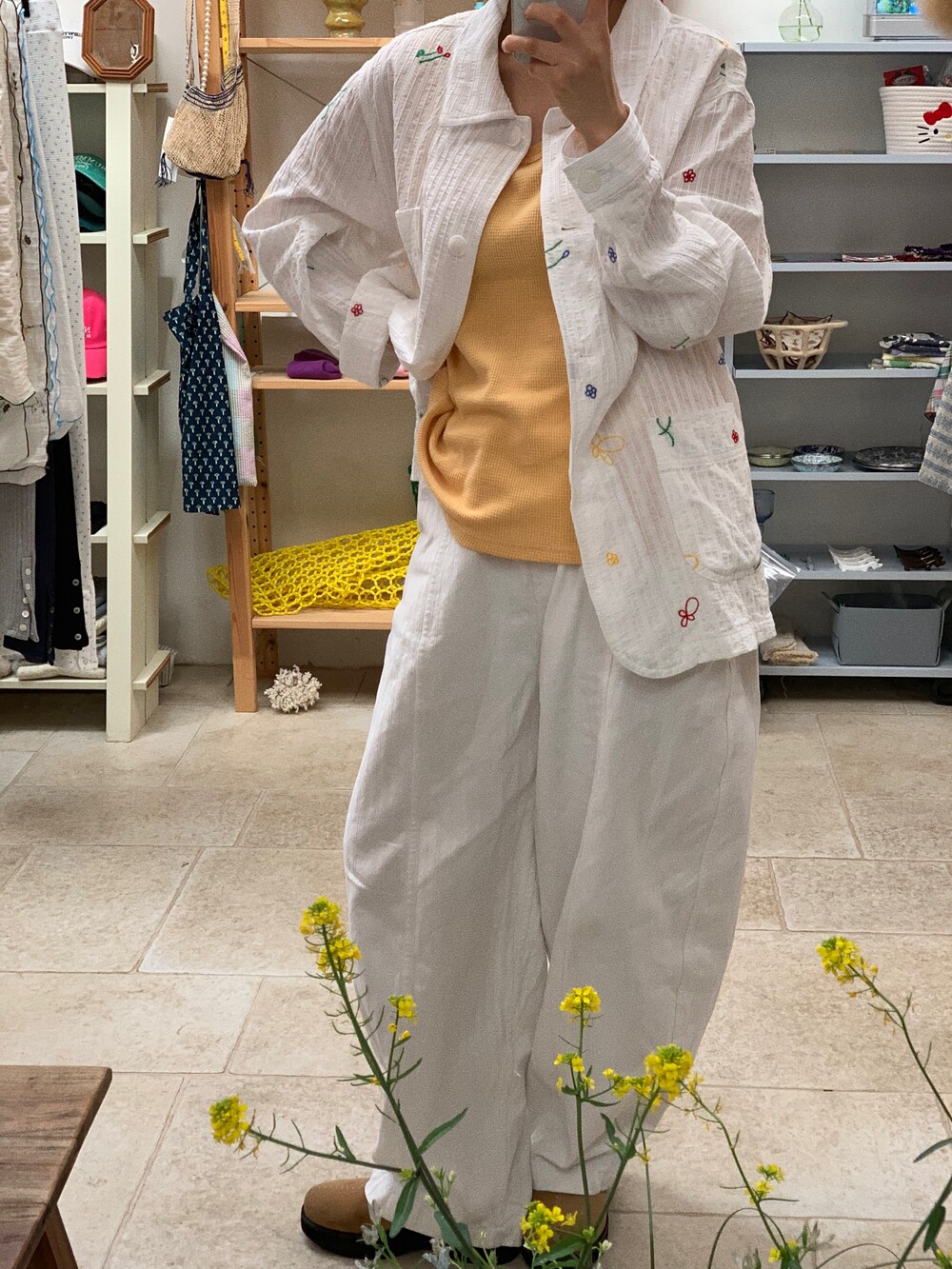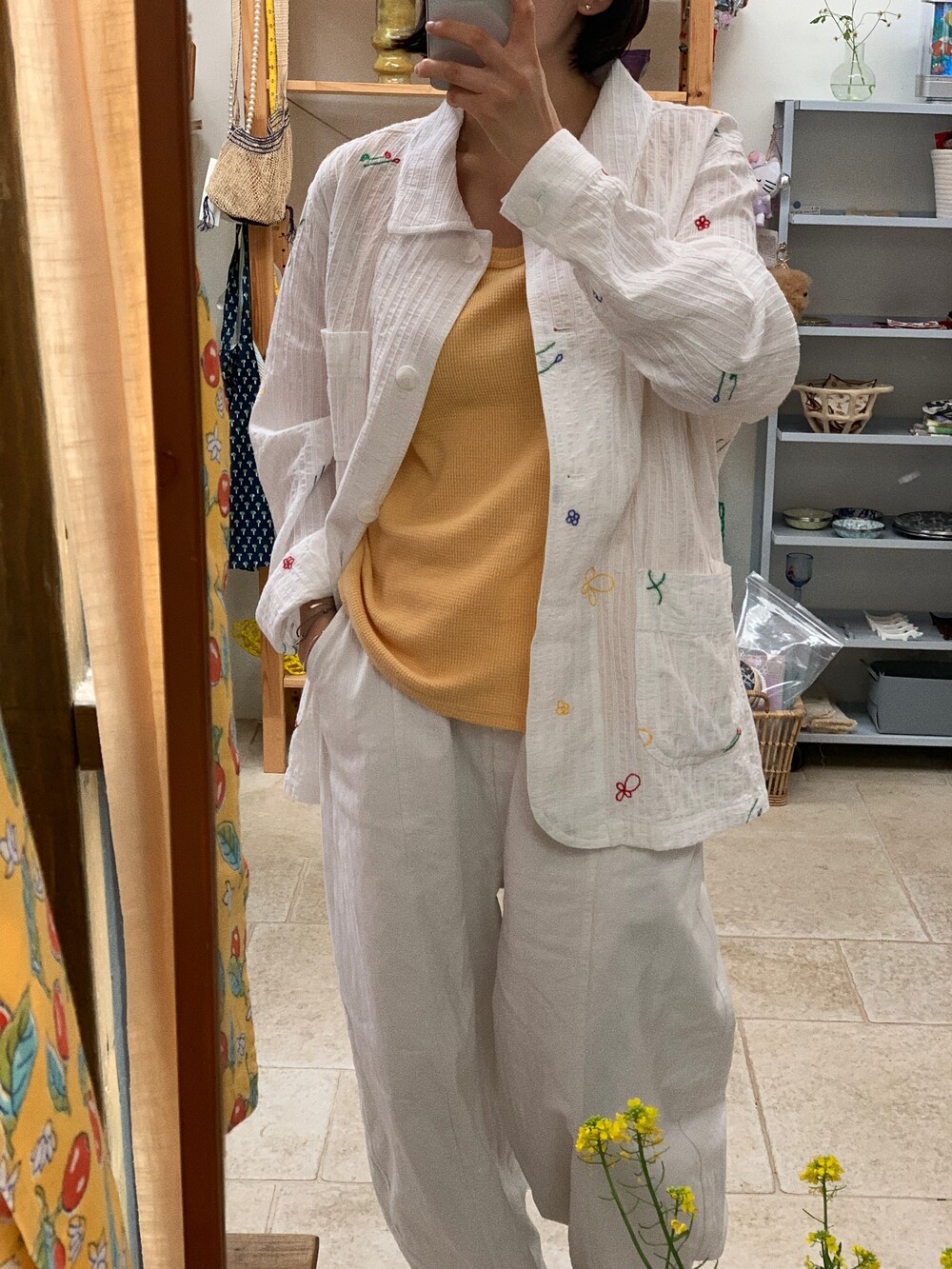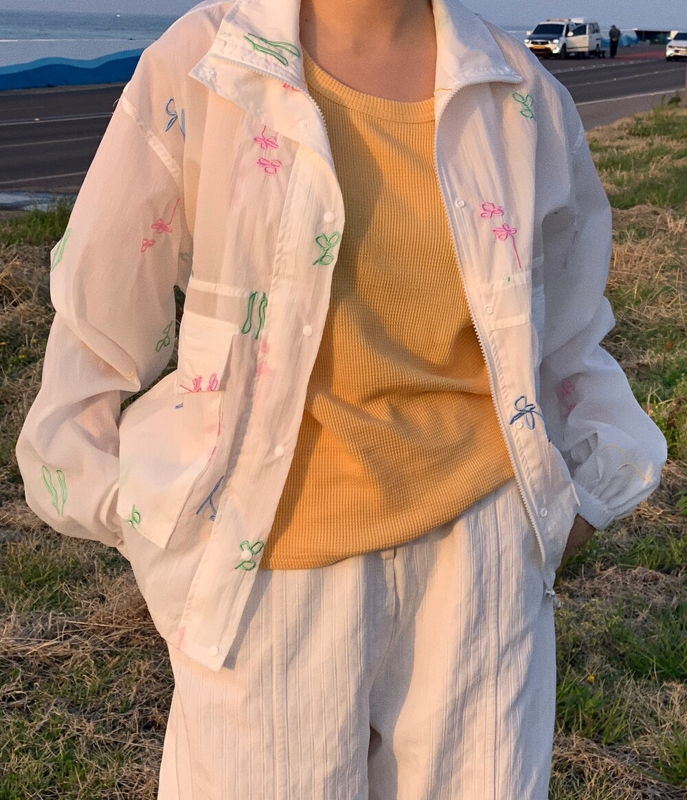 가슴 부분에는 JEJU FLOWER SHOP 톤온톤 자수로 그꽃의 무드를 더해주었습니다.