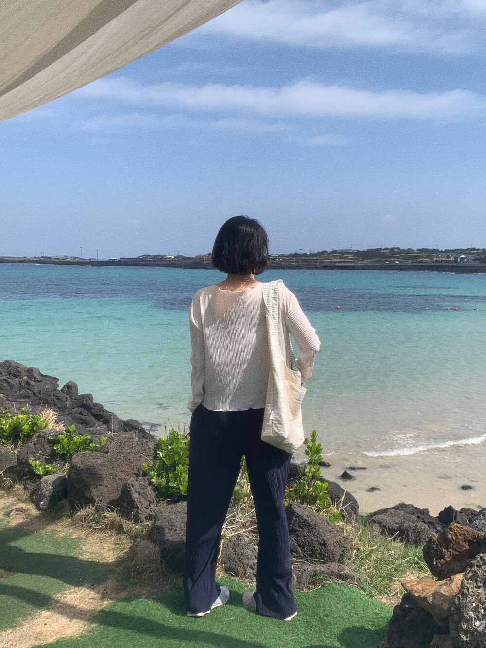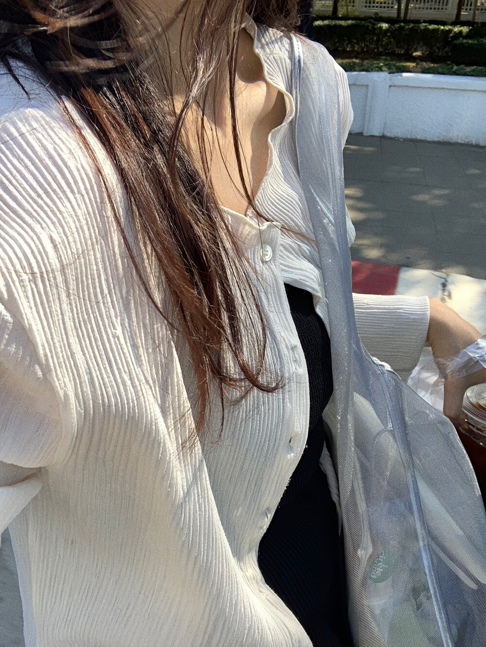 가디건으로도 단독 탑으로도 입을 수 있어요 - 자개 버튼이 있어서 전체 여밈이 가능하구요.